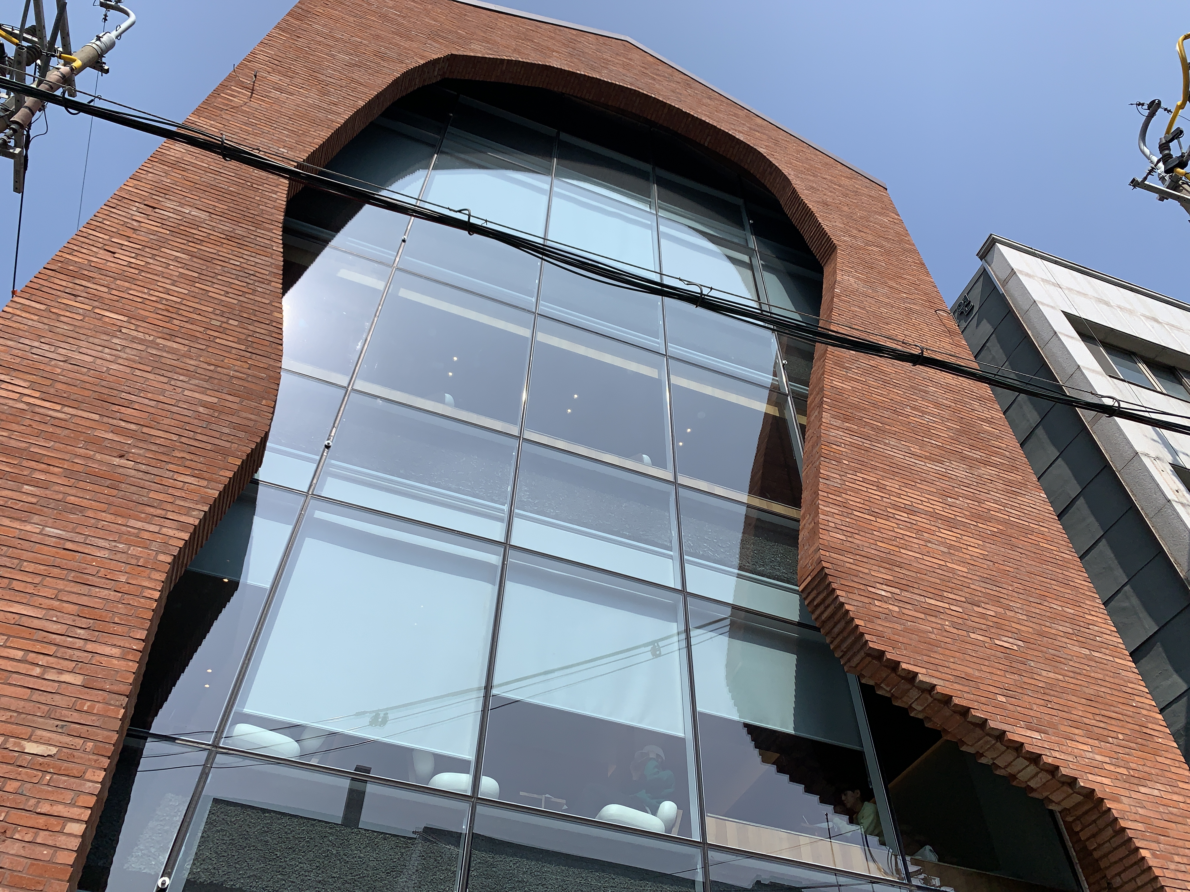 벽돌과 전면 통유리가 눈에 띄는 디자인입니다.