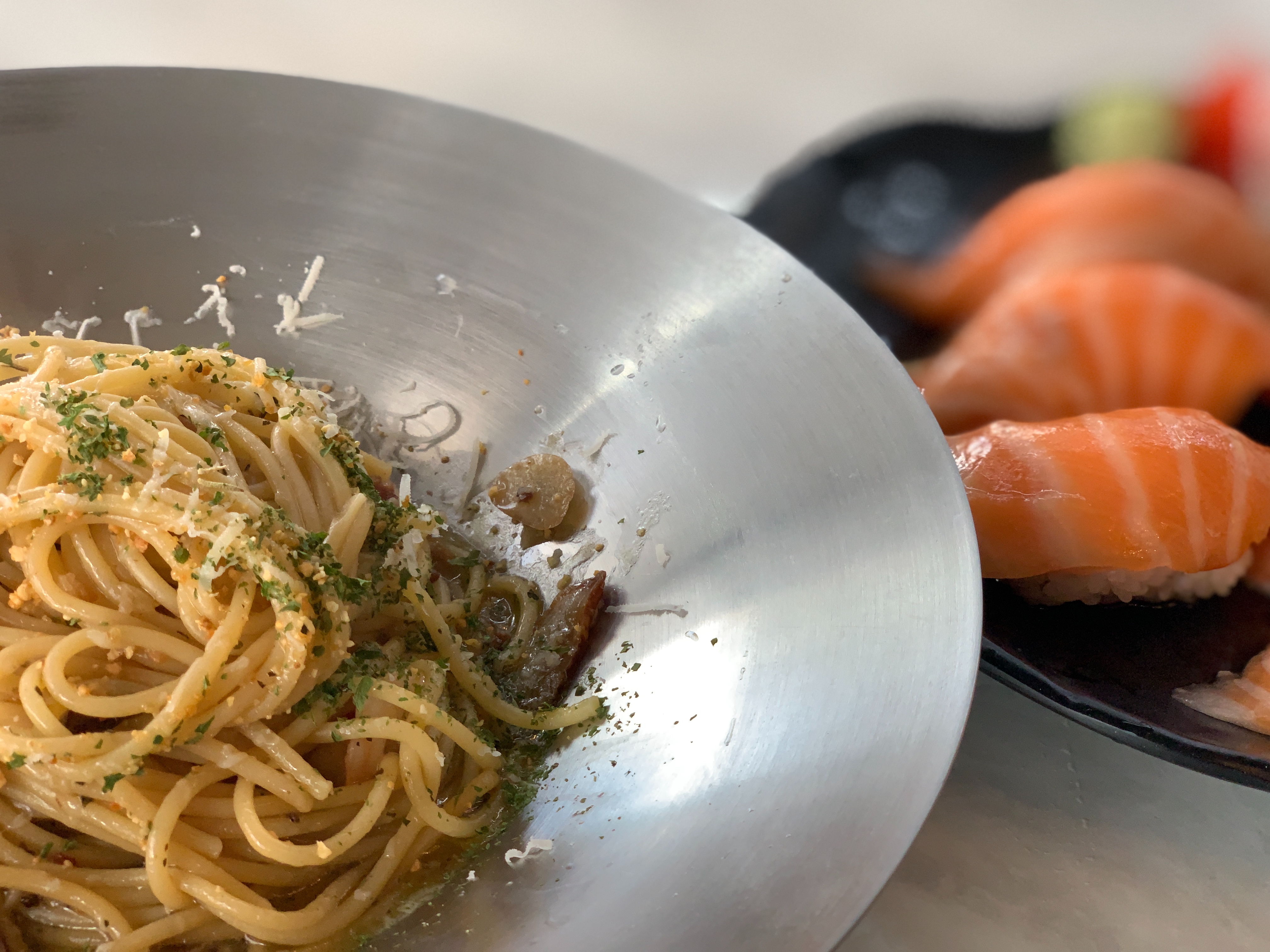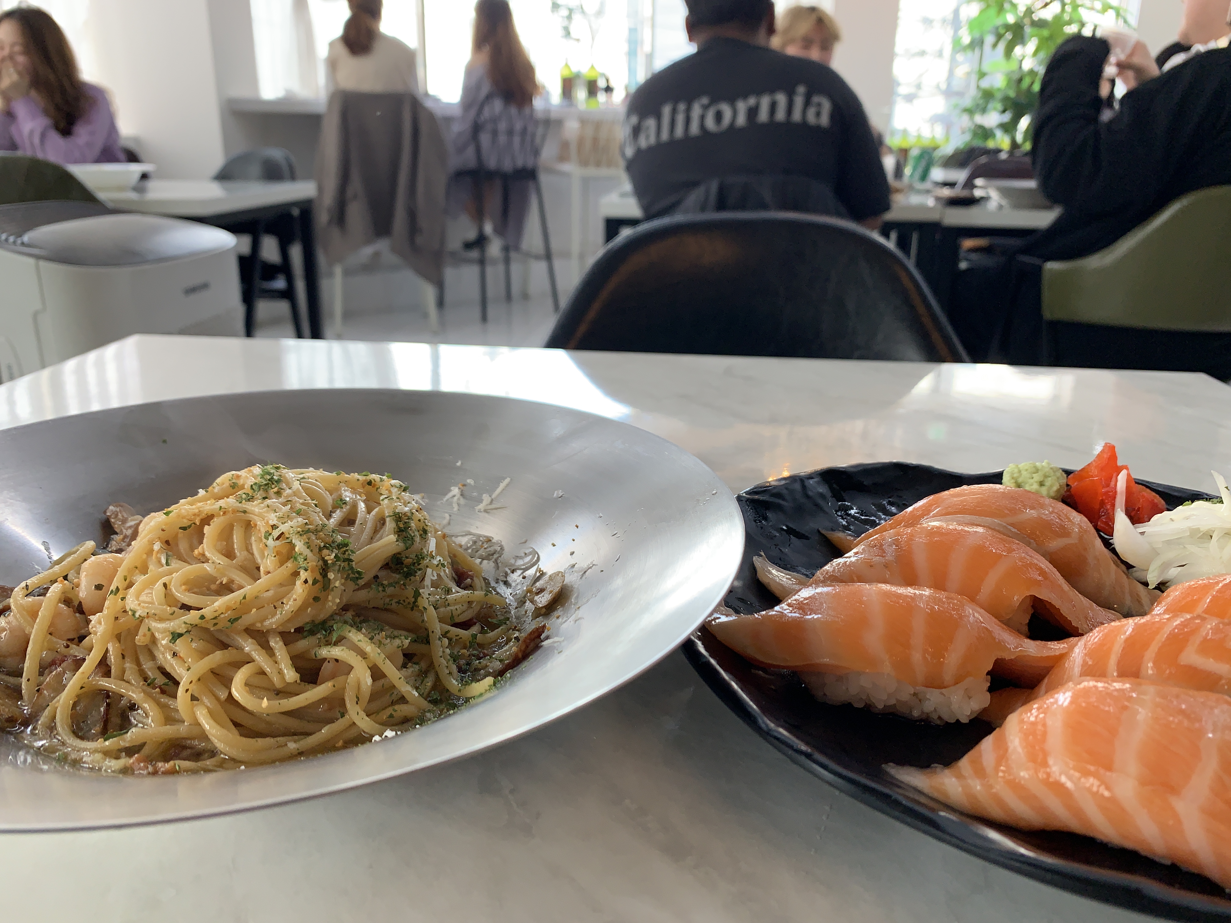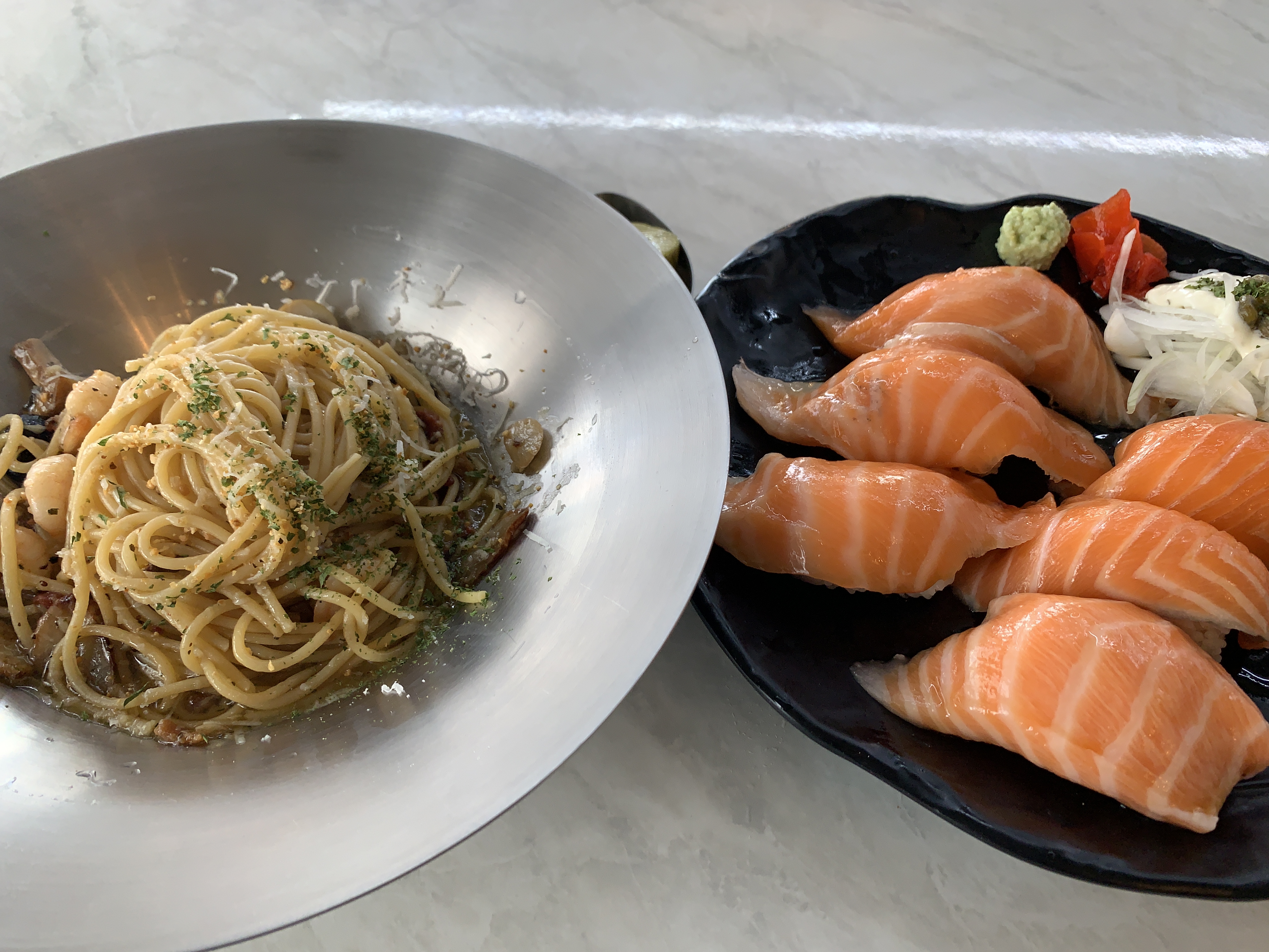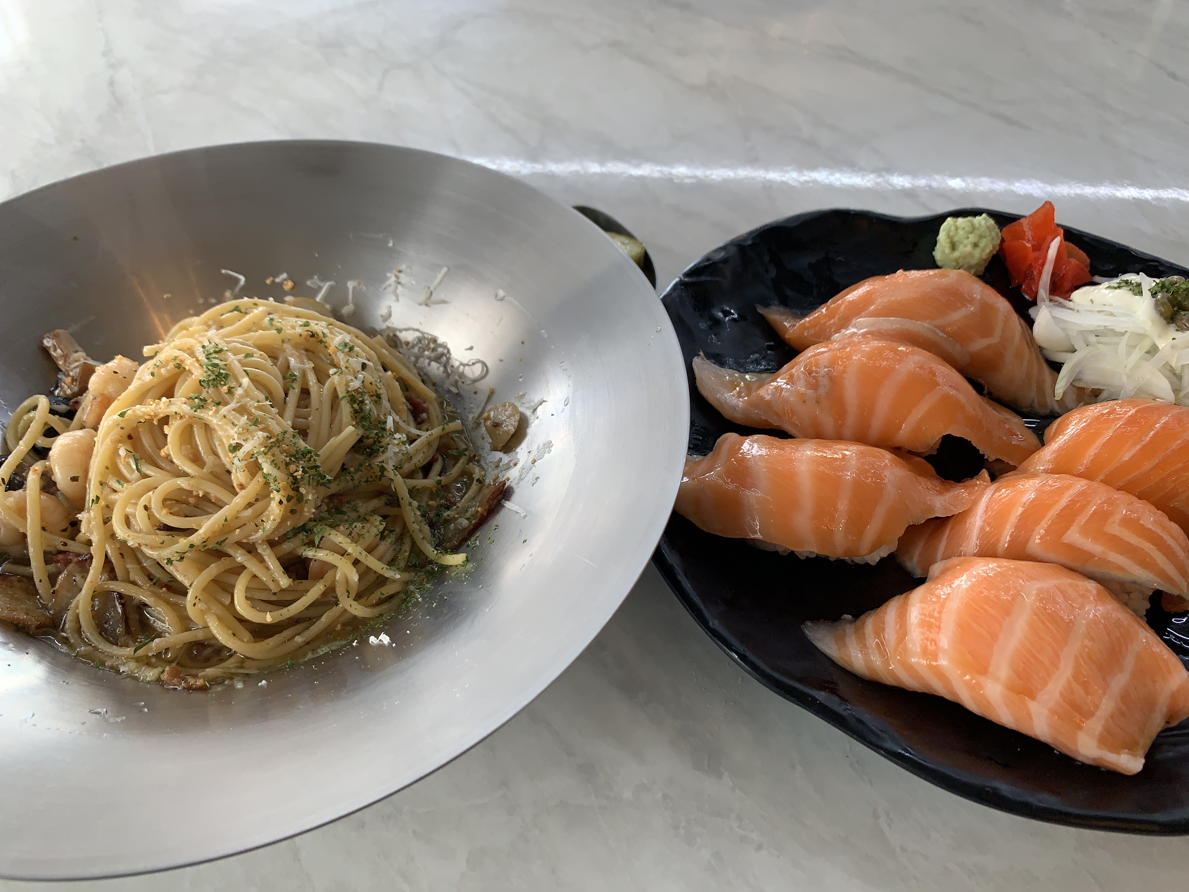 여기는 연어초밥으로 유명한 곳인데 파스타 세트메뉴가 있어서 같이 시켜봤습니다 ㅎㅎ