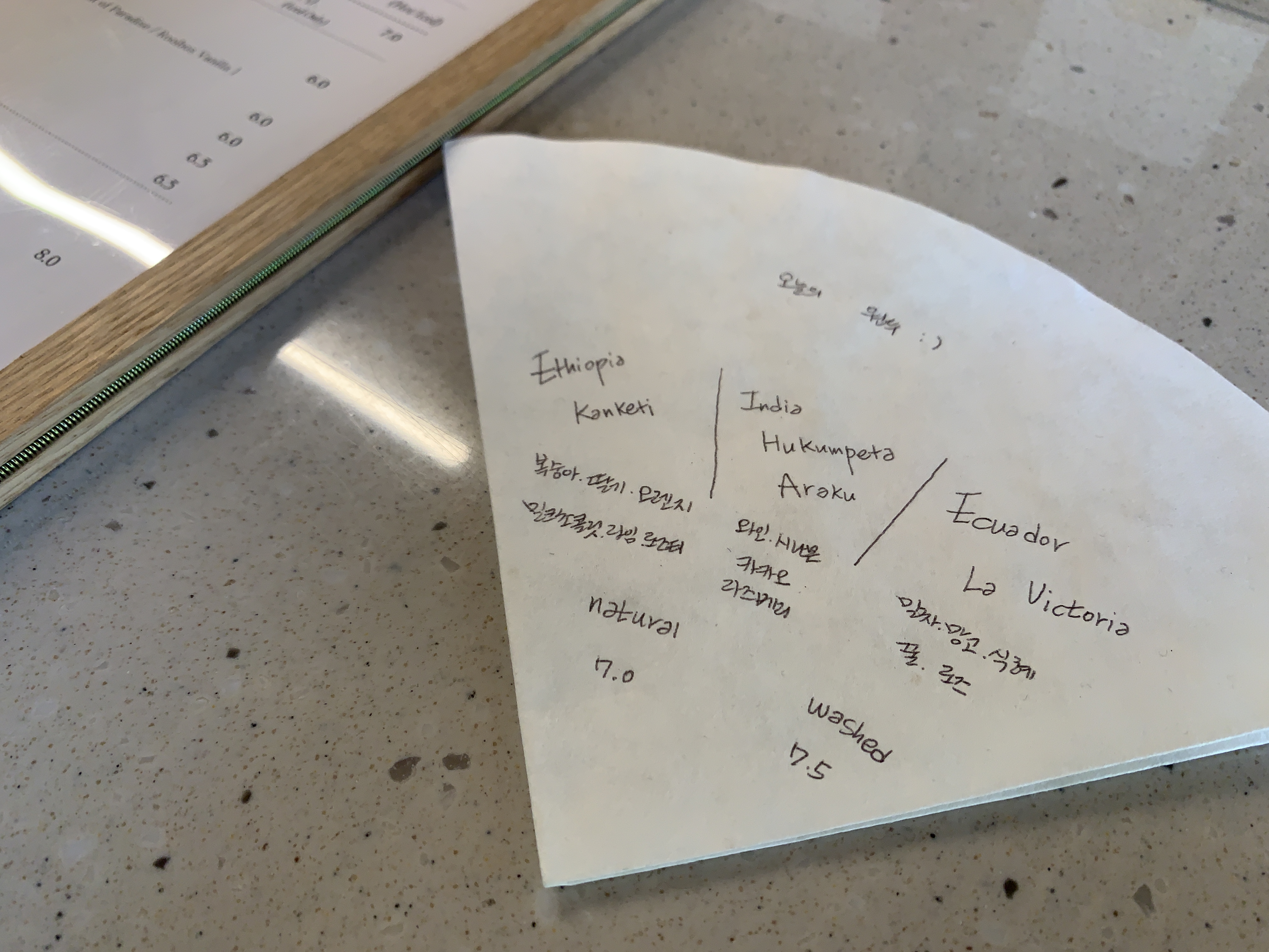 커피 원두에 대한 설명을 이렇게 드립 종이에 적어뒀는데 이것도 상당히 감각적이고 이쁘다.
