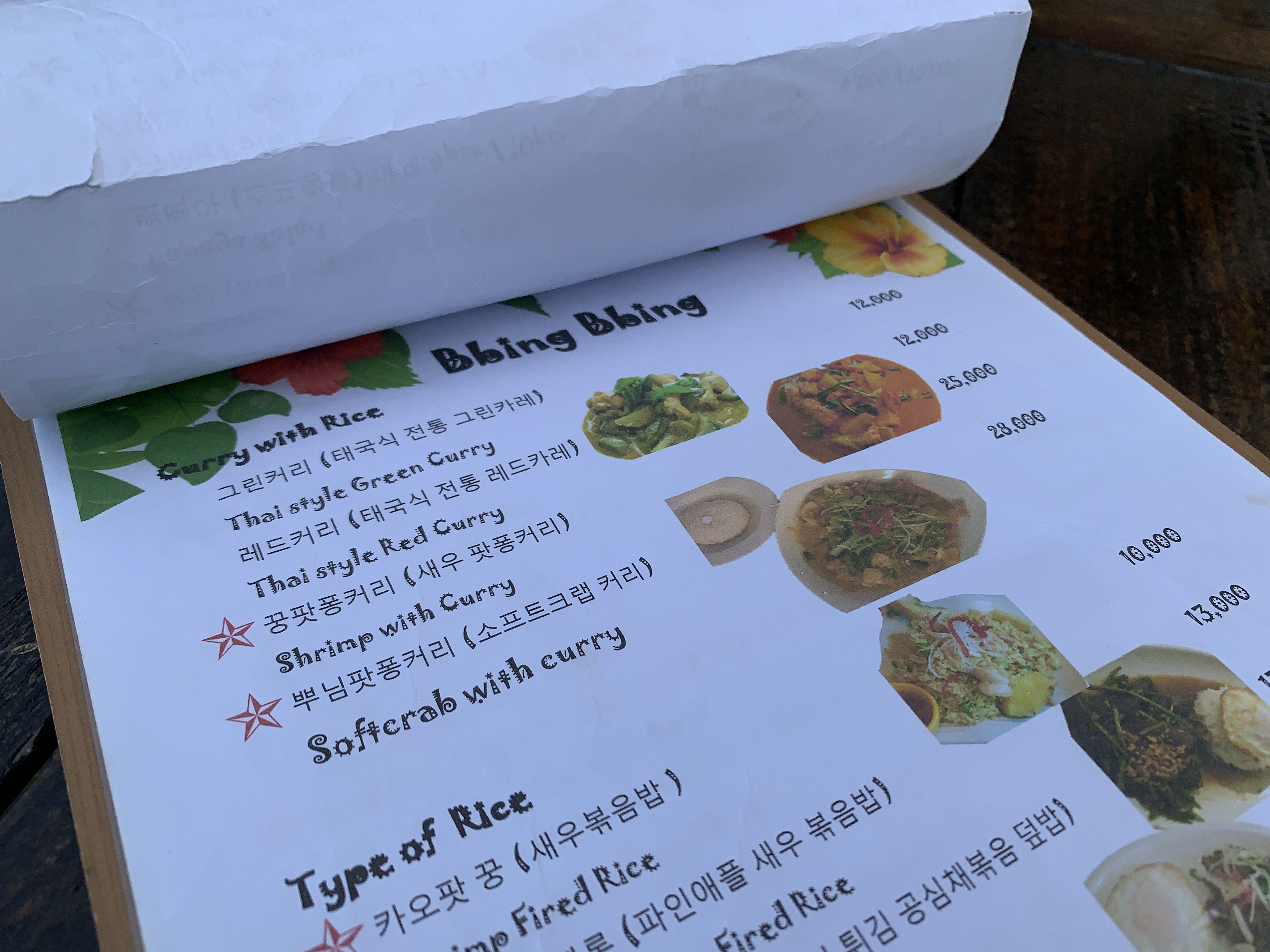 나는 태국 음식점에 오면 무조건 풋팟뽕커리와 팟타이 혹은 볶음밥을 시킨다. 뭐 음식은 취향에 따라 시키면 되지만 가격이 조금 비싸더라도 풋팟뽕 커리는 시키는 걸 추천 !!! 그래야 완벽한 태국 여행 느낌이 난다.
