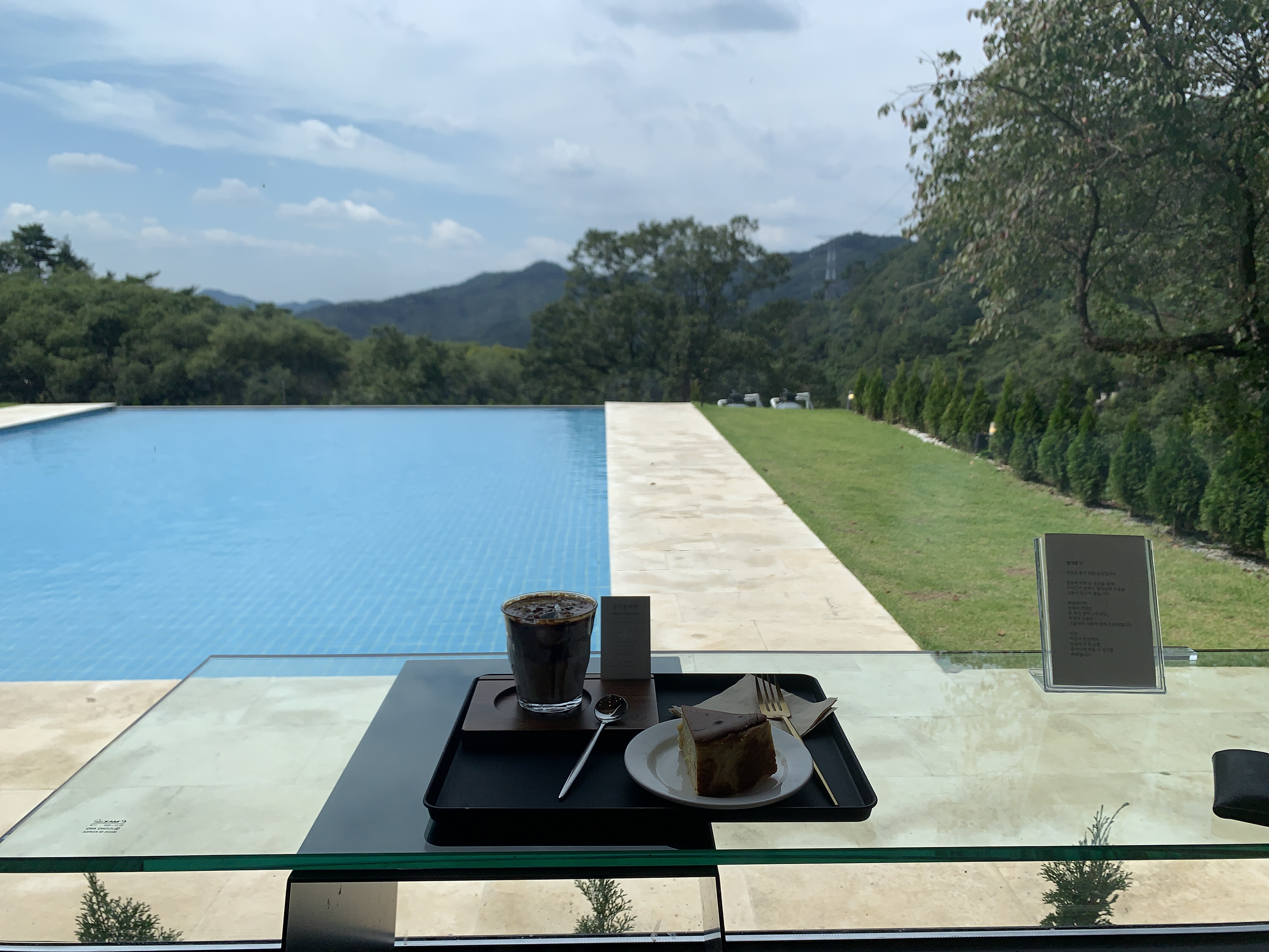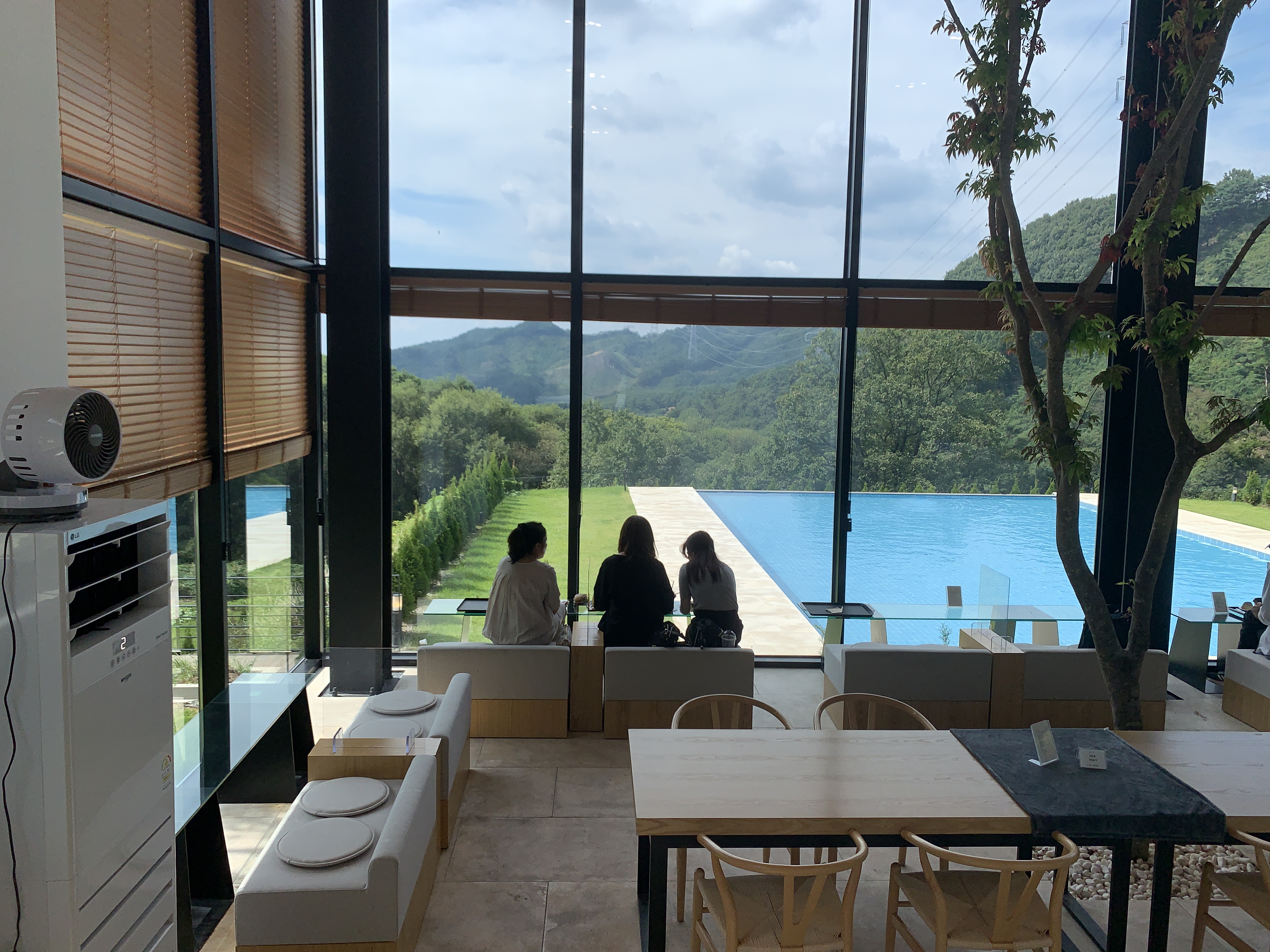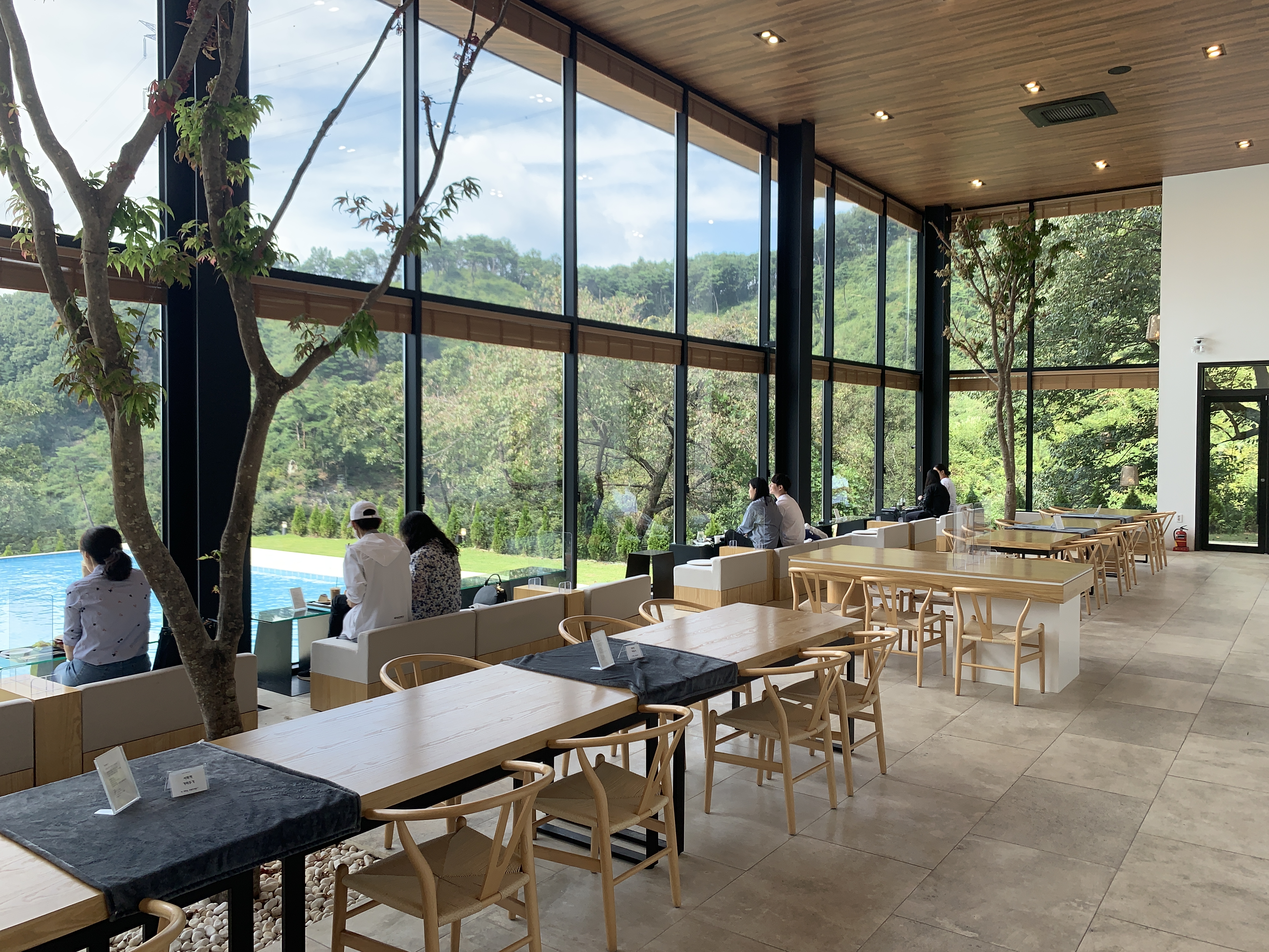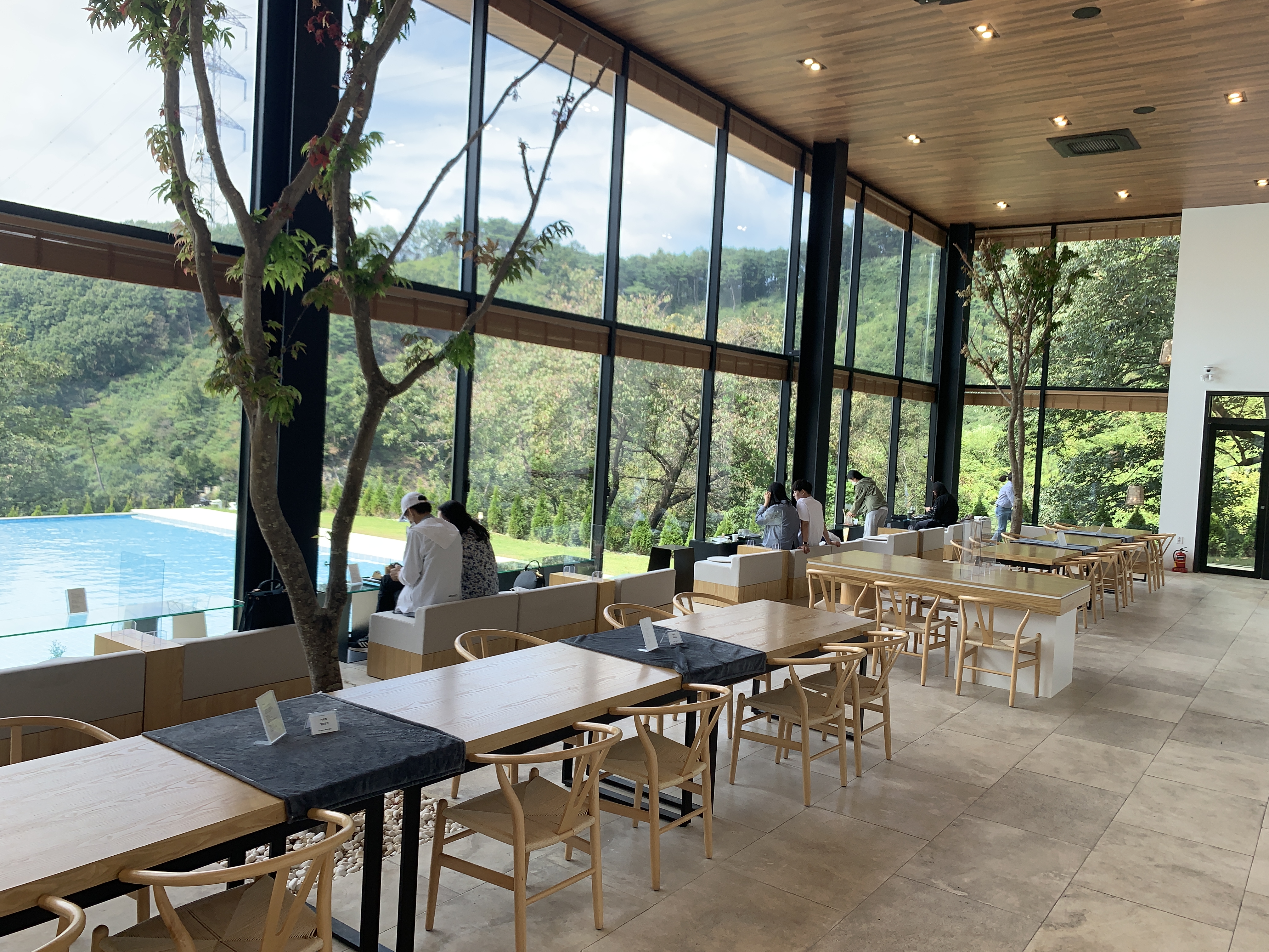 카페 전면이 통유리로 되어 있어서 채광과 개방감이 좋고, 바로 앞에 산과 수영장뷰가 광활하게 펼쳐진다.