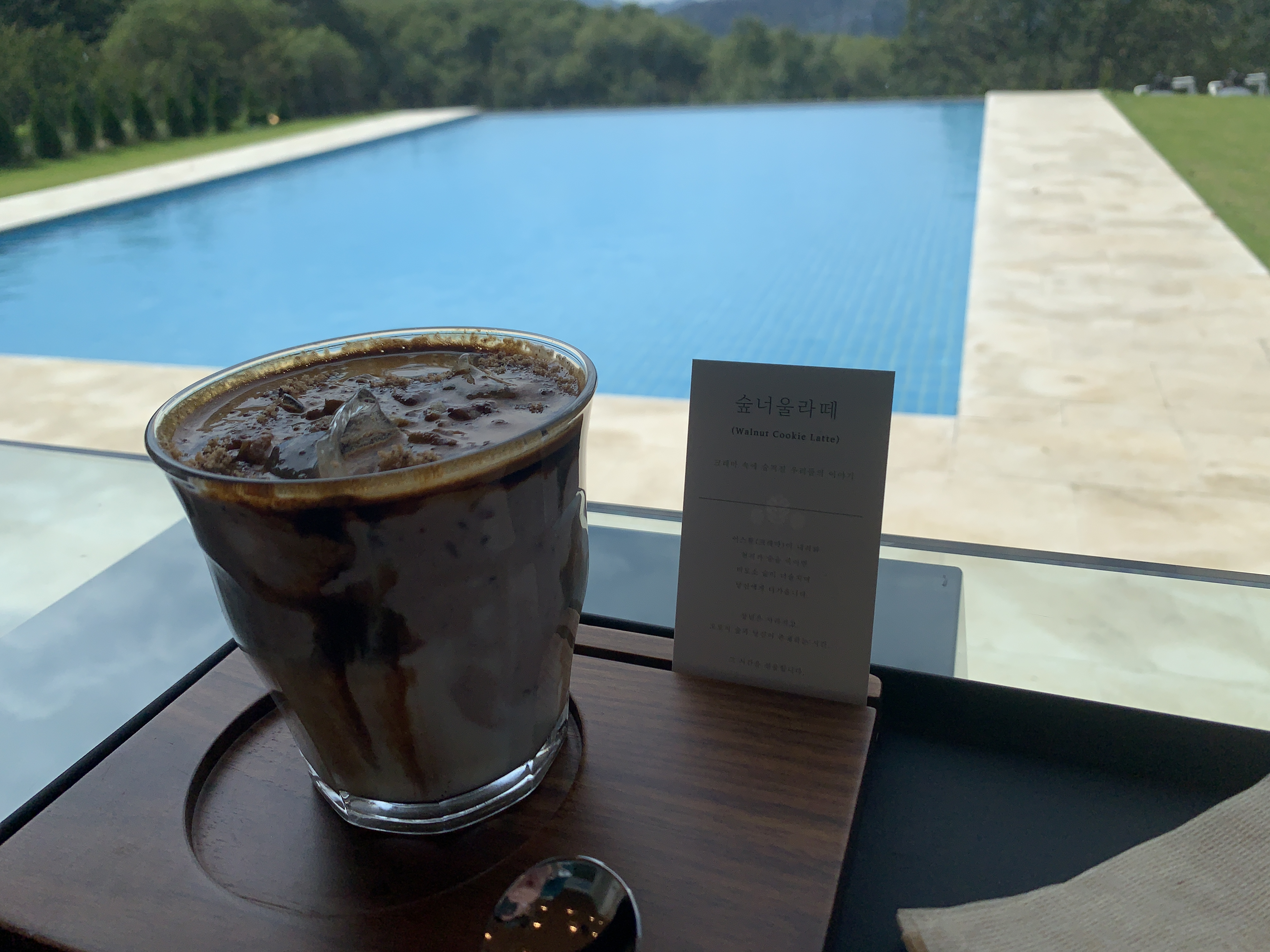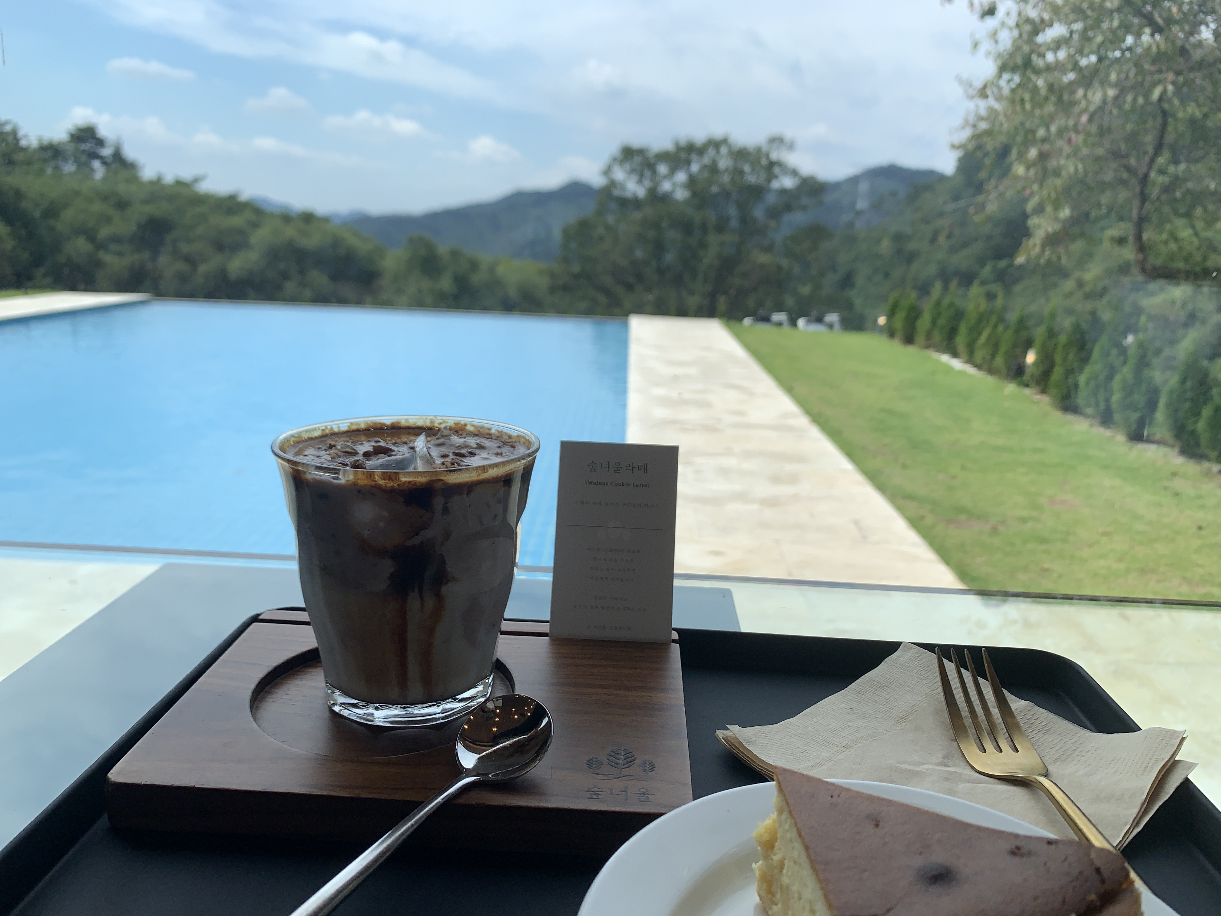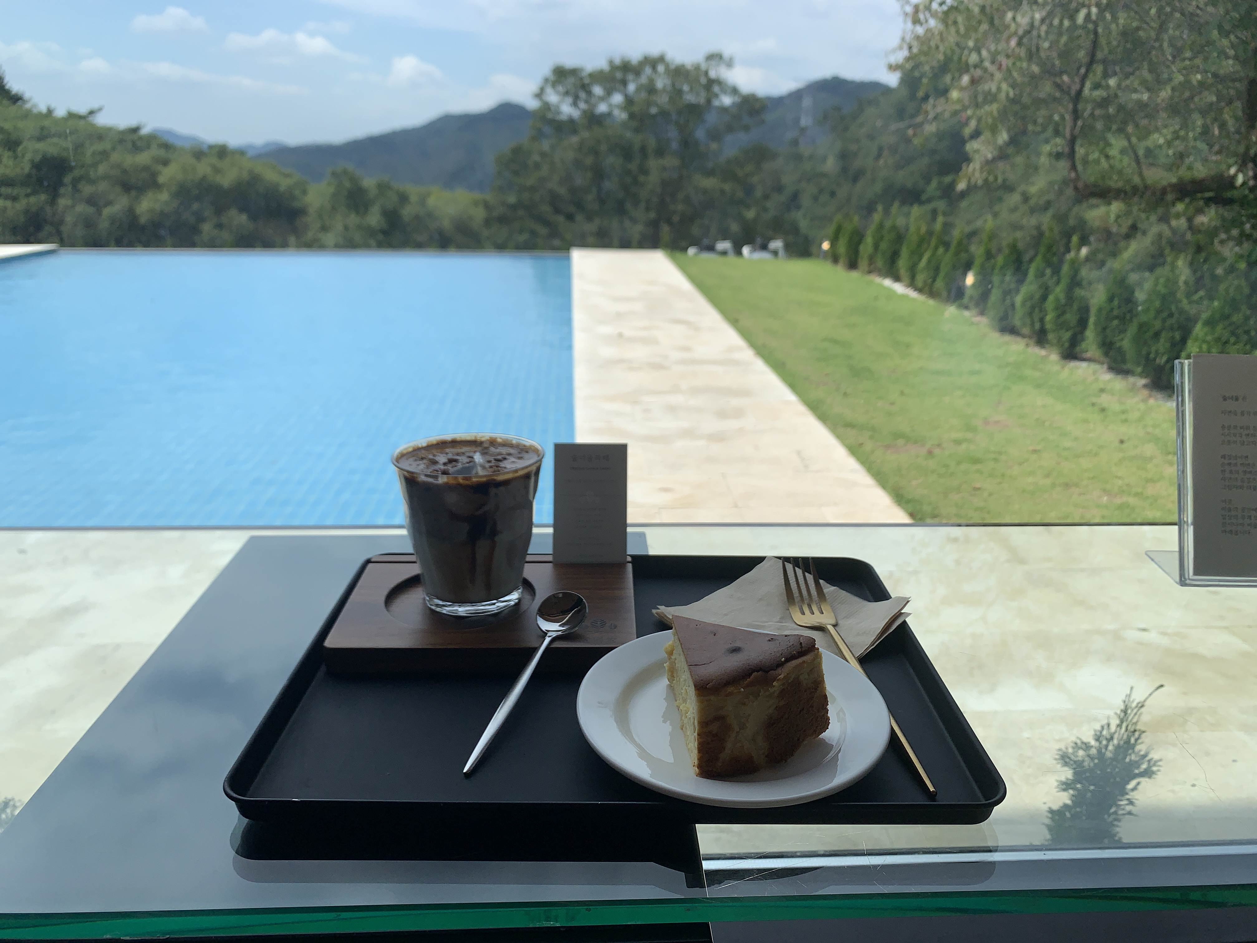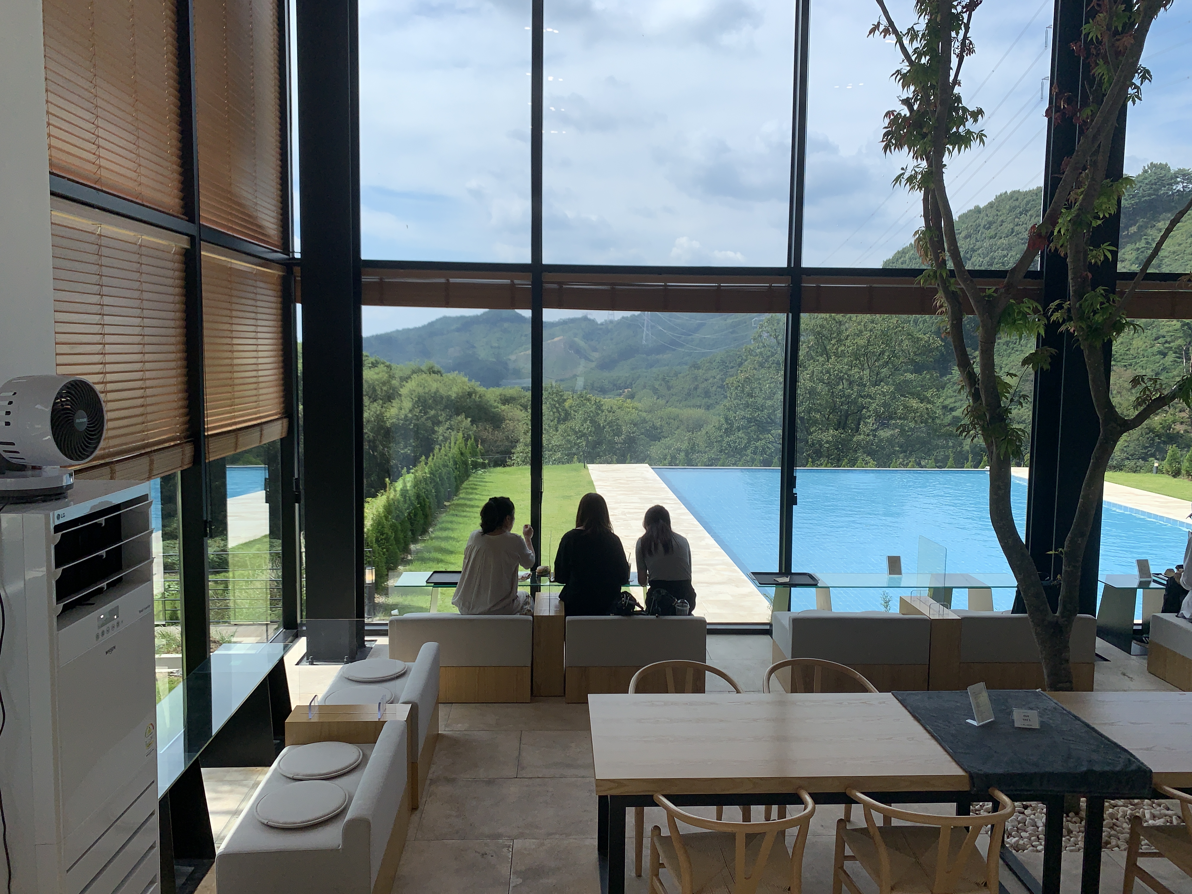 카페 전면이 통유리로 되어 있어서 채광과 개방감이 좋고, 바로 앞에 산과 수영장뷰가 광활하게 펼쳐진다.