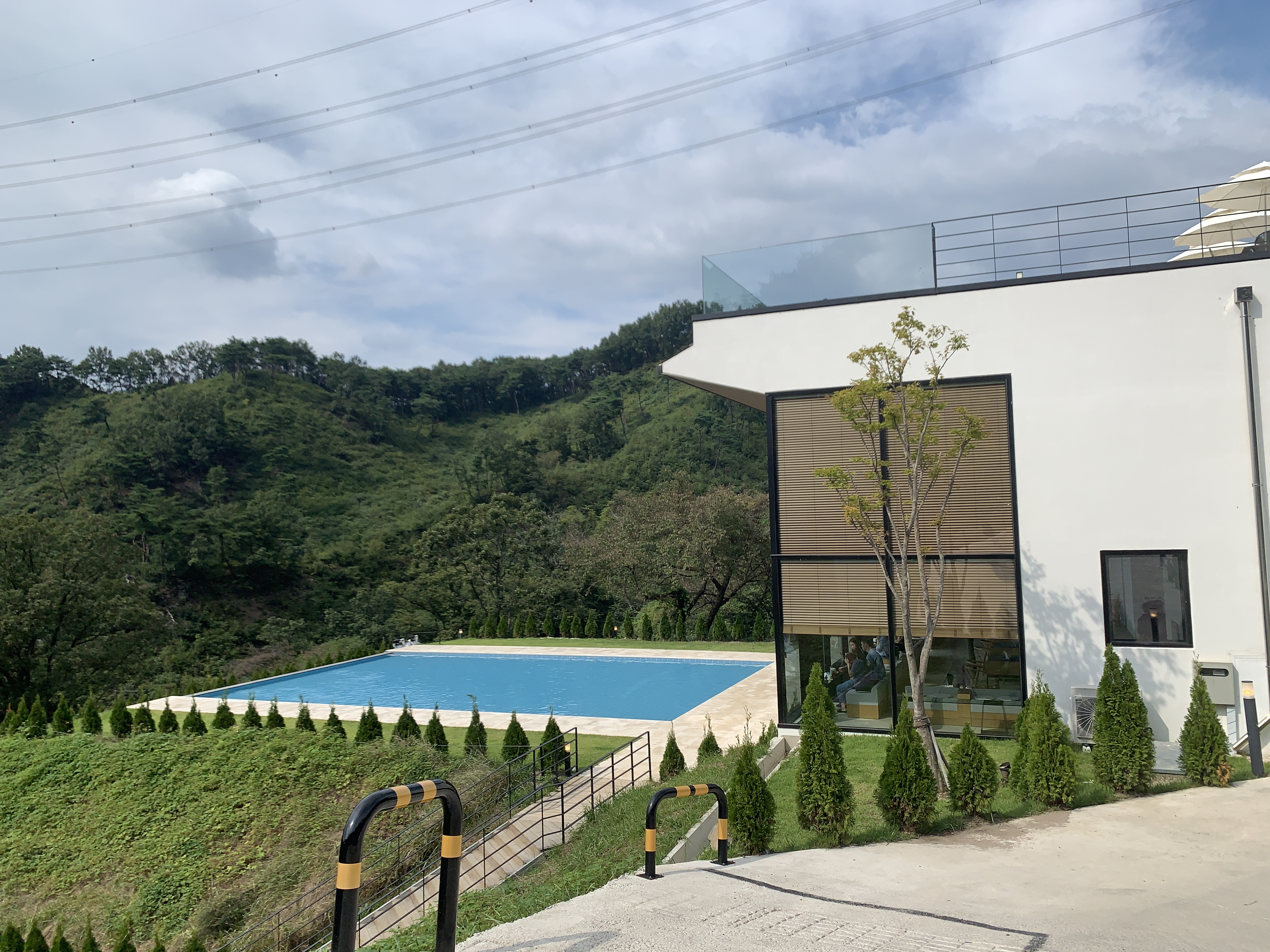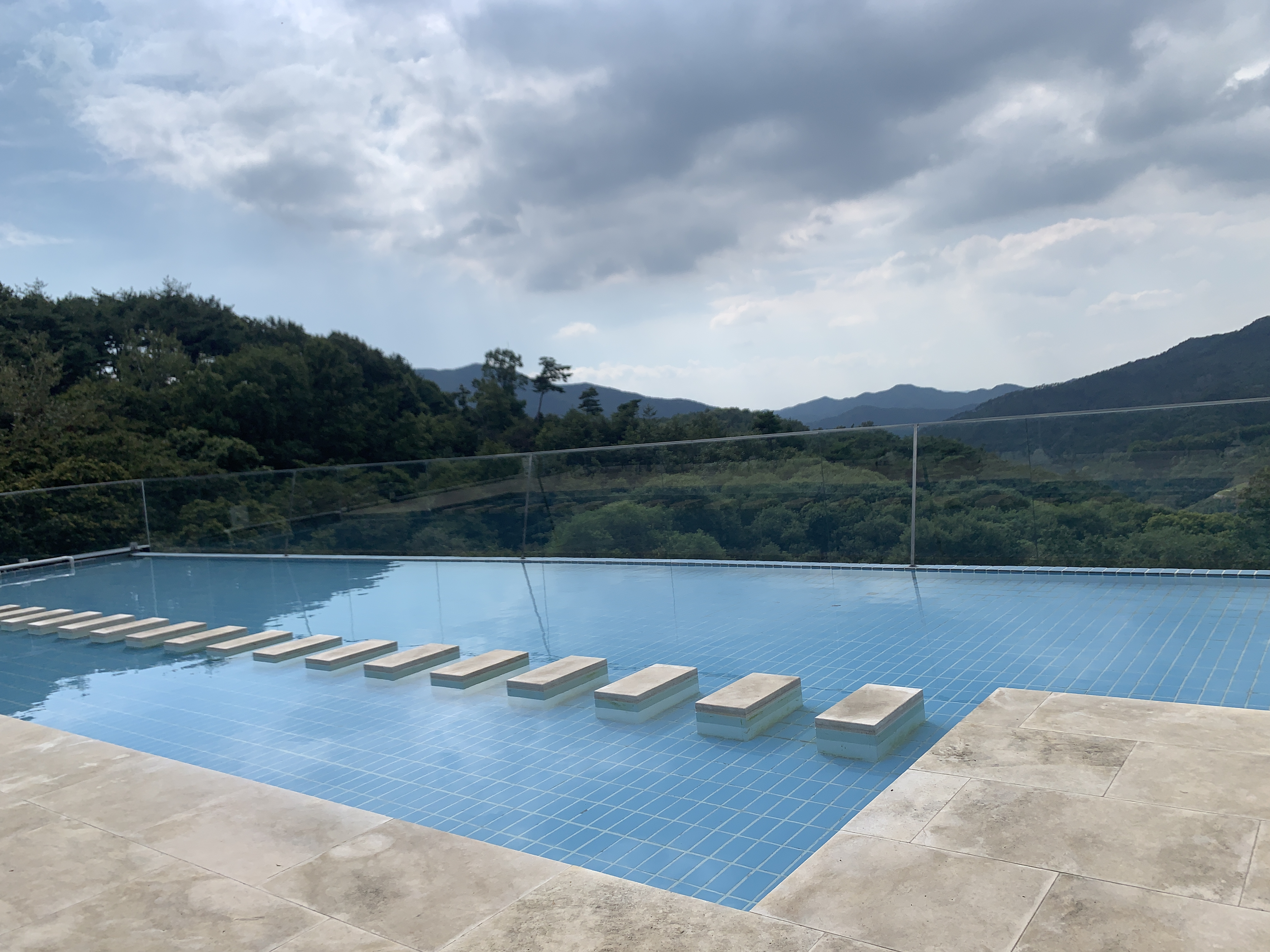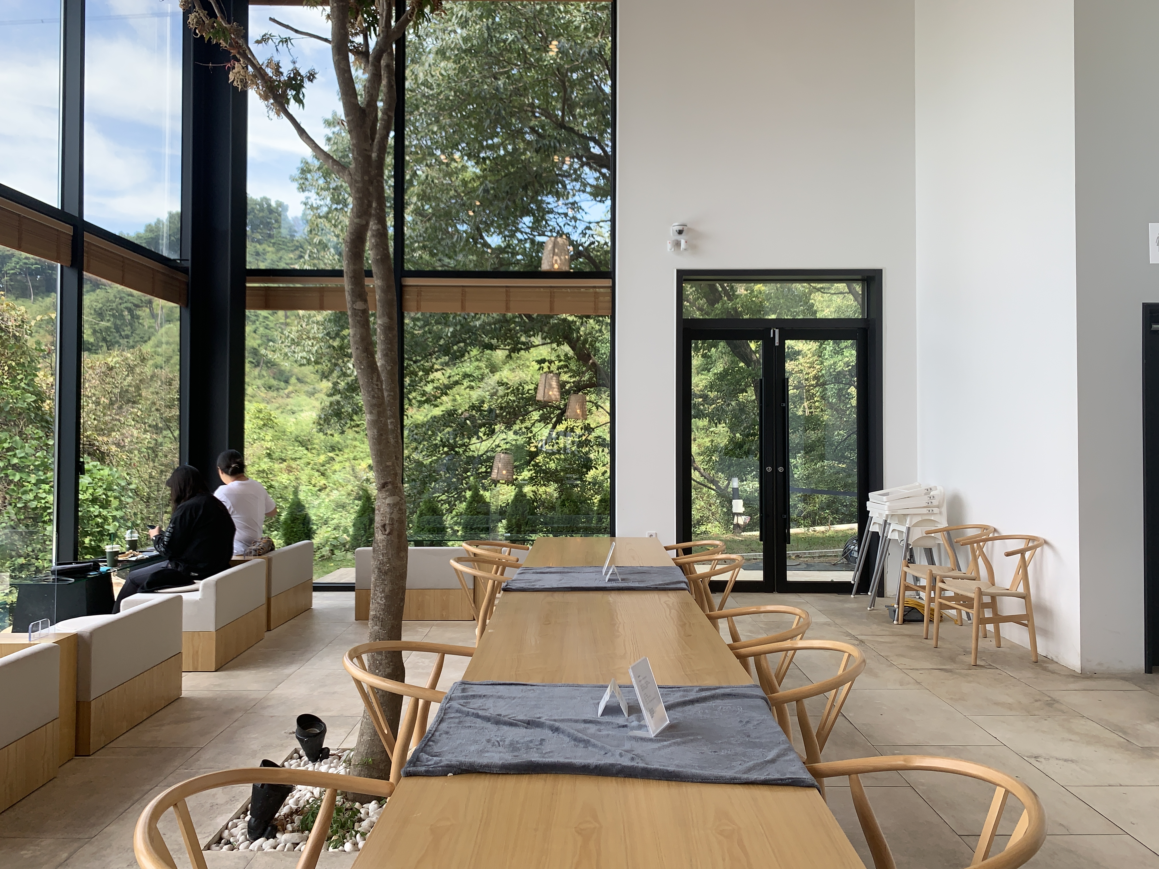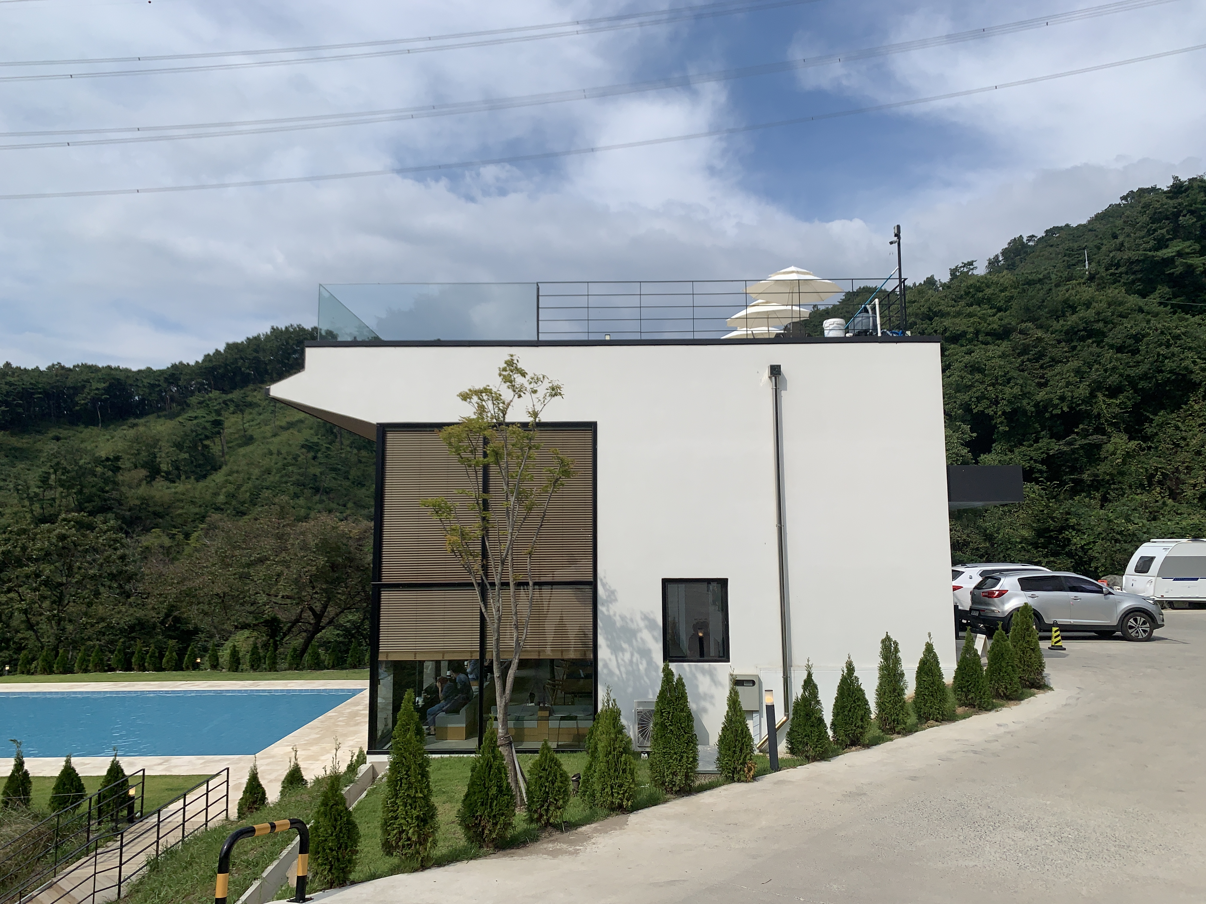 카페 전면이 통유리로 되어 있어서 채광과 개방감이 좋고, 바로 앞에 산과 수영장뷰가 광활하게 펼쳐진다.