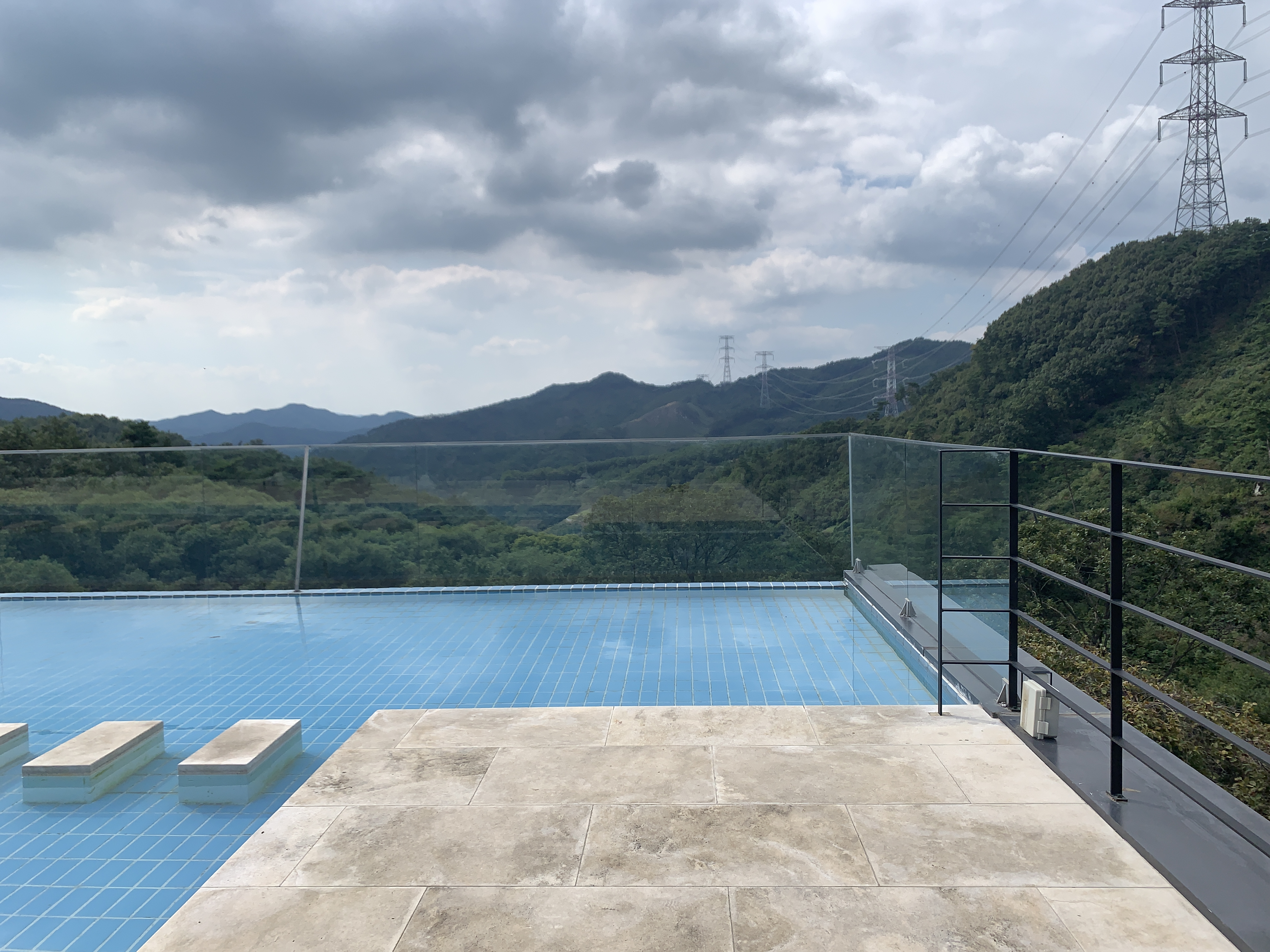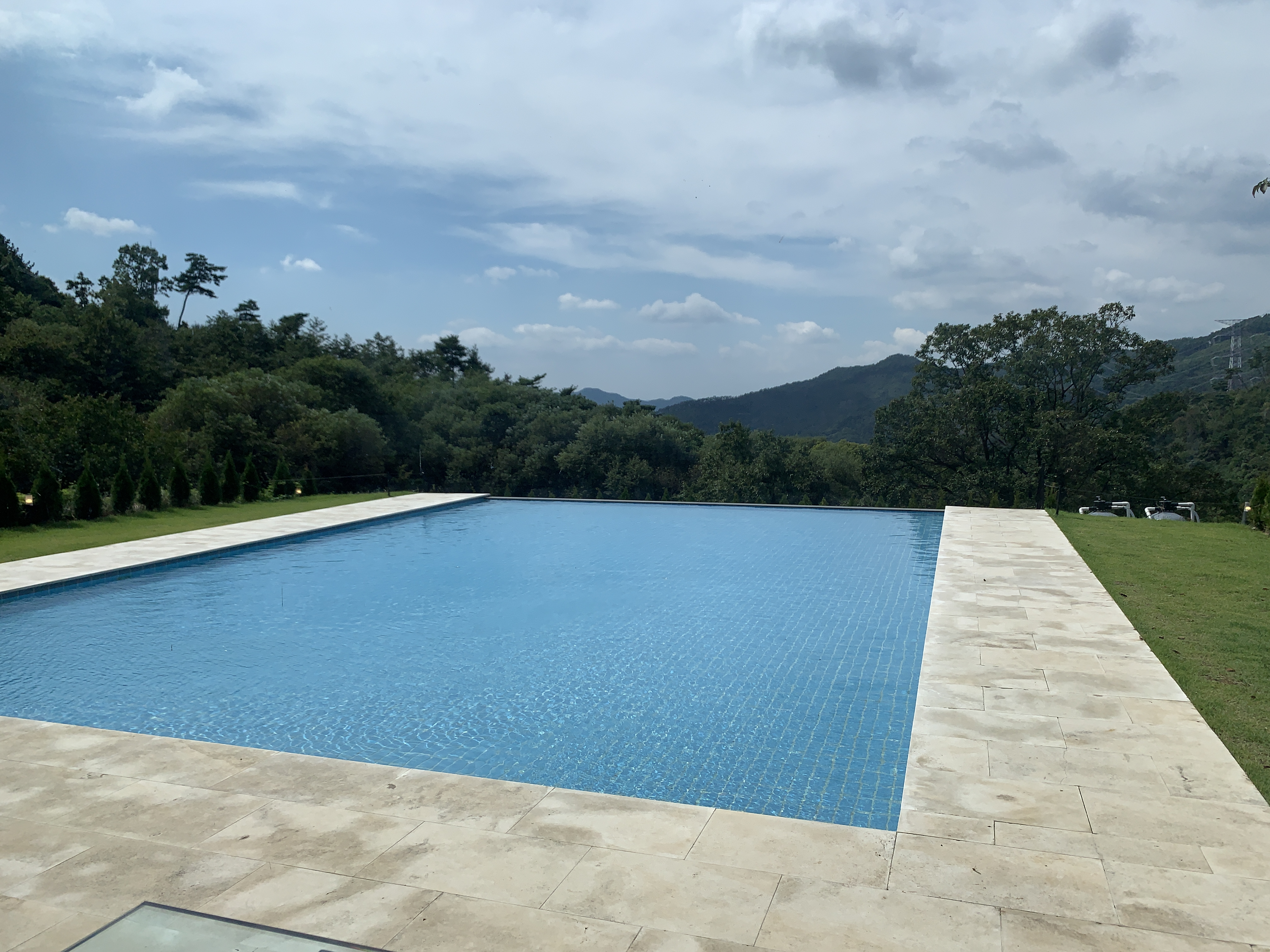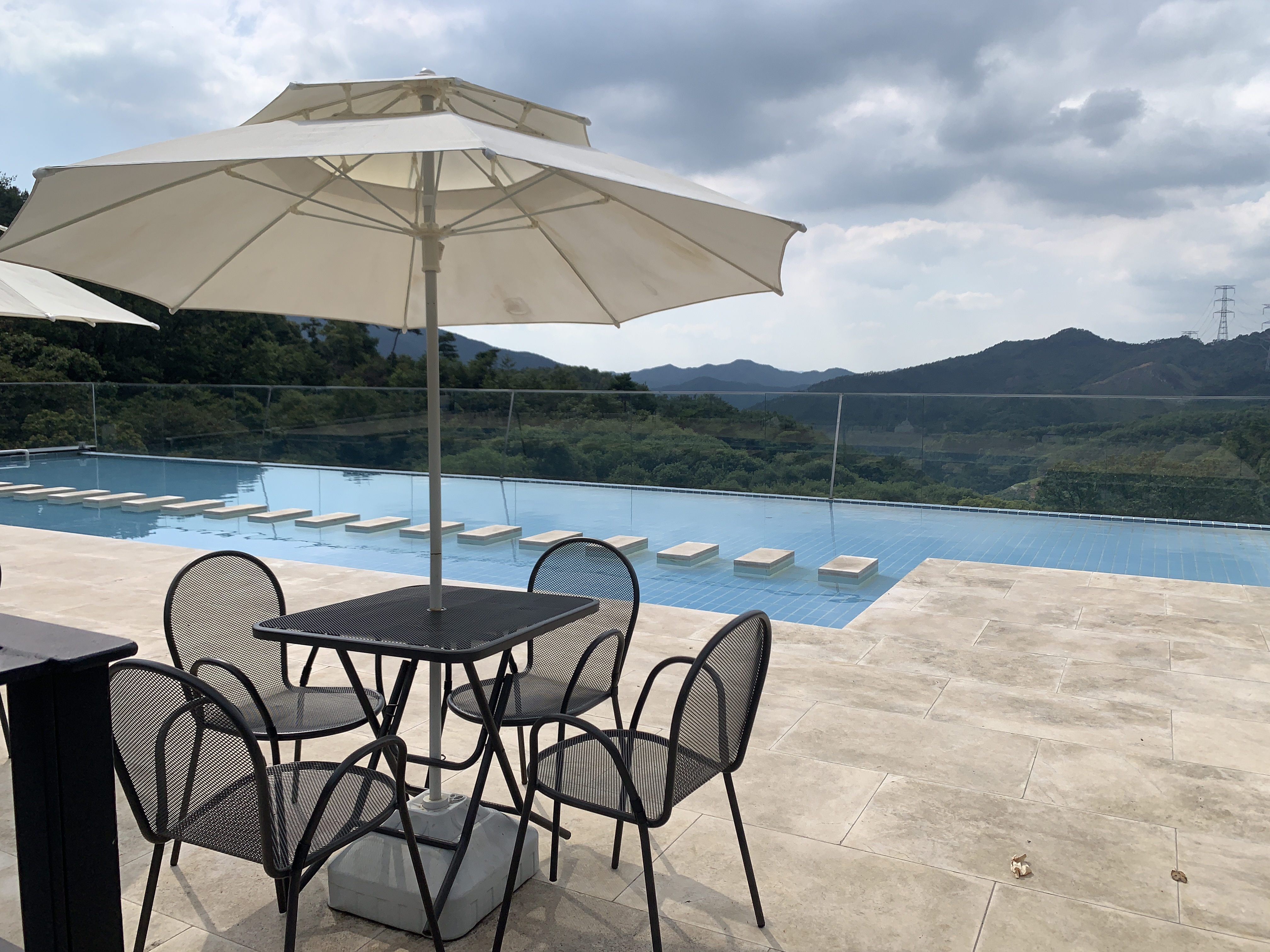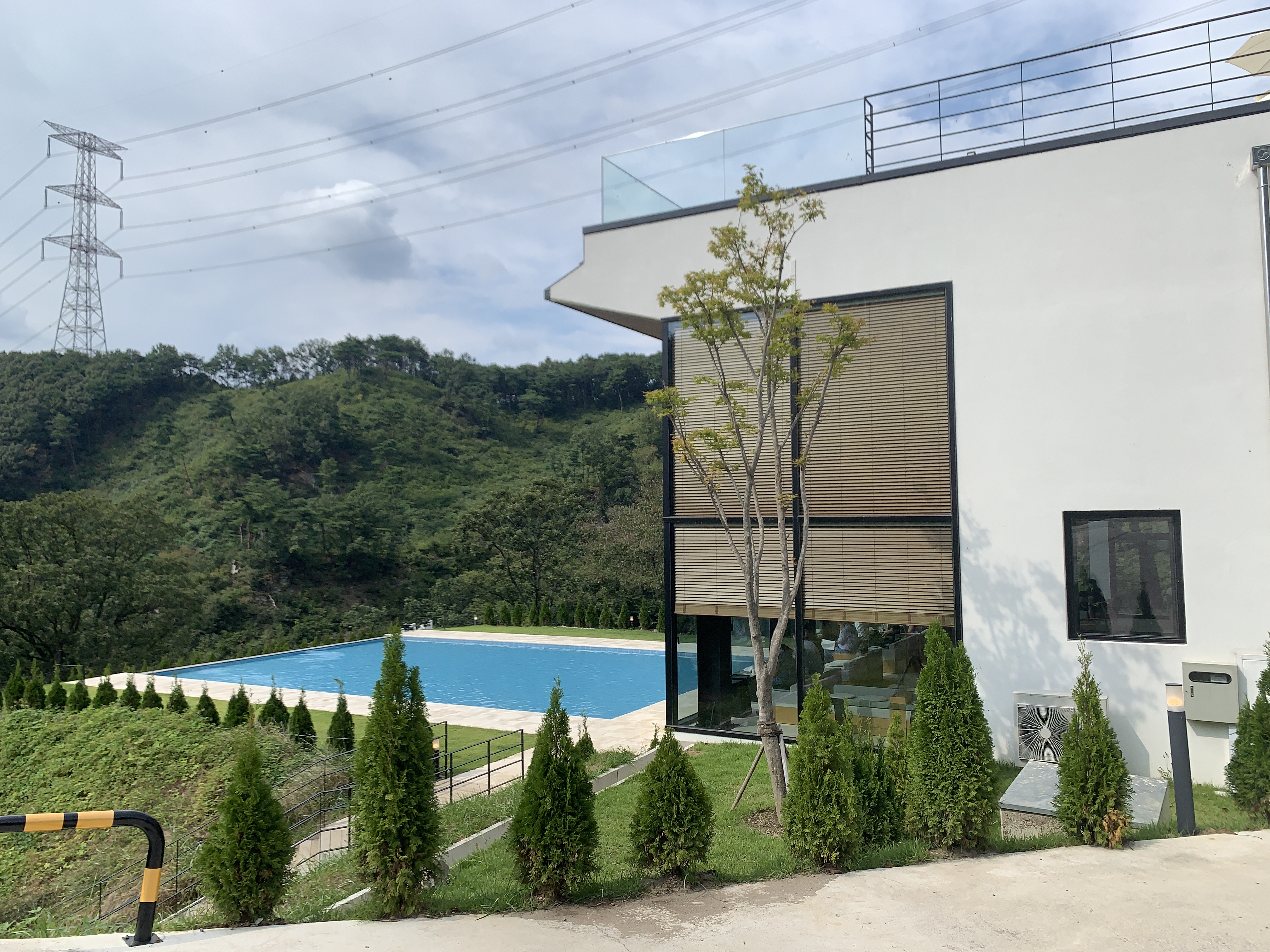 카페 전면이 통유리로 되어 있어서 채광과 개방감이 좋고, 바로 앞에 산과 수영장뷰가 광활하게 펼쳐진다.