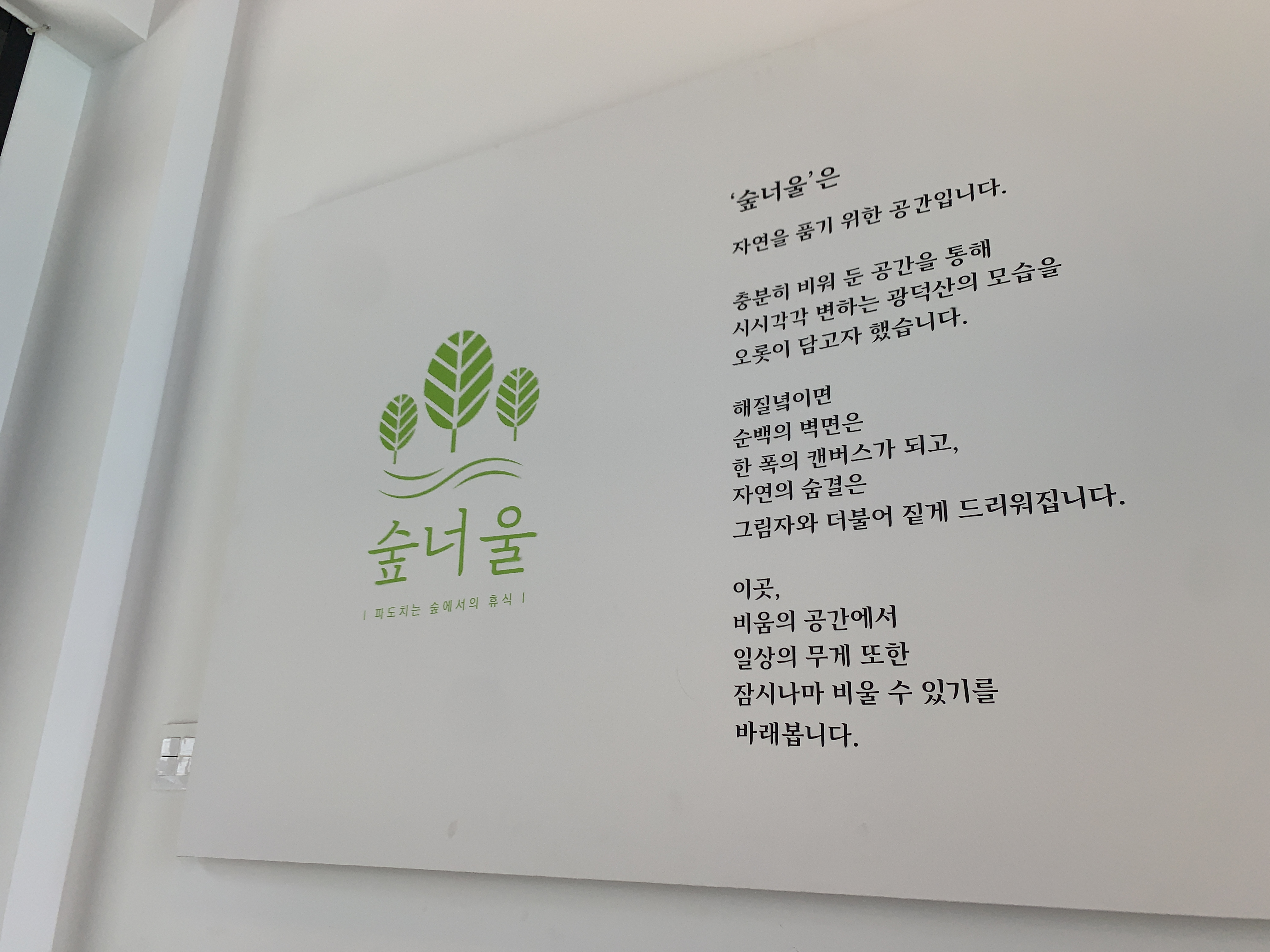 '숲너울'이라는 순우리말 이름이 참 예쁜데, 숲이라는 공간에서 자연을 품고, 자연과 어우러지는 공간을 추구한다는 의미가 있다.