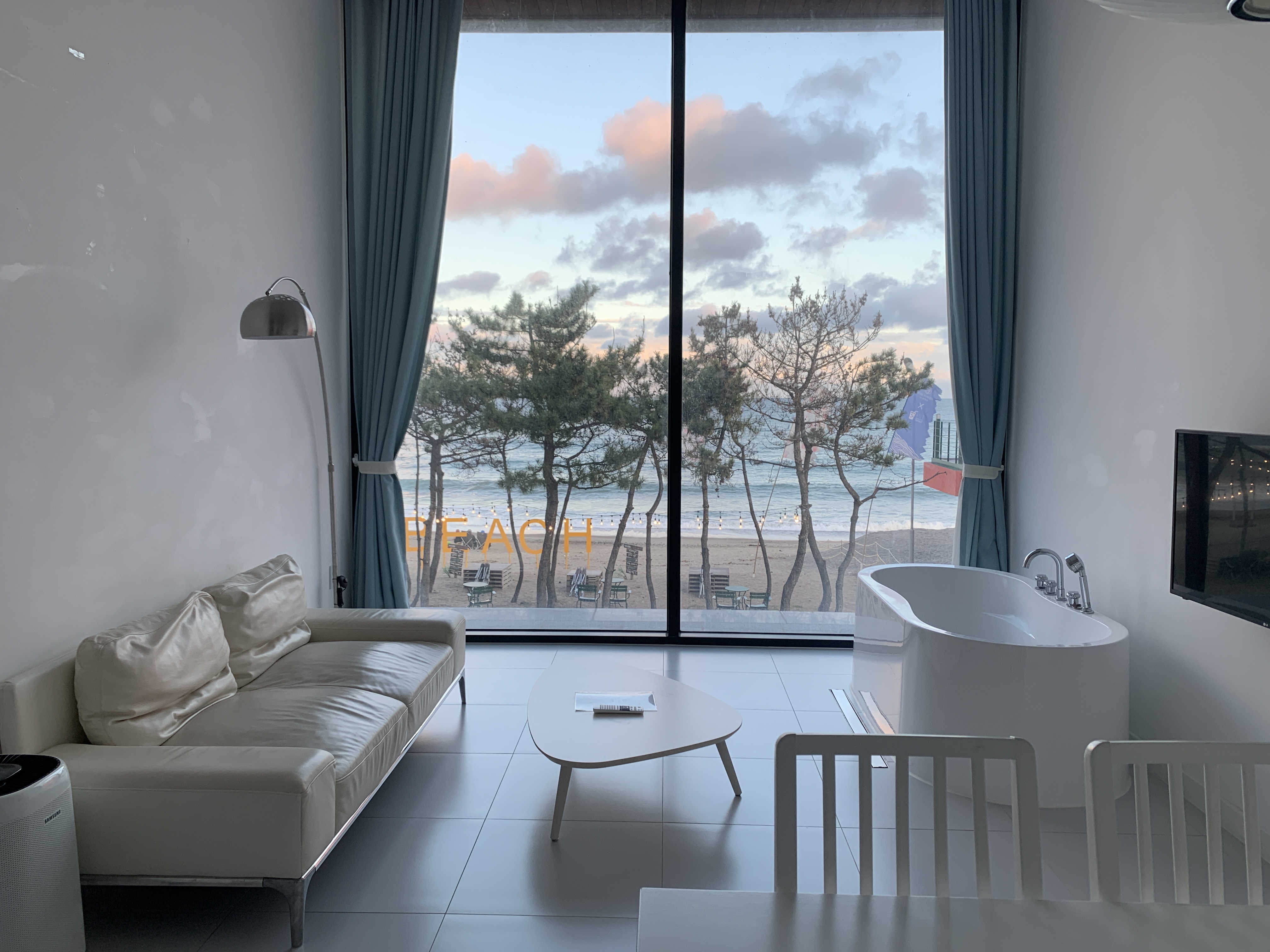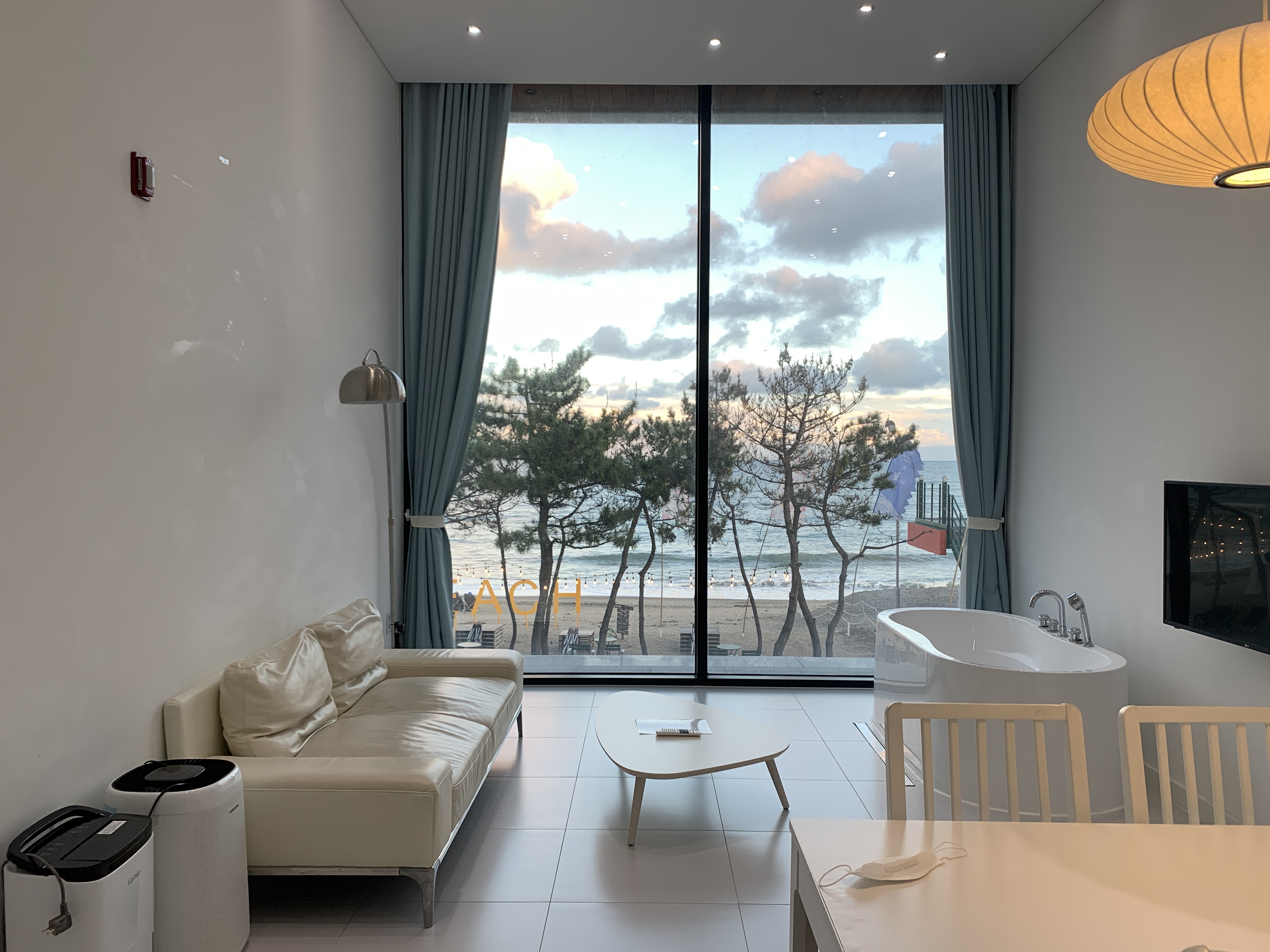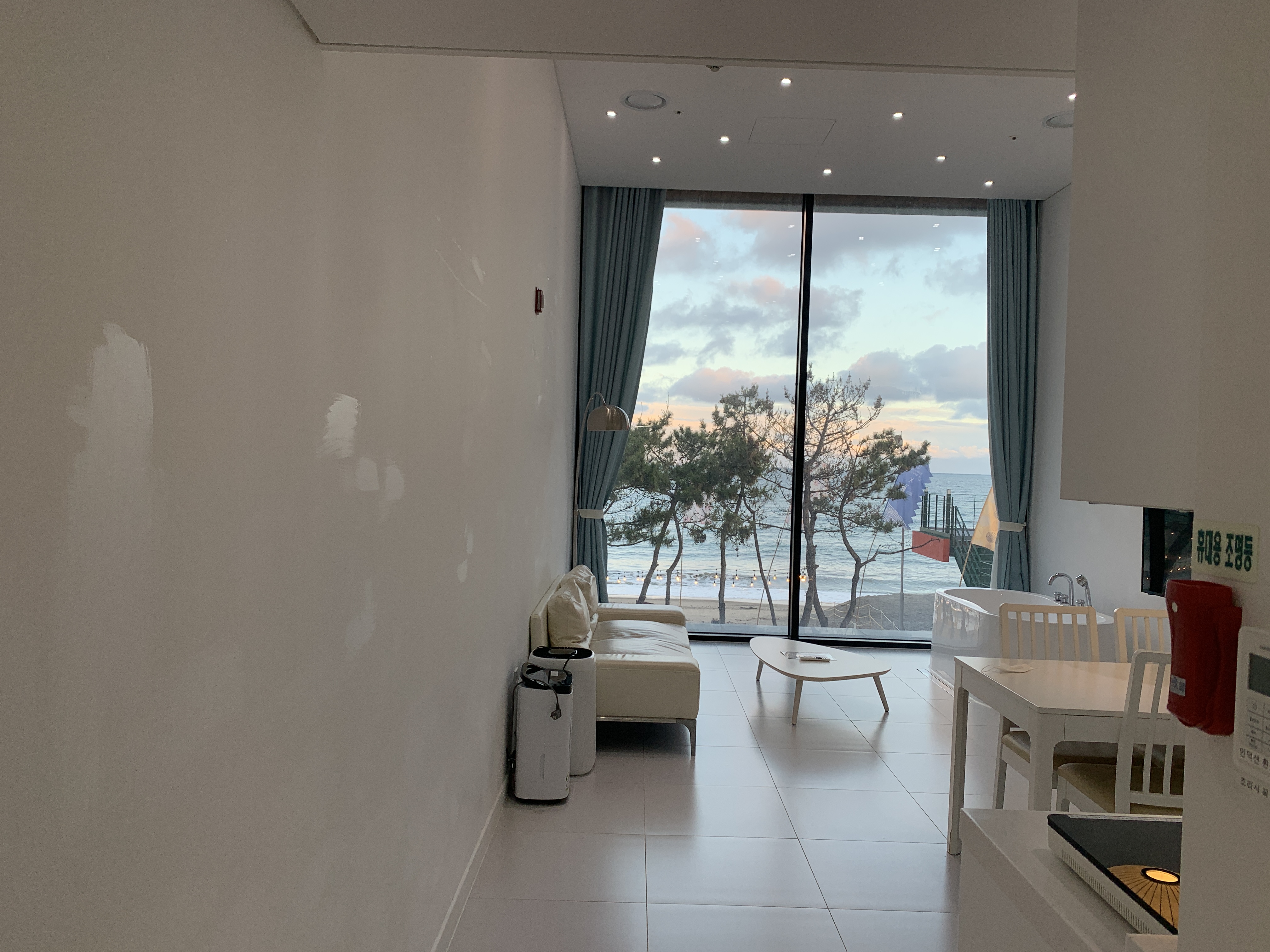 안으로 들어가면 정말 감탄사가 나올 정도로 깔끔한 실내와, 통유리로 해변이 보이는 큰 창이 반겨준다.
