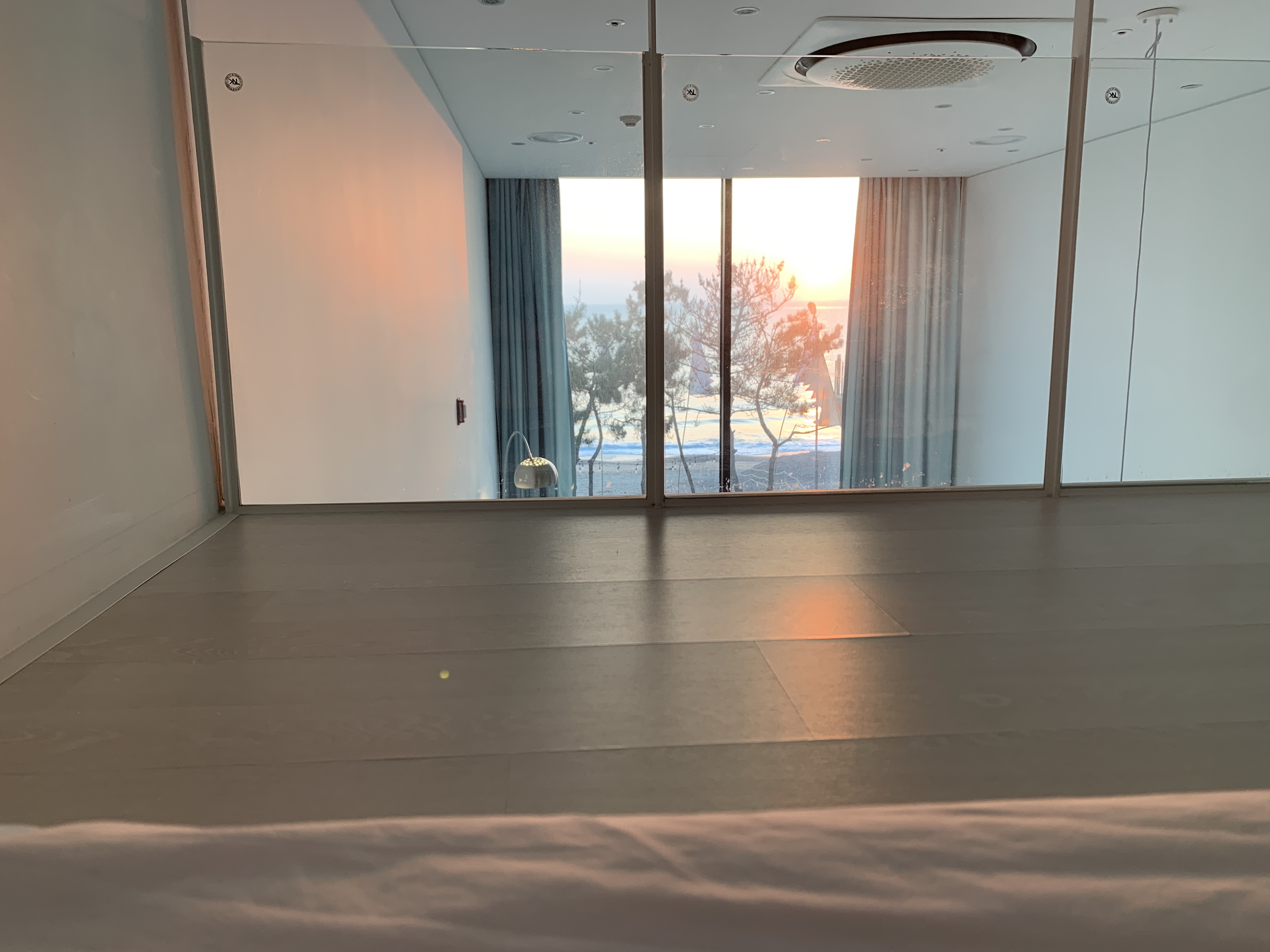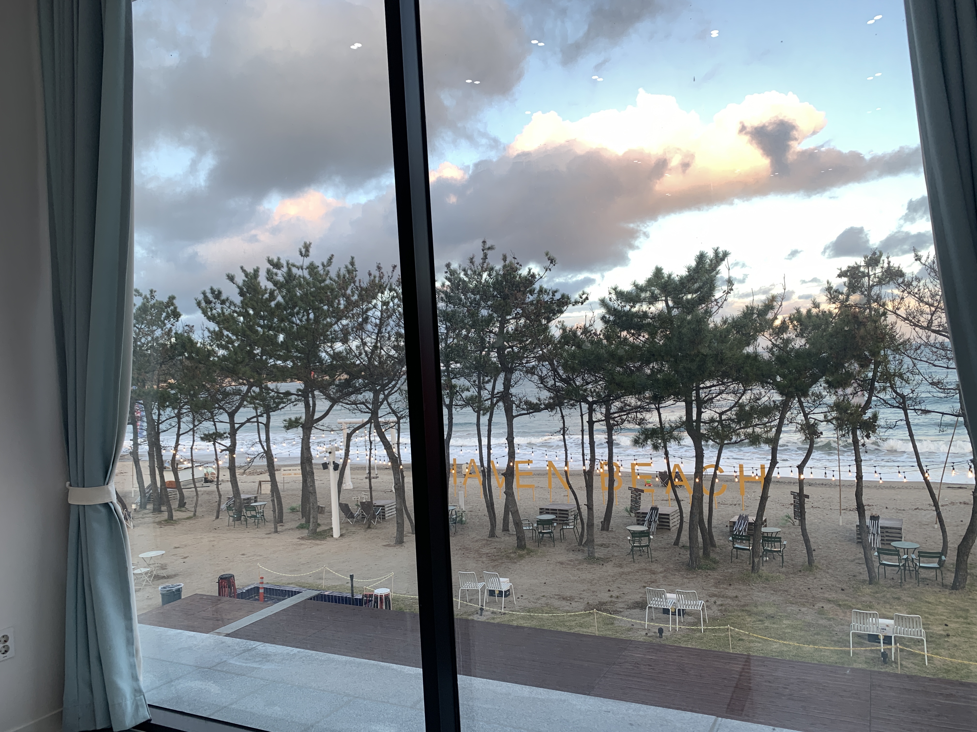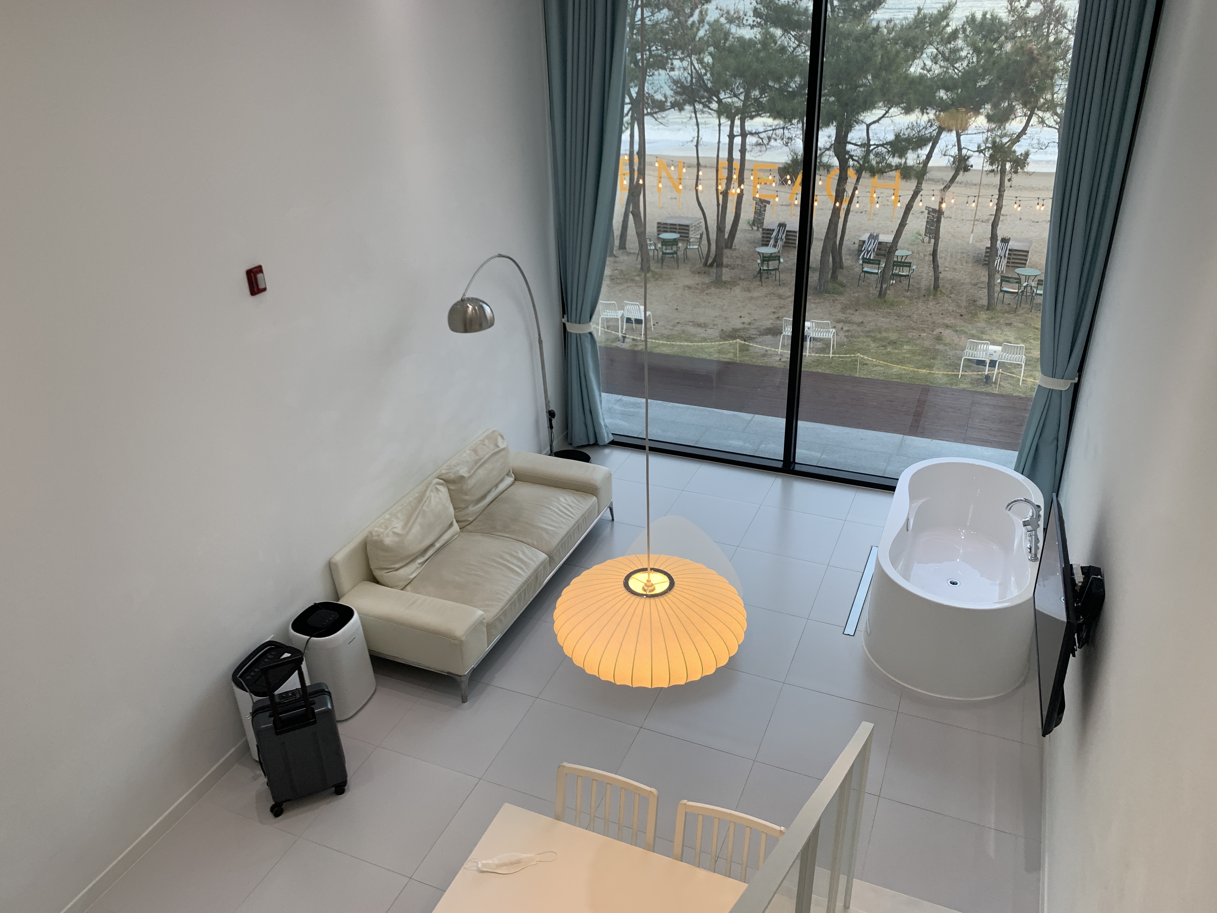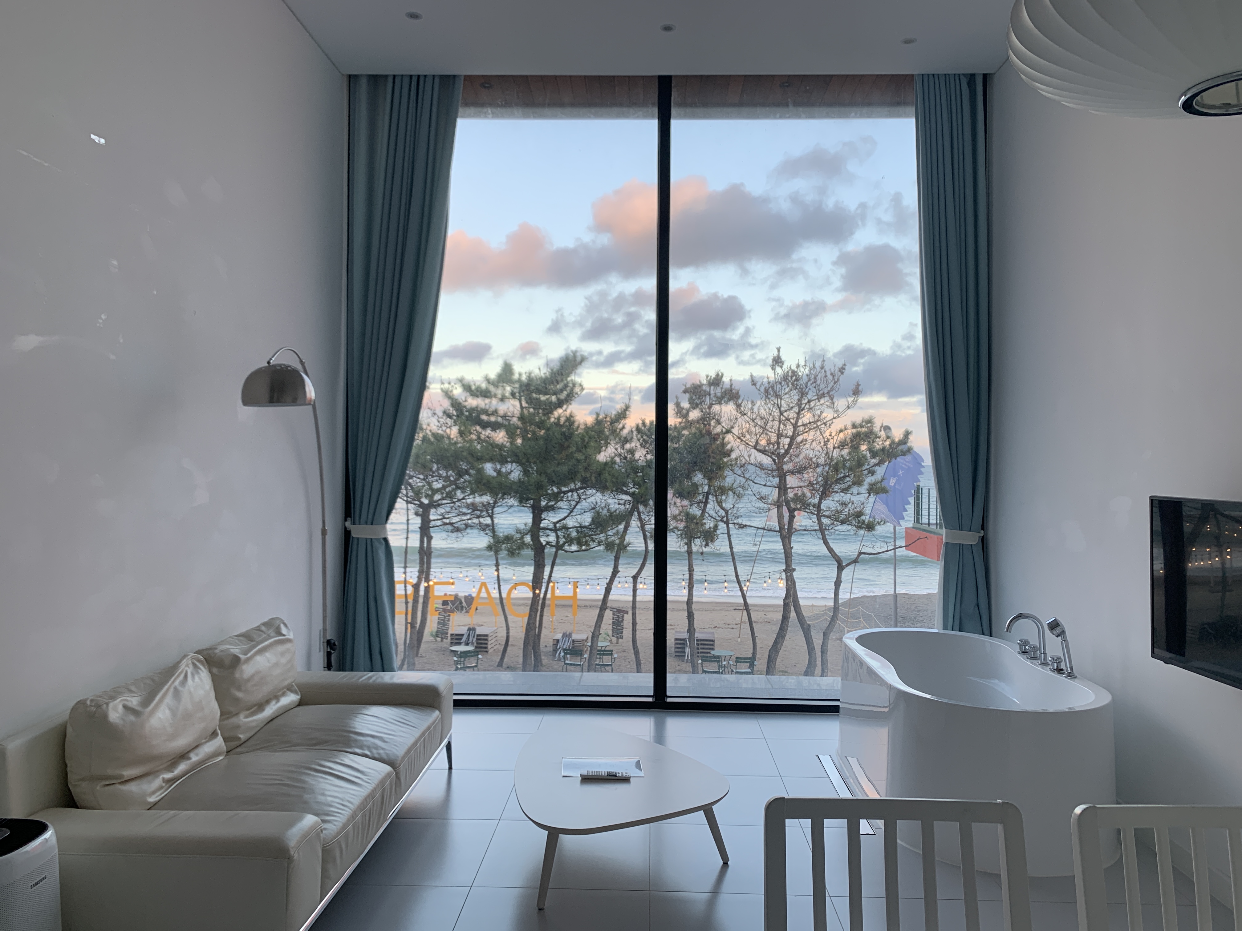 안으로 들어가면 정말 감탄사가 나올 정도로 깔끔한 실내와, 통유리로 해변이 보이는 큰 창이 반겨준다.