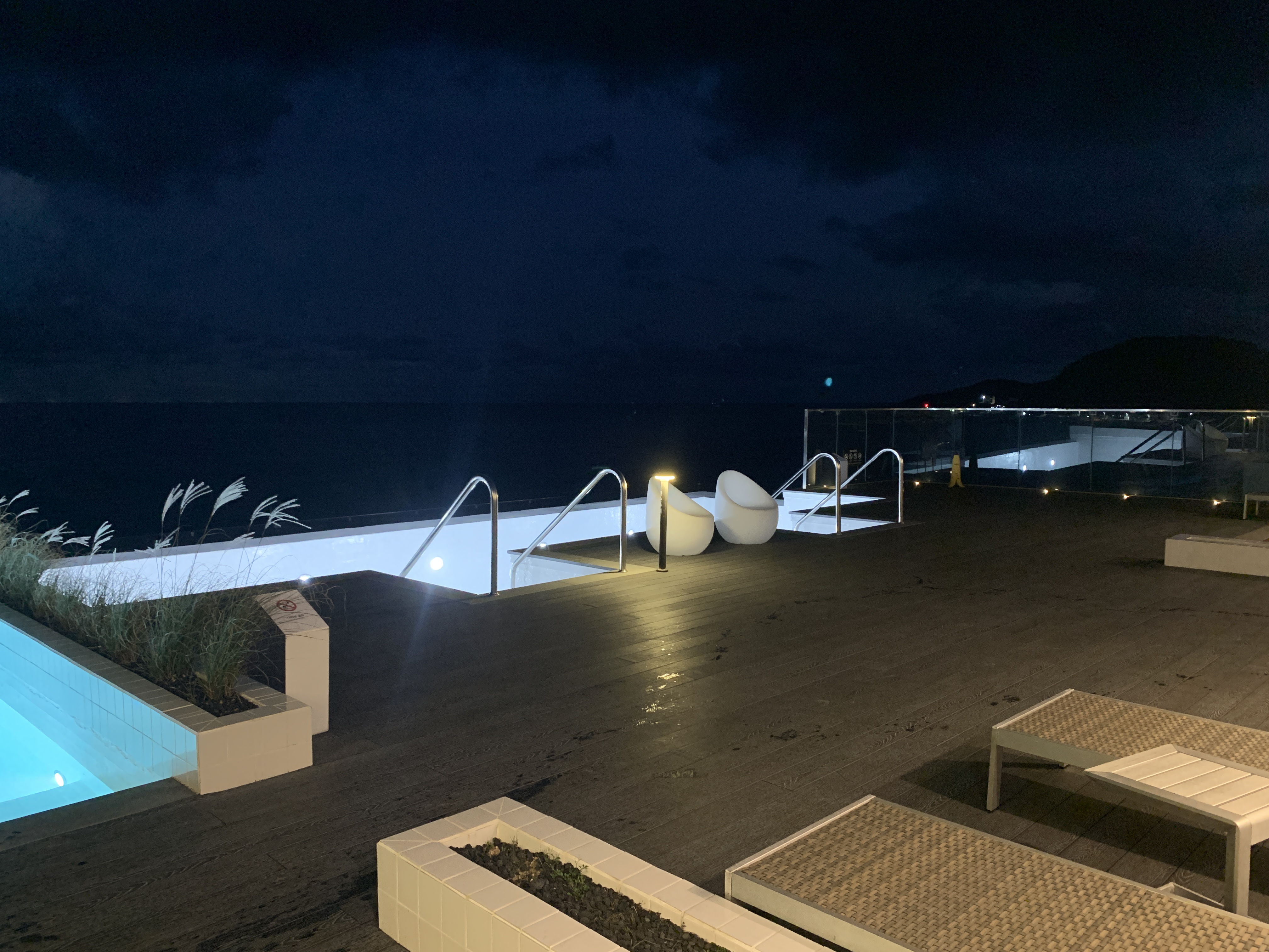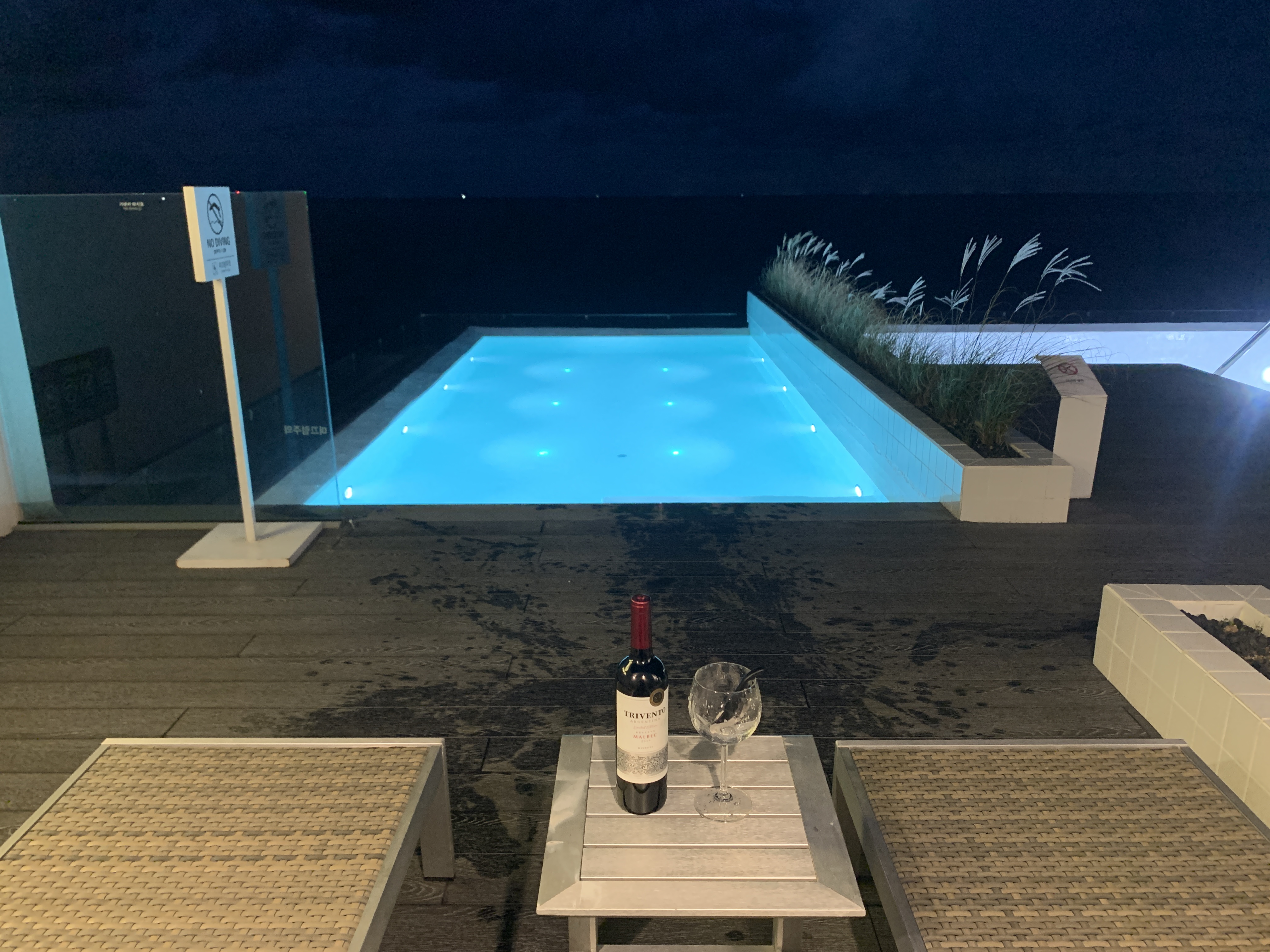 바로 앞에 수영장 불빛이 파랗게 비치는데 진짜 분위기가 미쳤다 ...