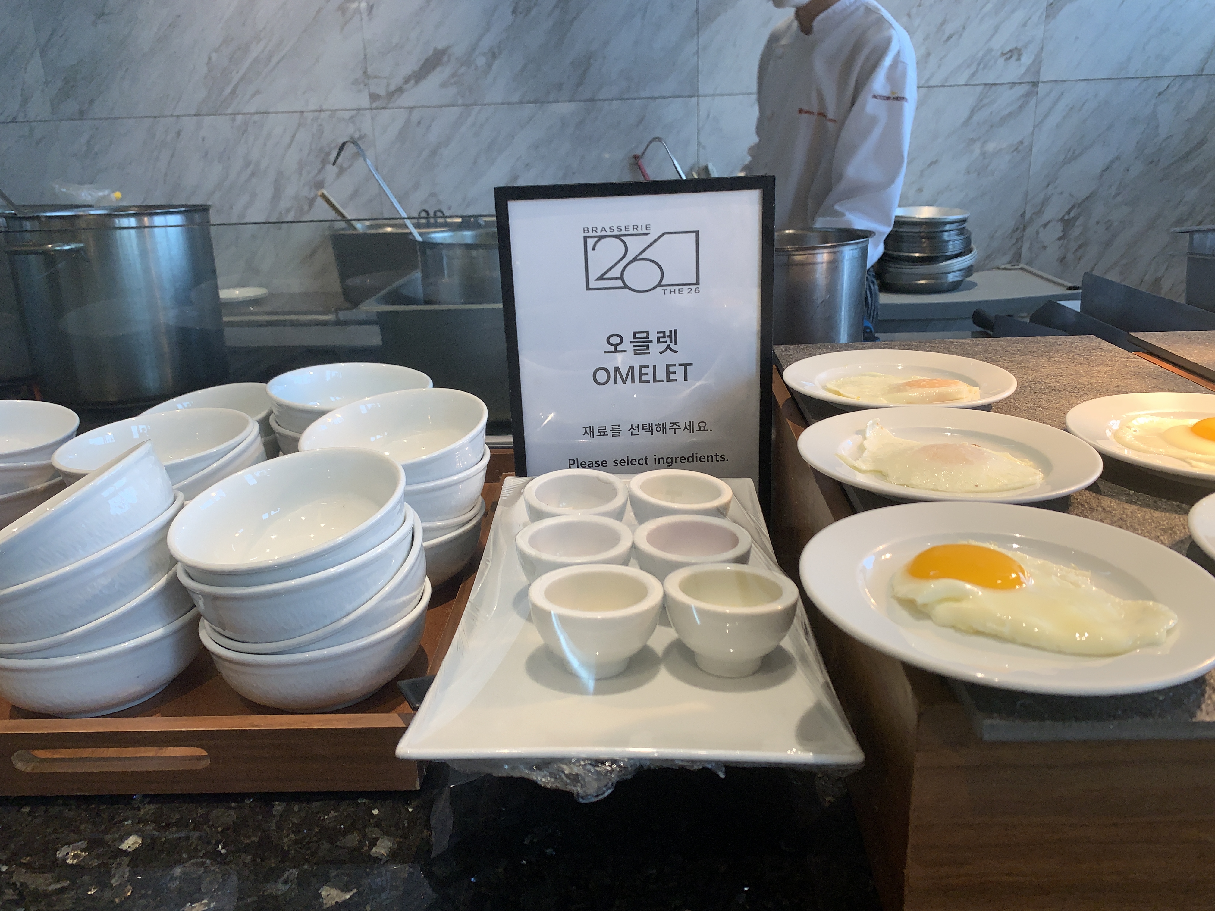 다른 건 그냥 셋팅되어 있는 것들 중에서 뷔페처럼 가지고 가서 먹는 형식인데, 저 오믈렛은 셰프님께서 직접 즉석에서 조리를 해서 주신다. 아무래도 직접 불을 사용해서 요리해주는 거라서 좀 더 신선하고 ... 값어치가 있다고 해야 하나.