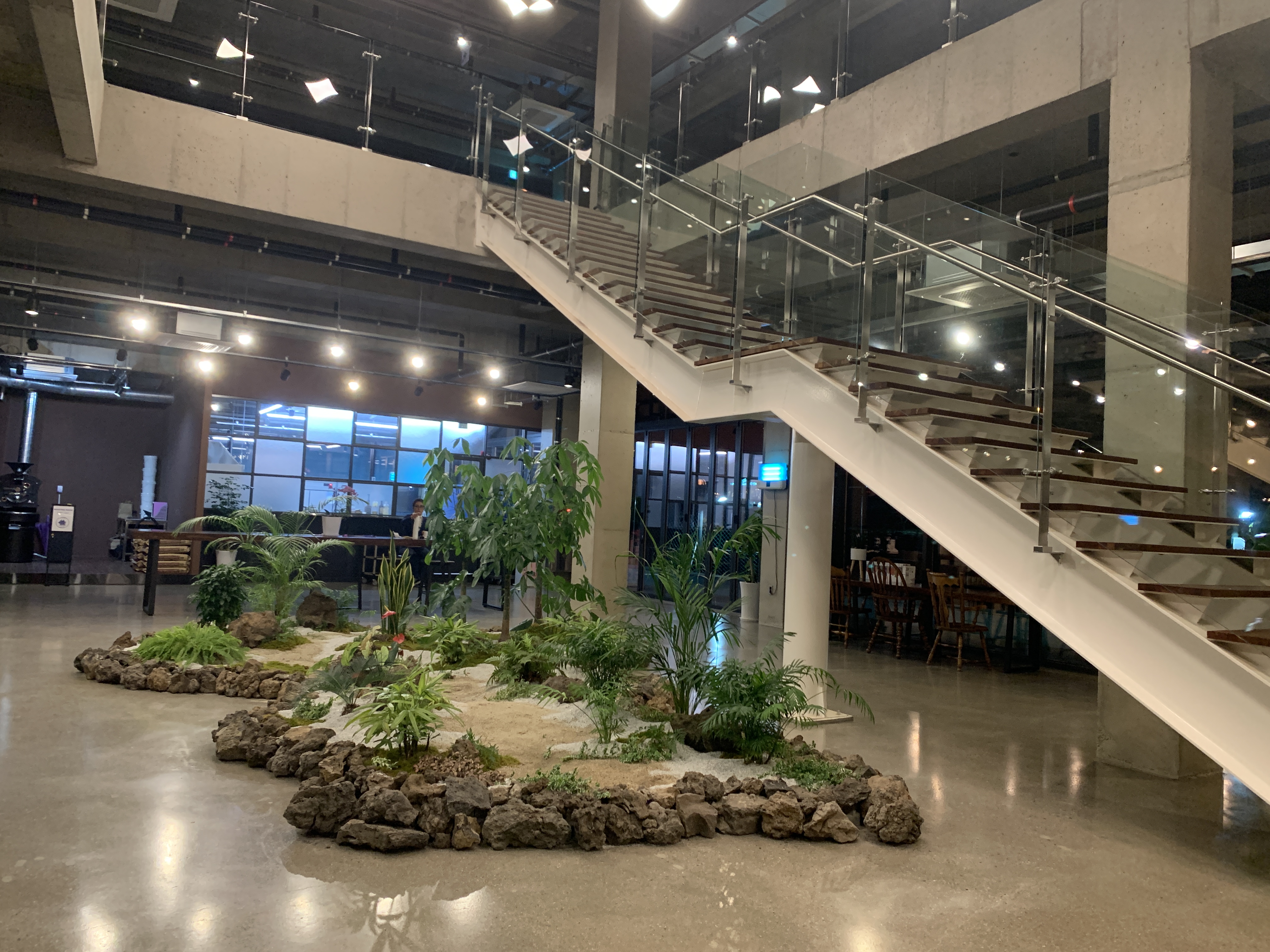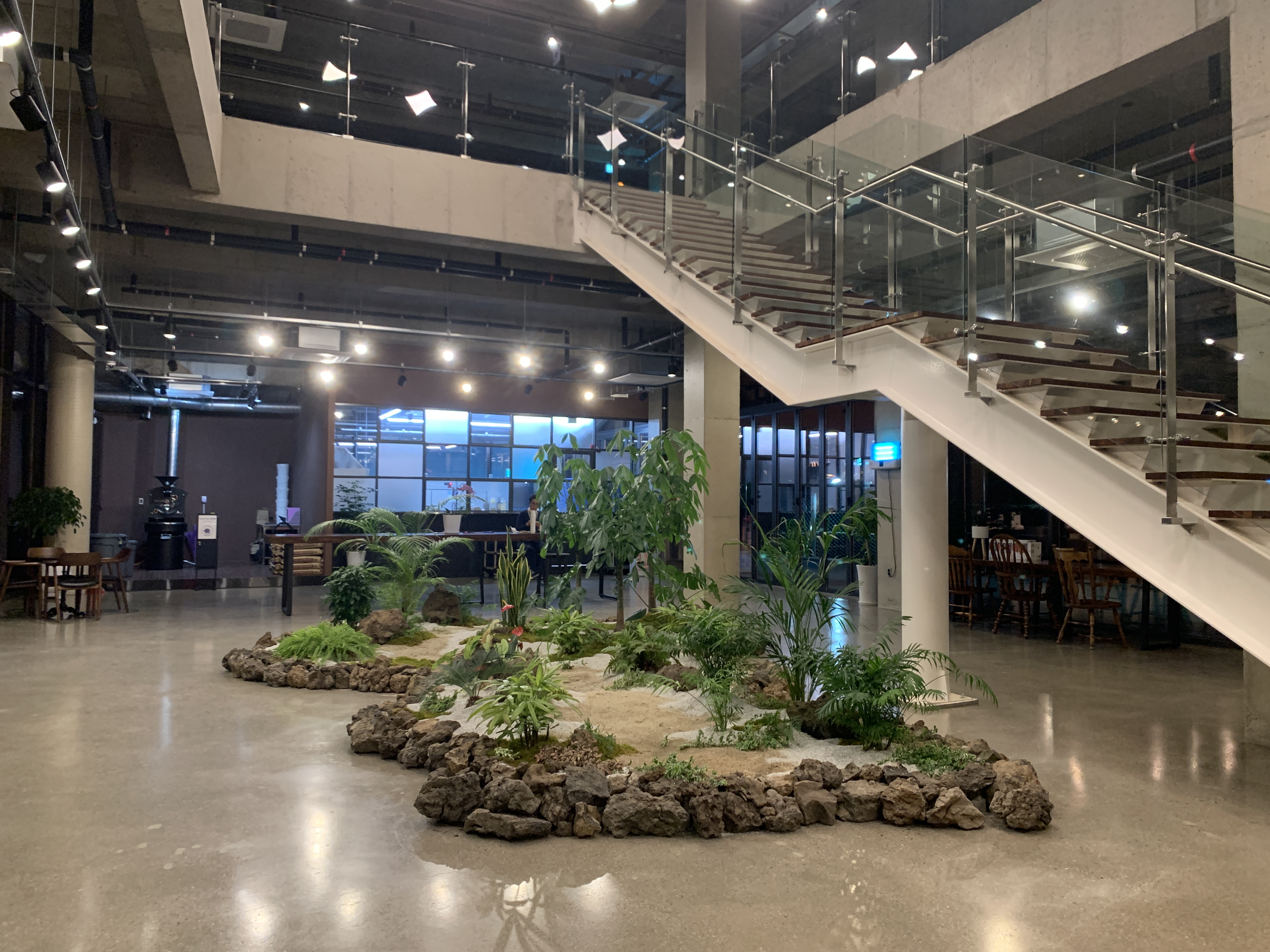 안에는 이렇게 식물로 인테리어가 되어 있고, 위로 올라가는 계단이 있다.