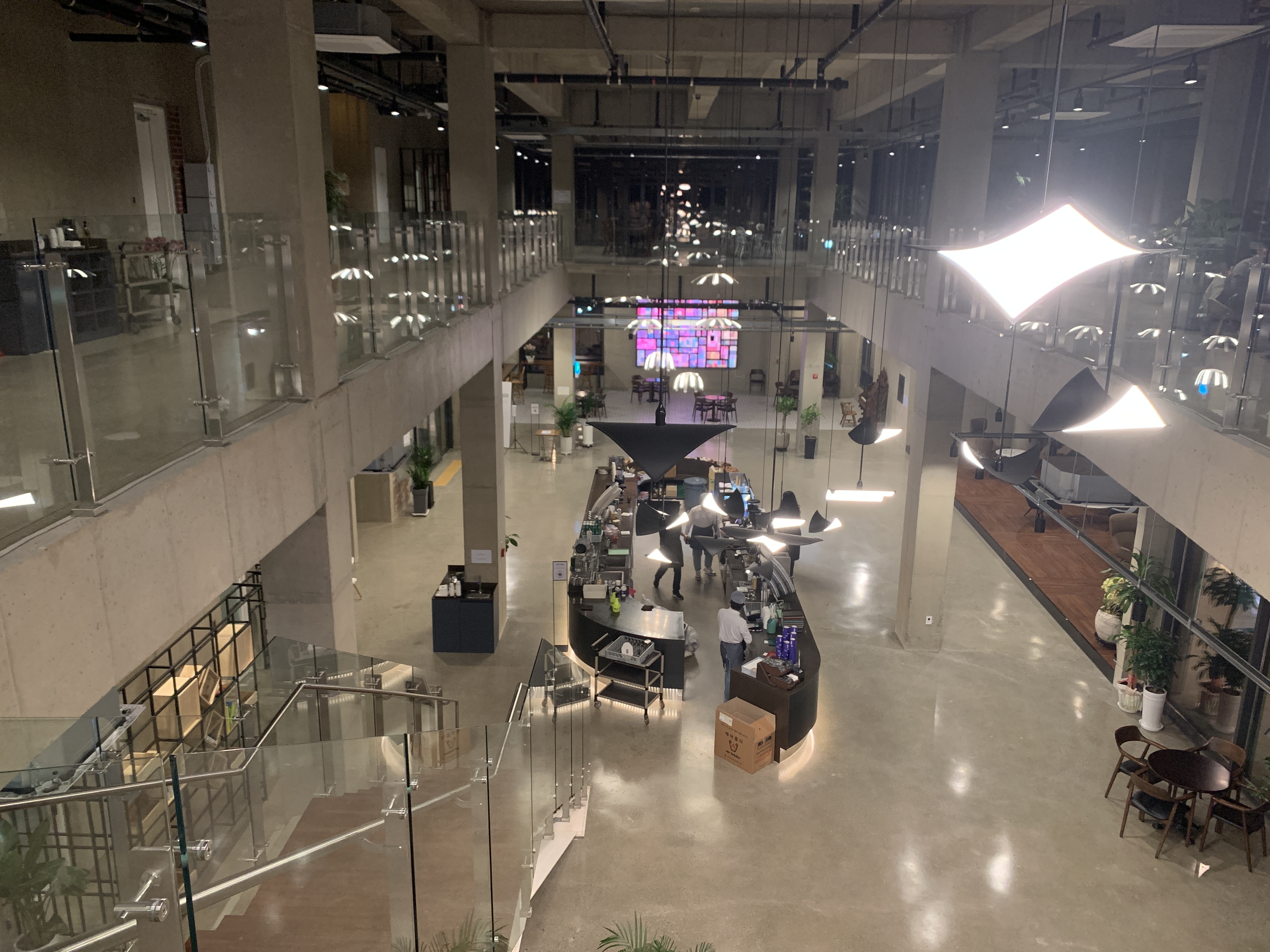 여기는 이런 식으로 가운데를 엄청 크게 뻥 뚫어놓은 구조라서, 정작 2층에도 앉을 자리가 많지는 않다. 그냥 양쪽 사이드에 테이블들이 하나씩 있는 정도.