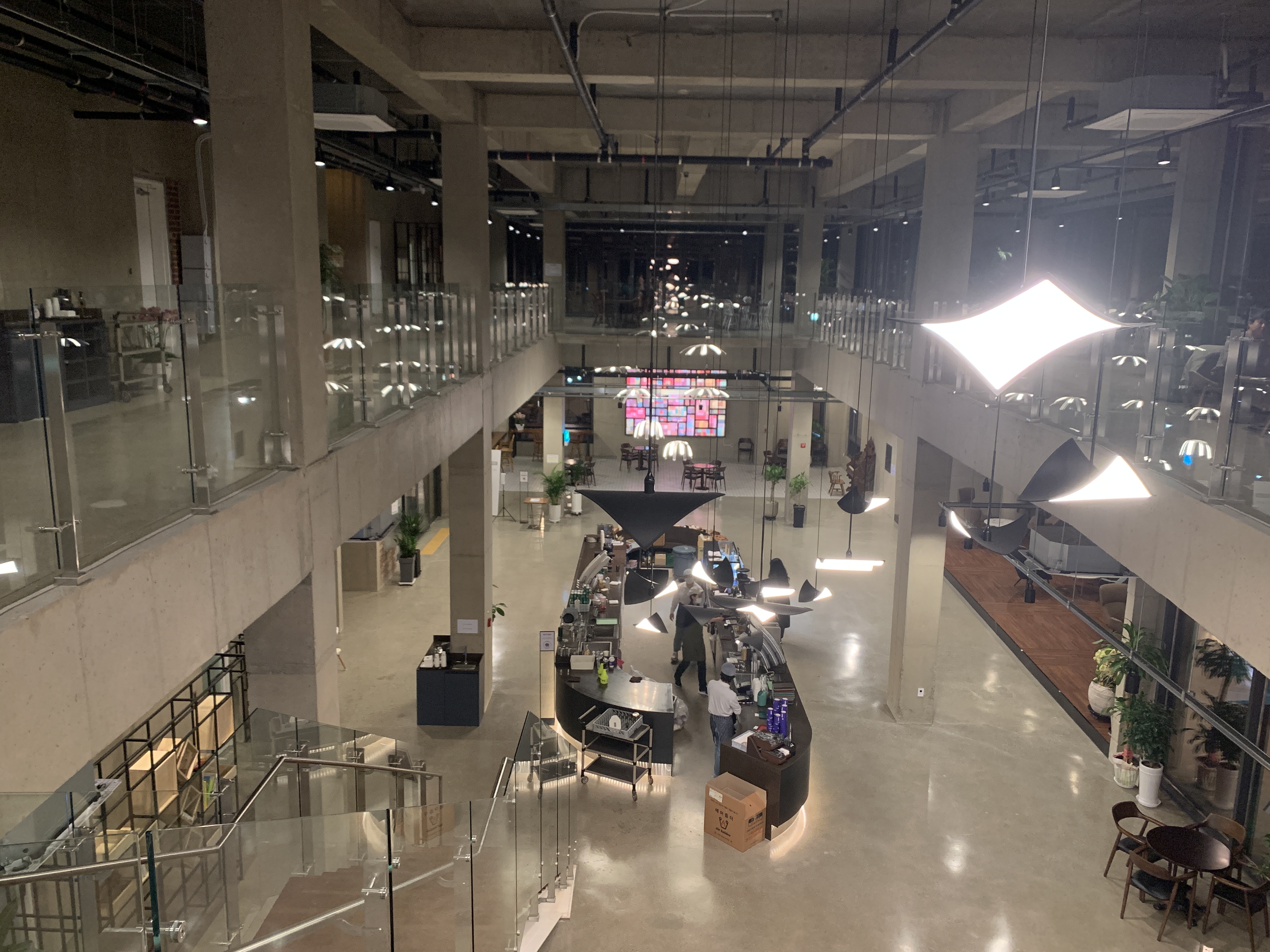 여기는 이런 식으로 가운데를 엄청 크게 뻥 뚫어놓은 구조라서, 정작 2층에도 앉을 자리가 많지는 않다. 그냥 양쪽 사이드에 테이블들이 하나씩 있는 정도.