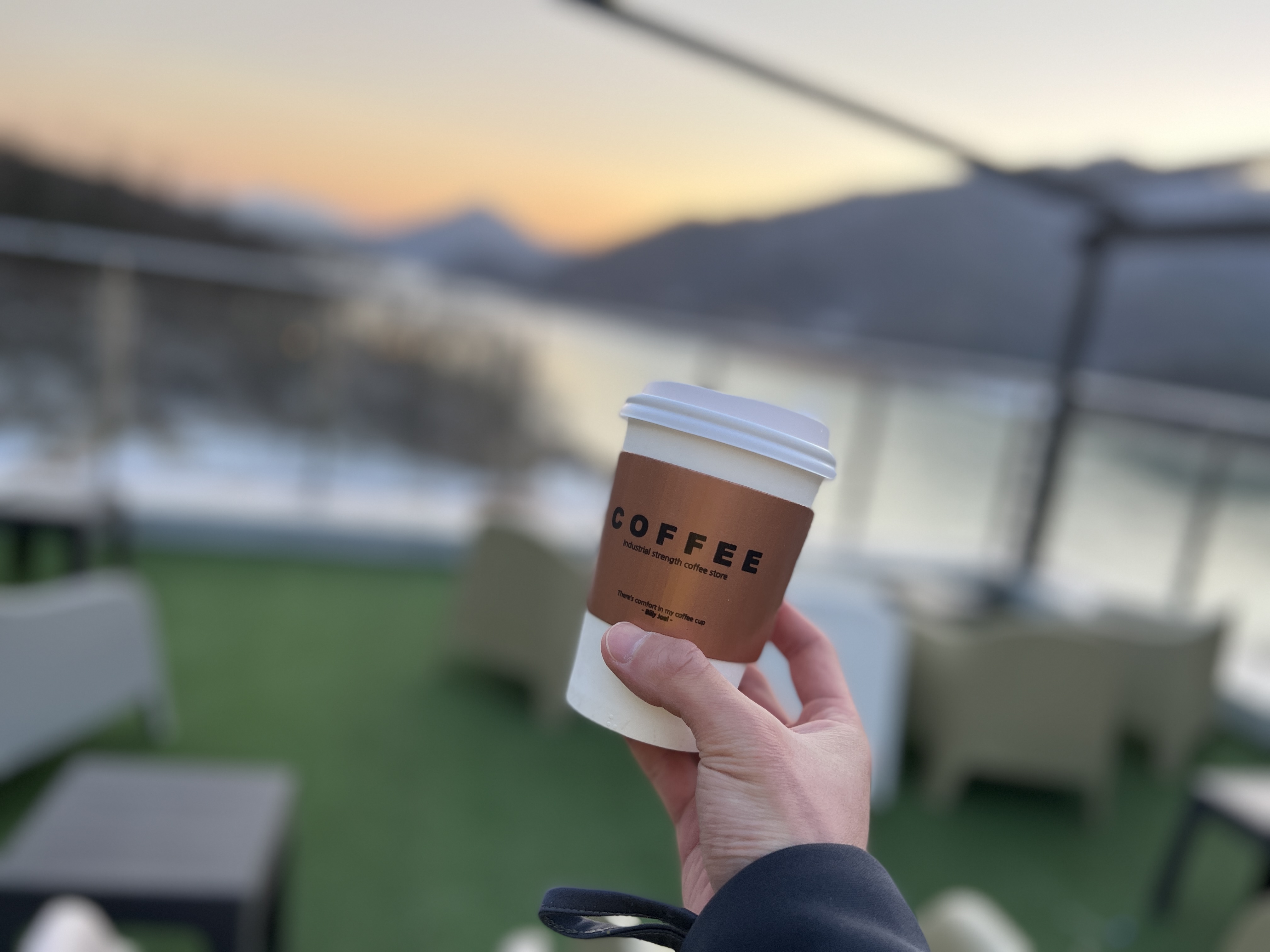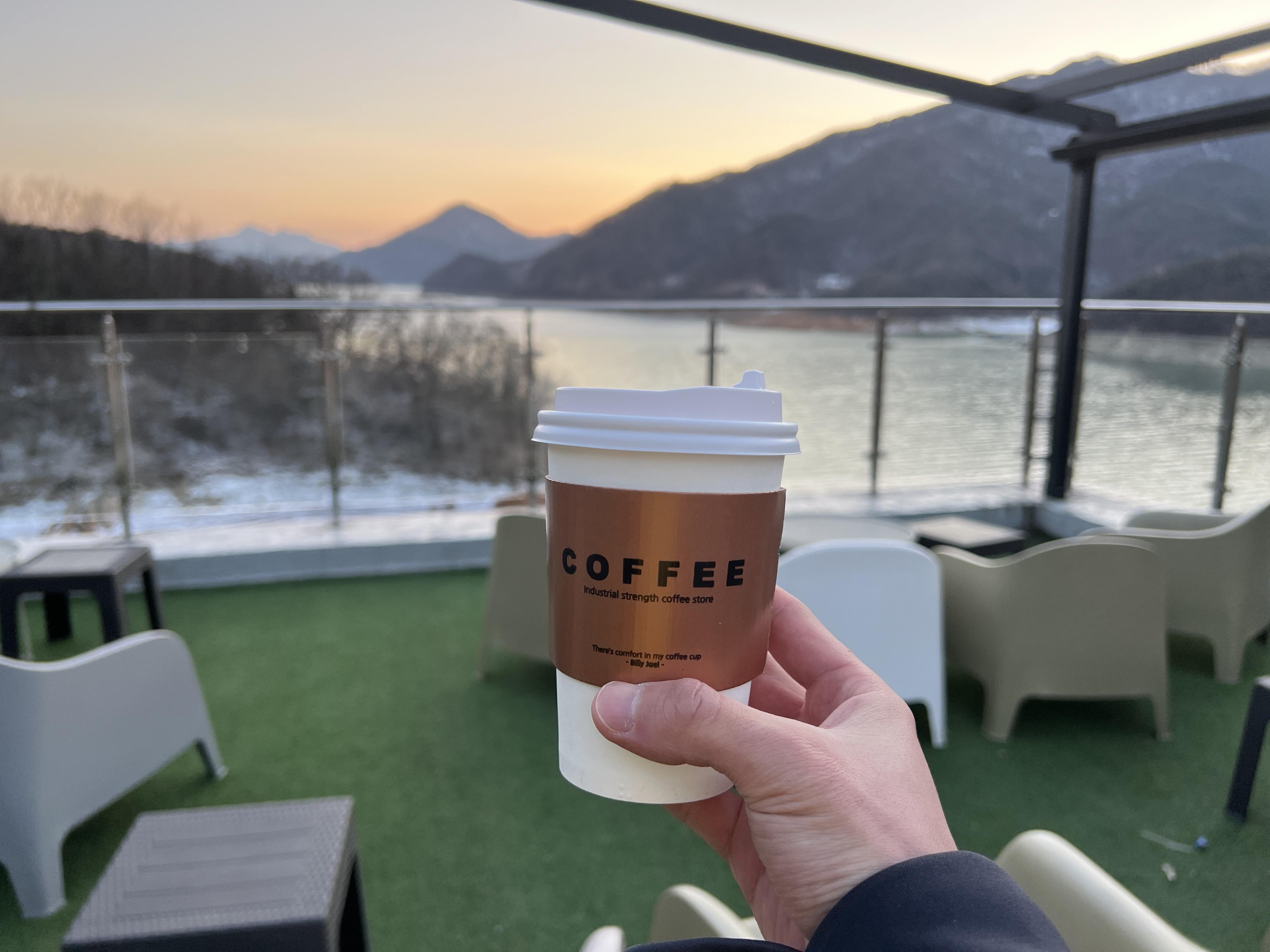 커피를 들고 밖으로 나와봤습니다. 커피는 그냥 일회용 잔에 줘서 뭐 특별한 건 없습니다.