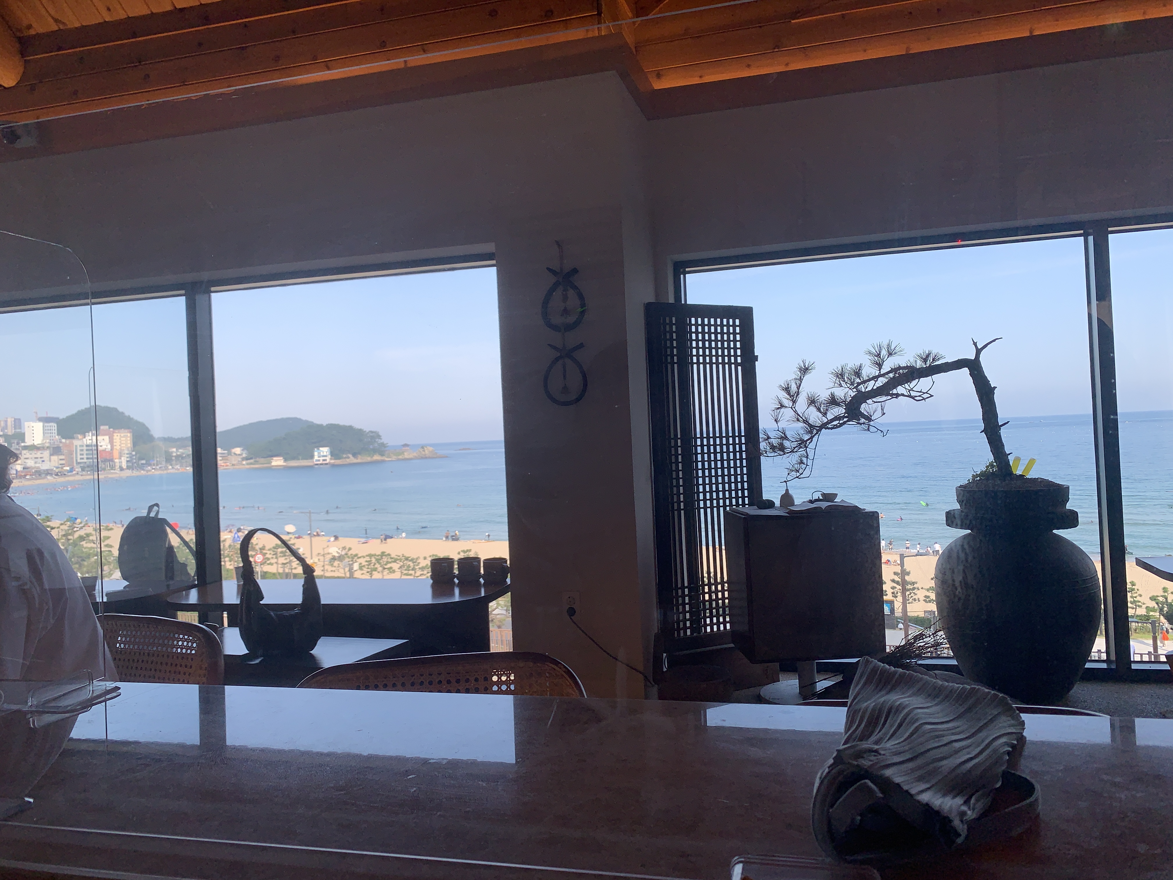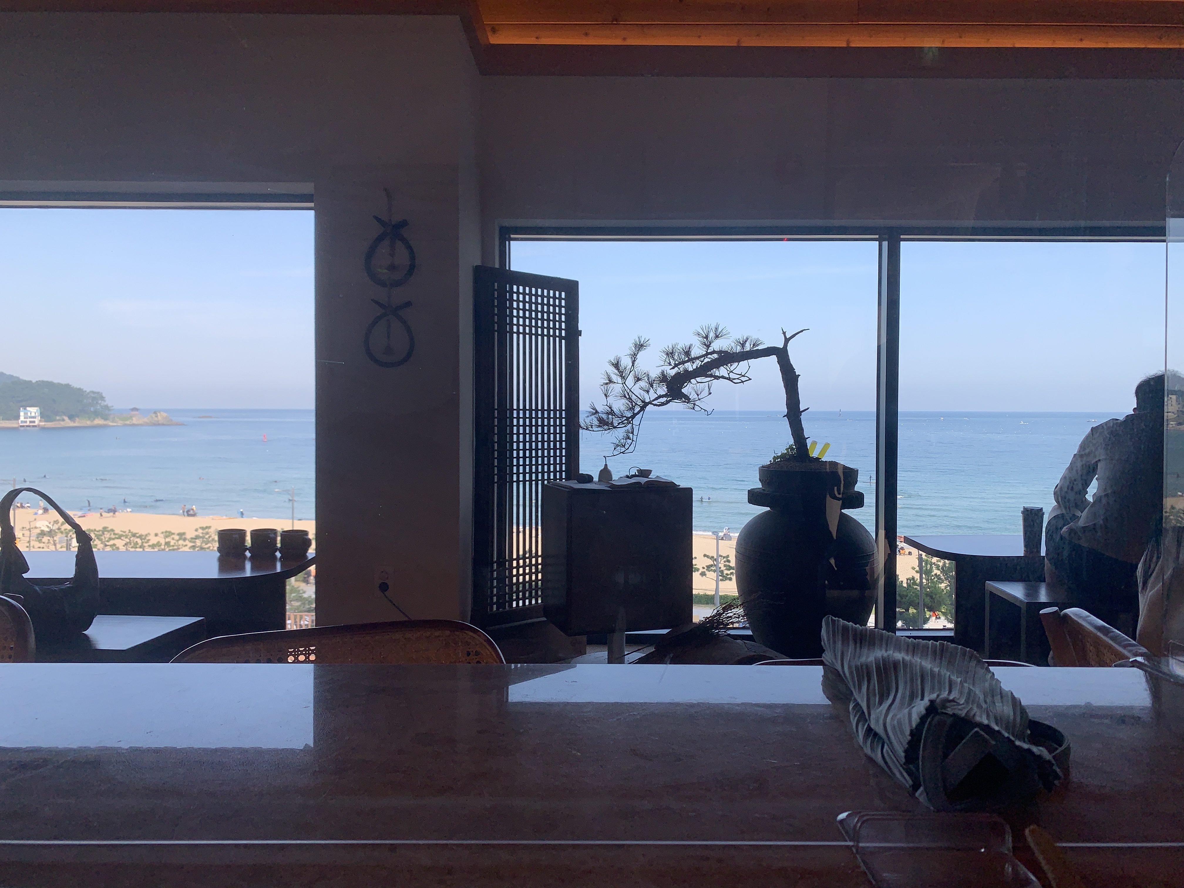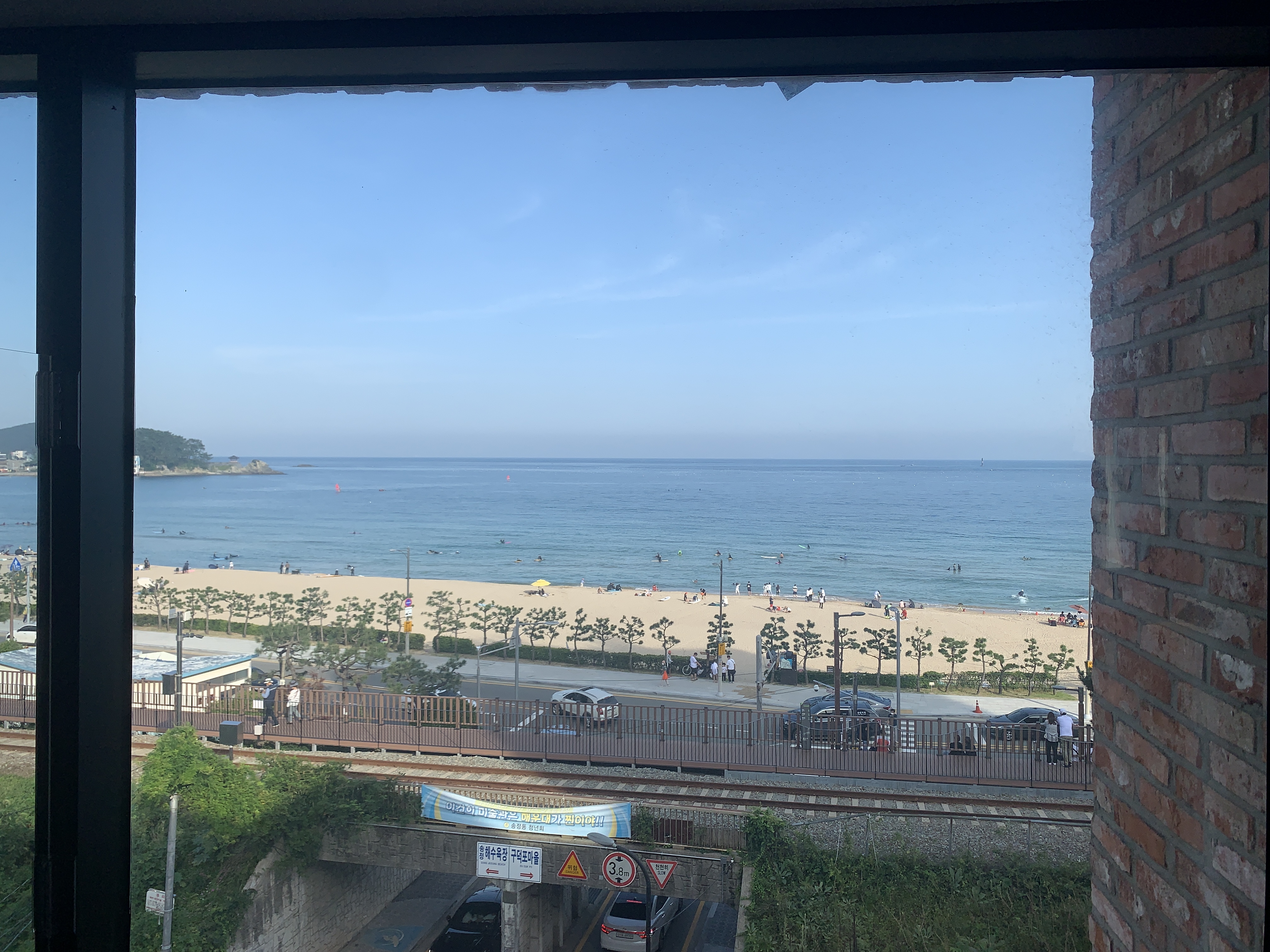 여기 창가에서 내려다보는 송정해변 뷰가 정말 멋지다.