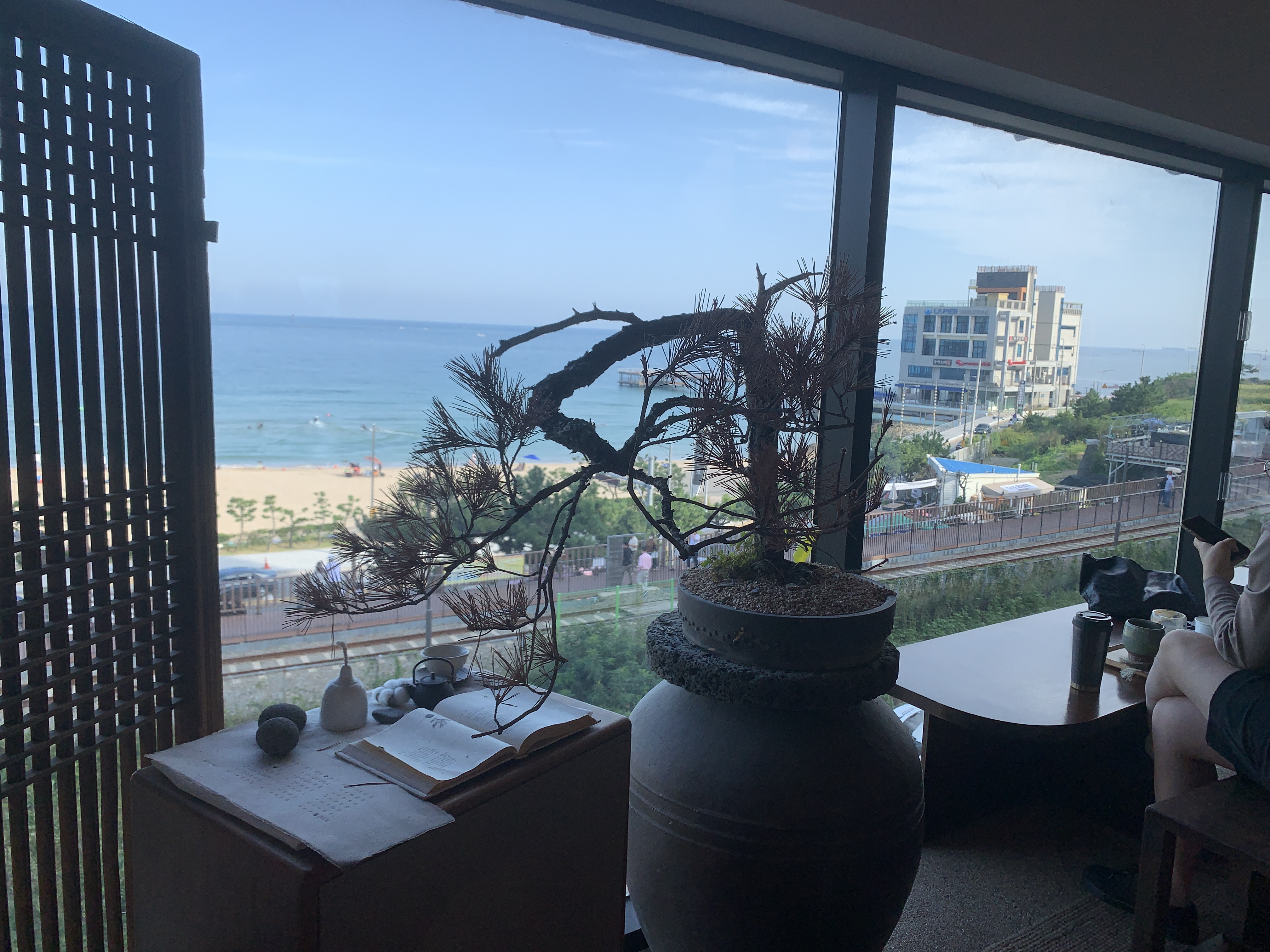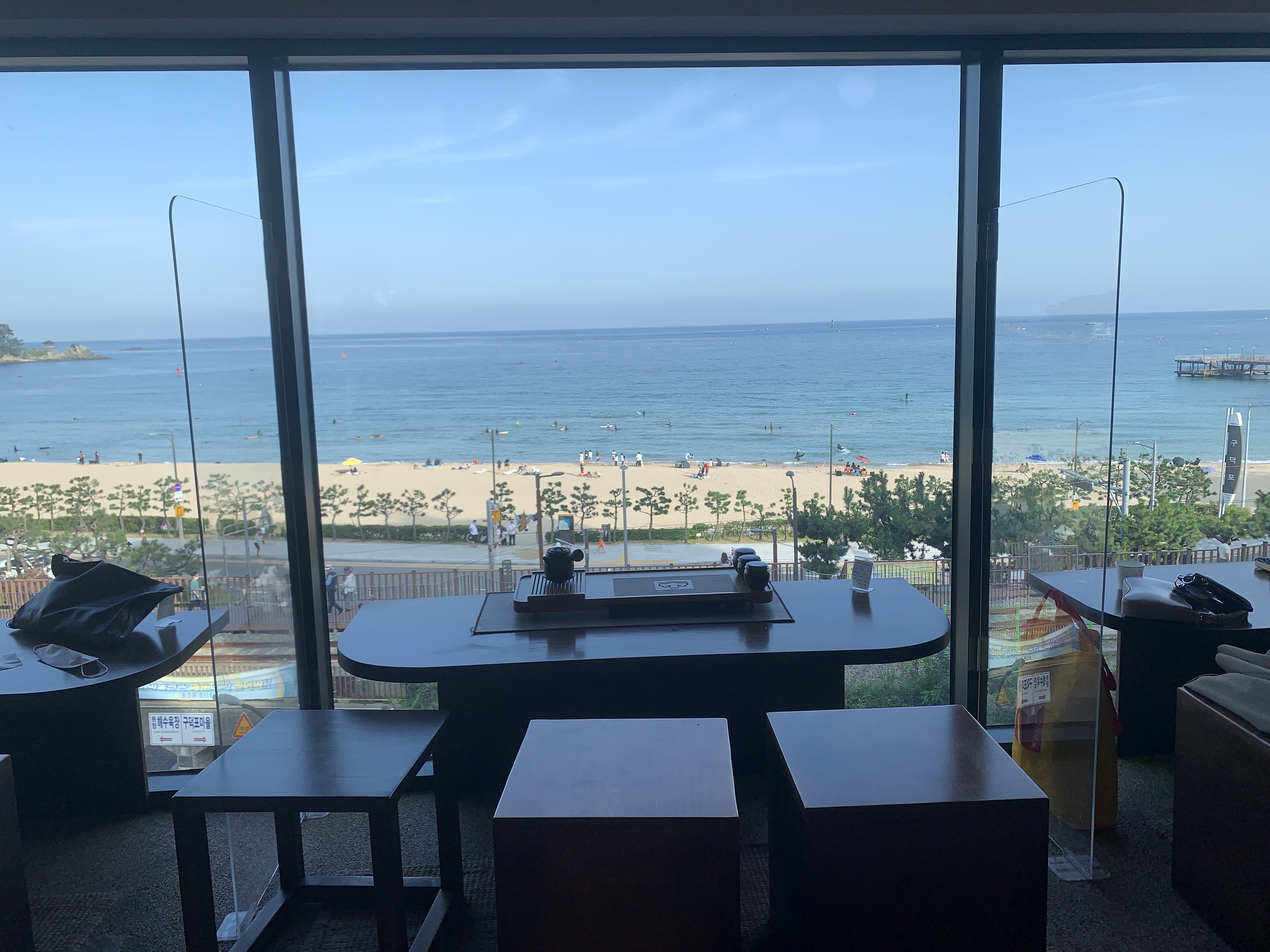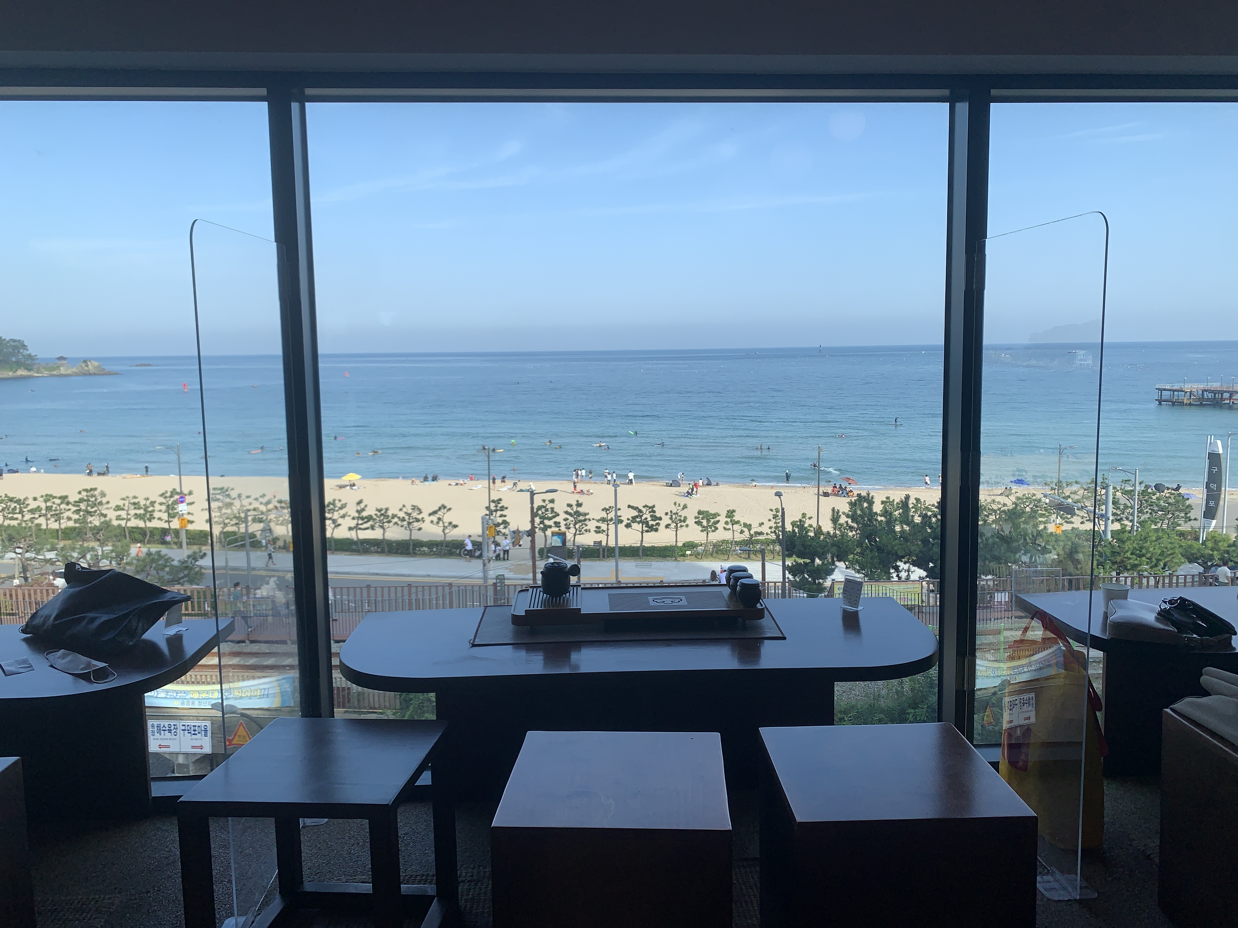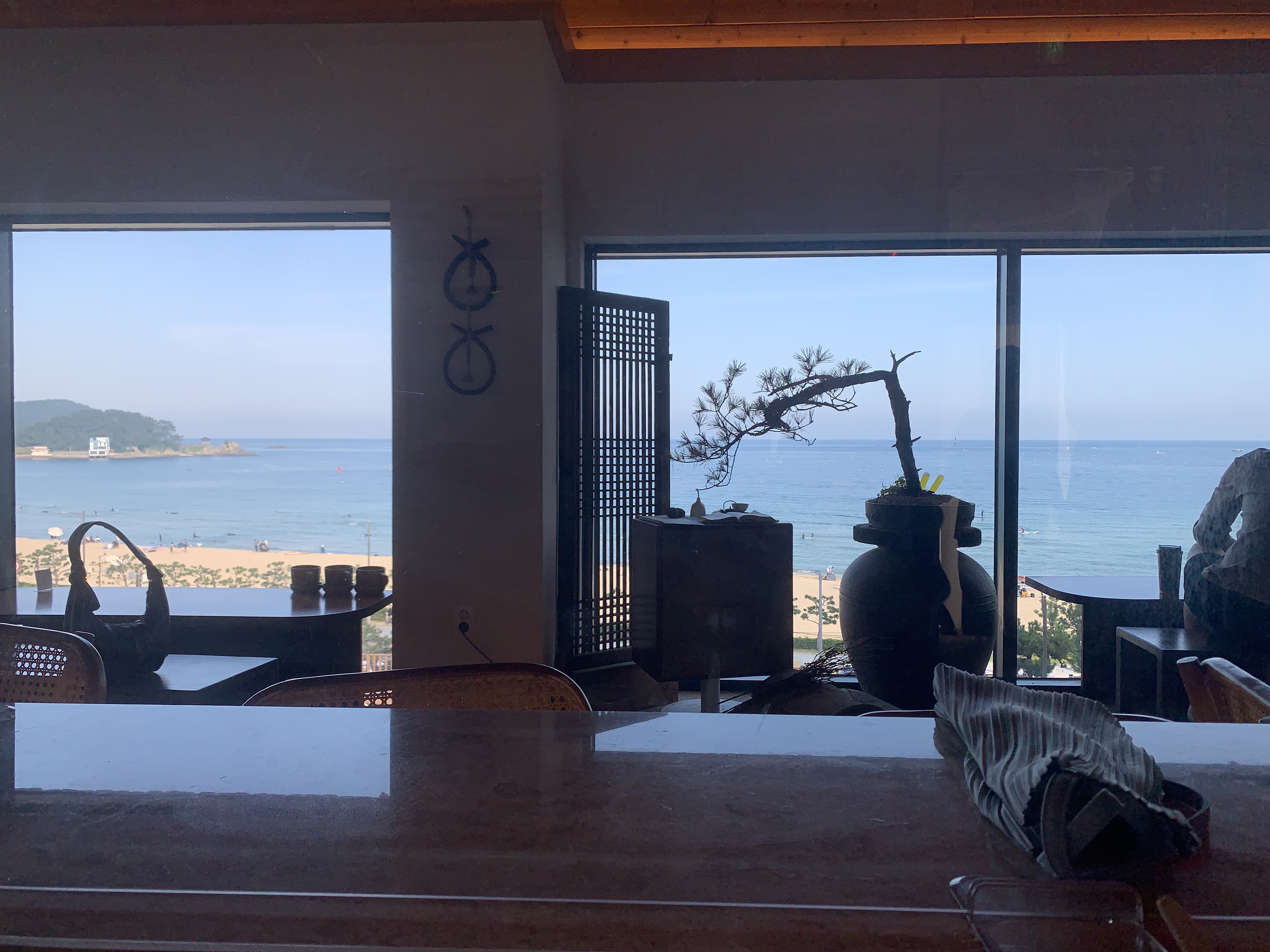 여기 창가에서 내려다보는 송정해변 뷰가 정말 멋지다.