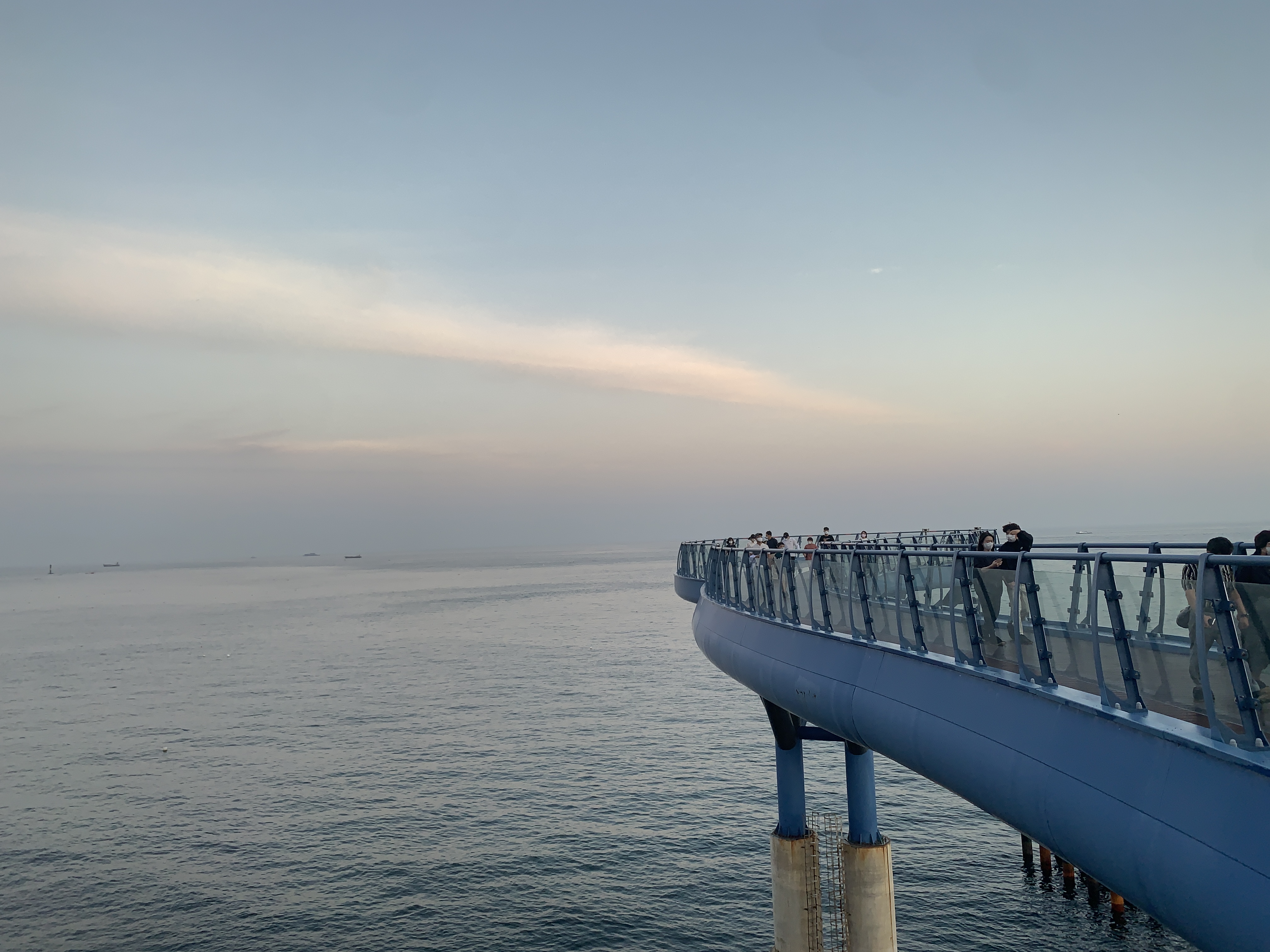 그렇게 커피를 마시고 블루라인 열차가 지나가는 산책길을 쭉 걸어서 해운대 쪽으로 이동했다. 슬슬 석양 지는 시간에 이런 뷰도 감상.
