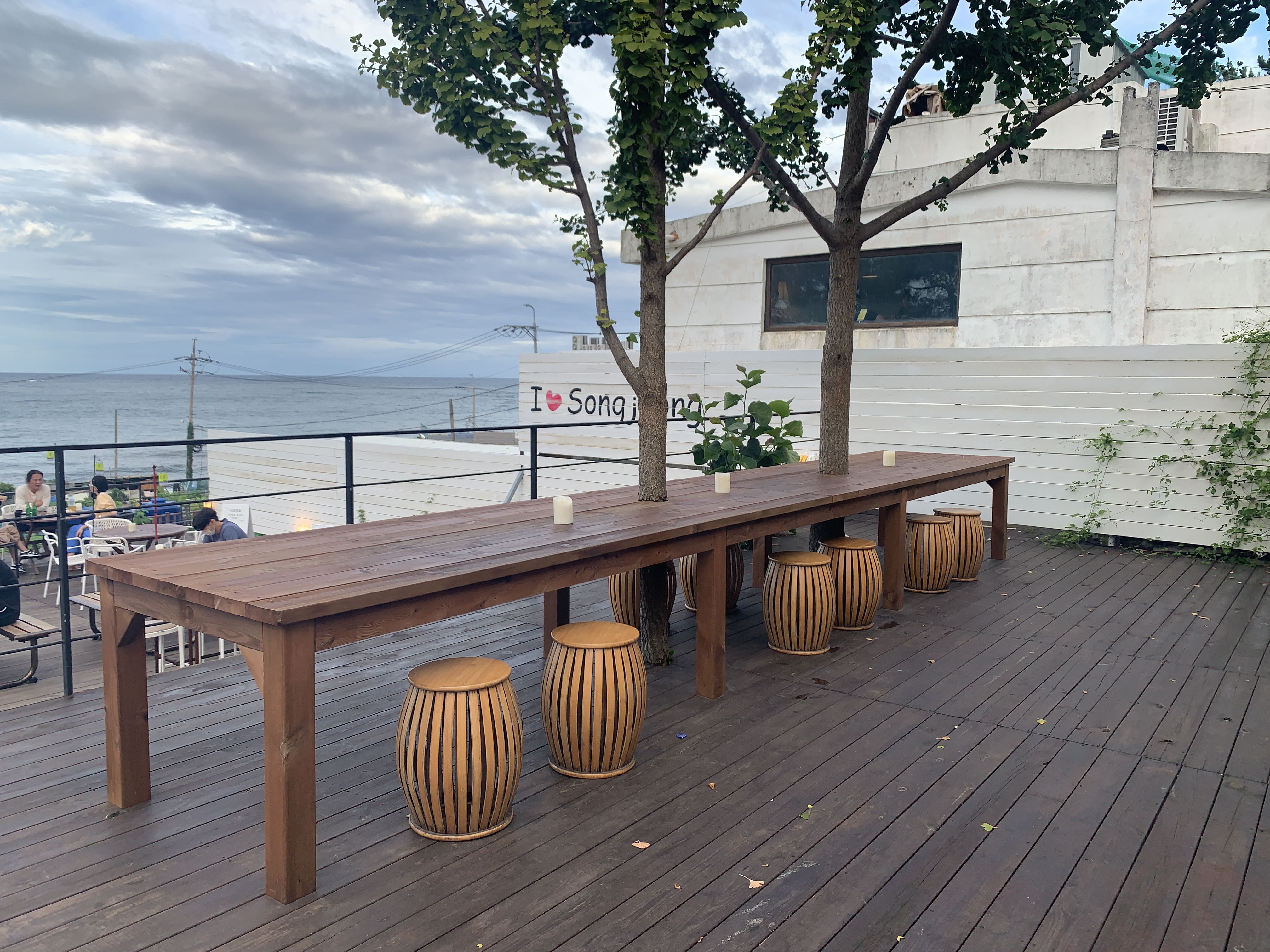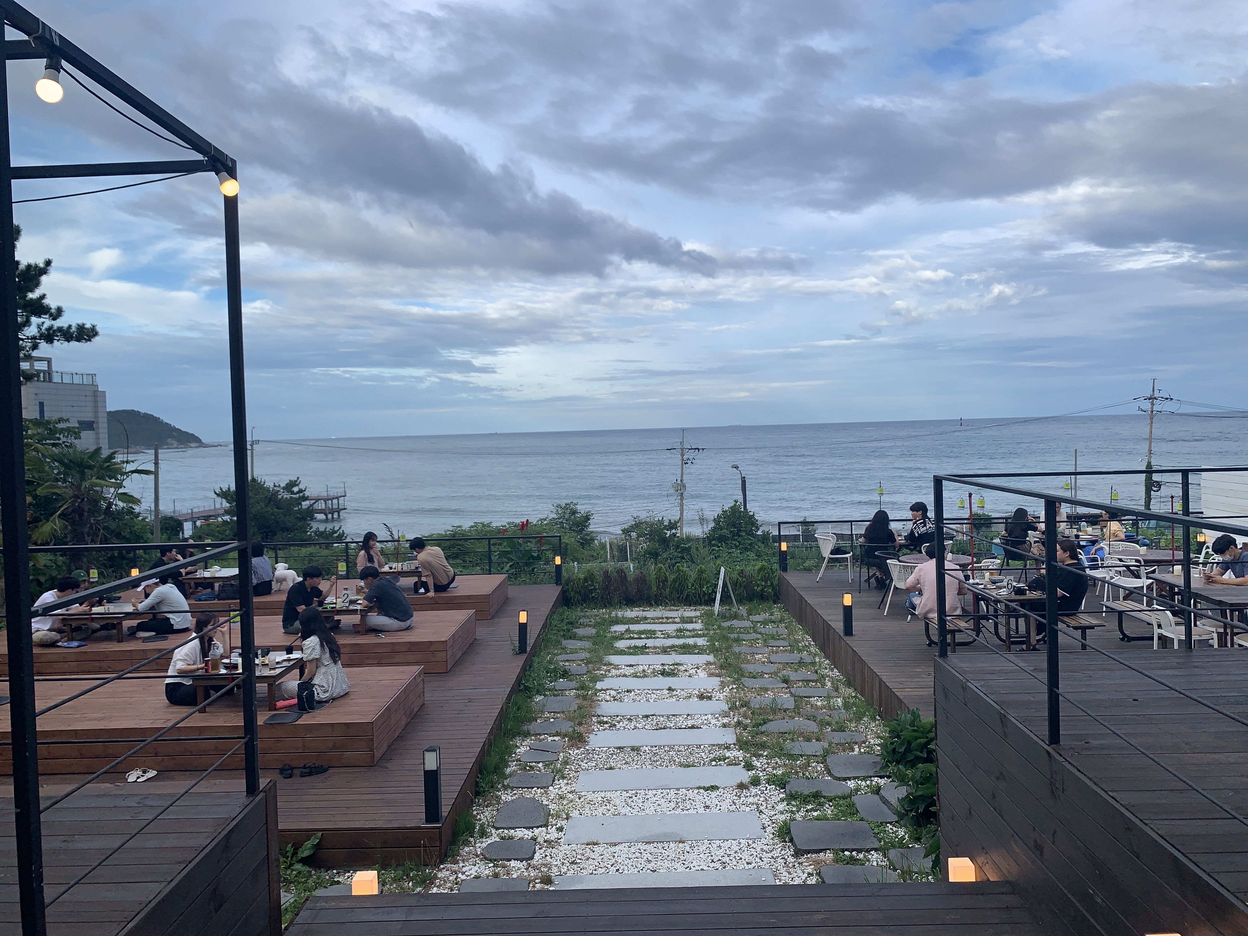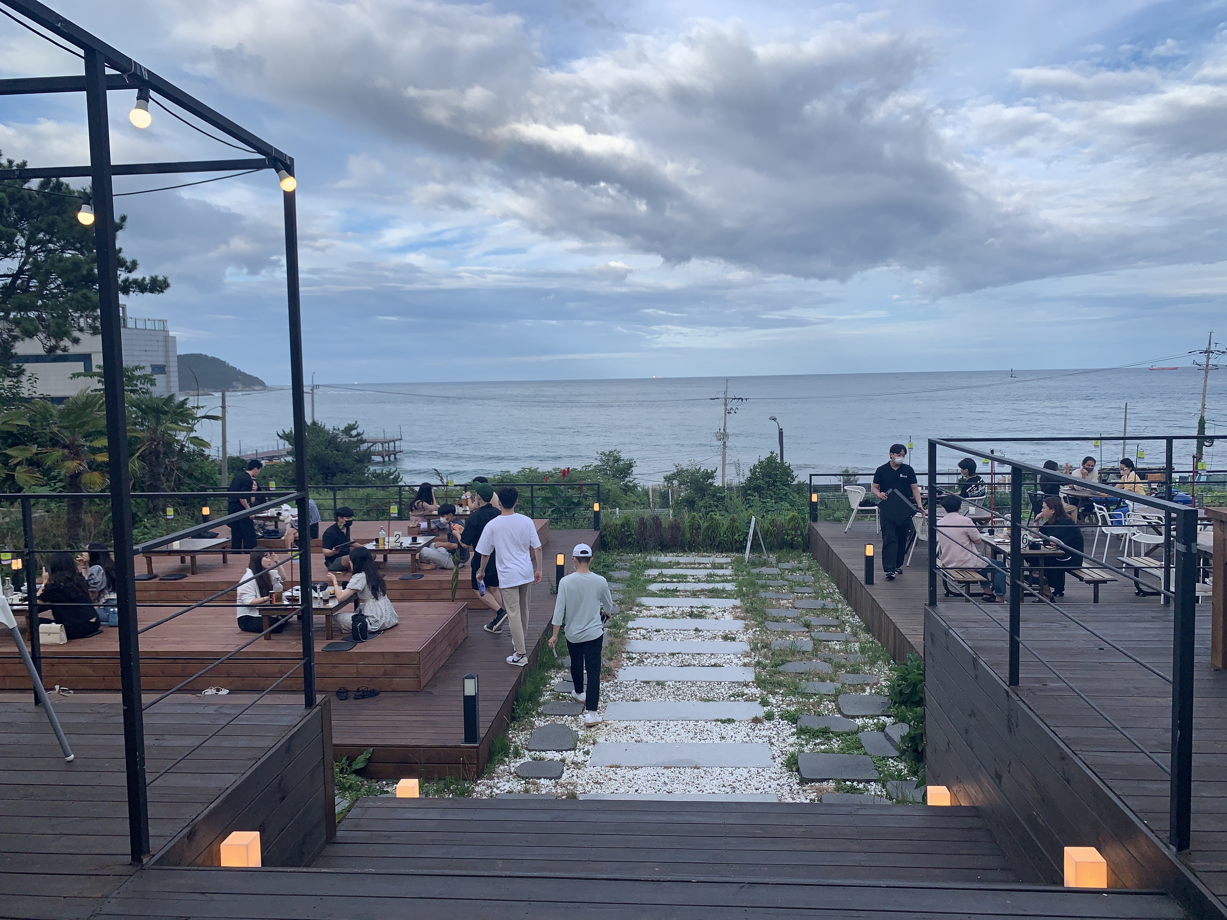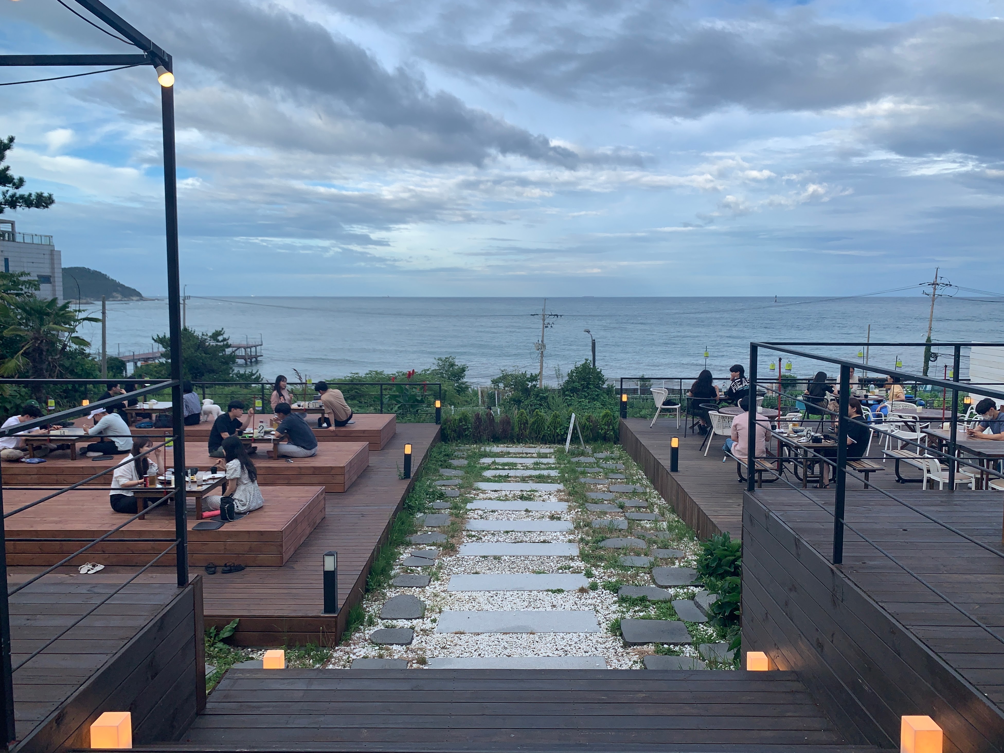 양쪽으로 식당 건물이 있고, 바다쪽으로 나가면 야외 테라스 자리가 있다.