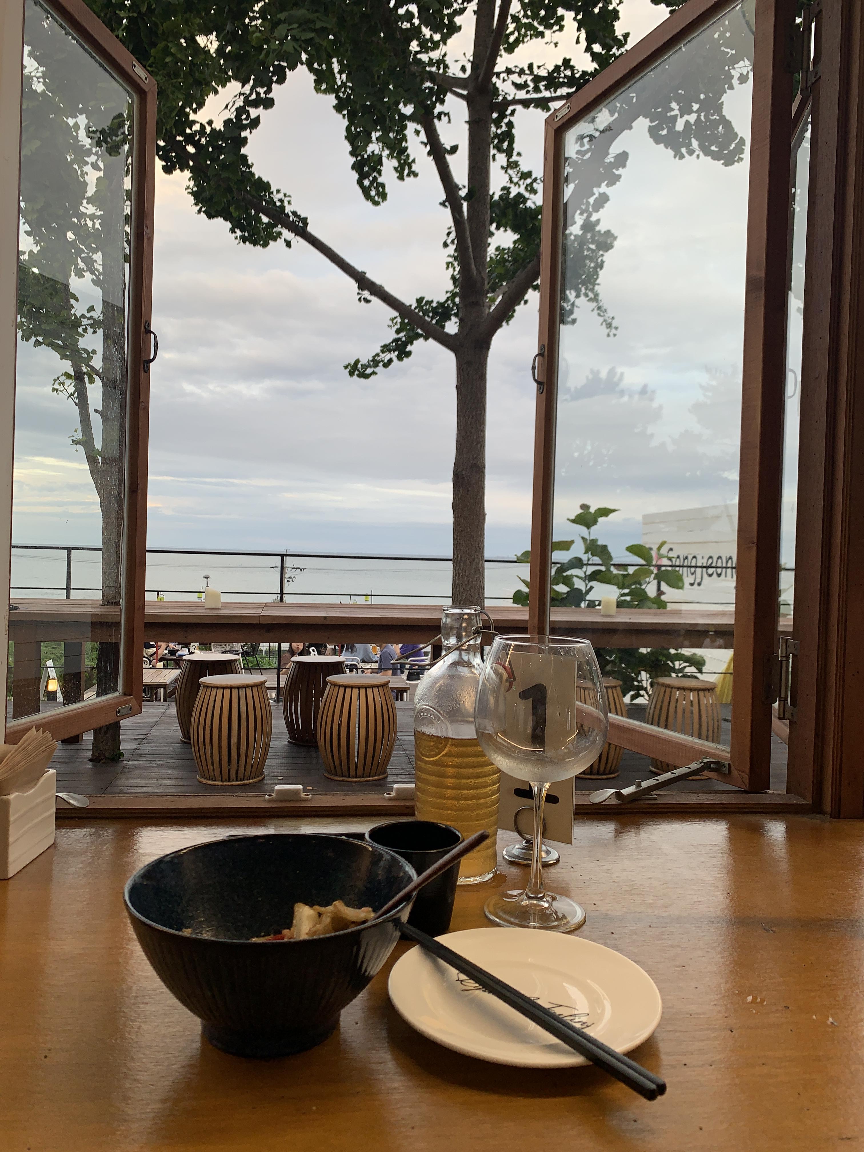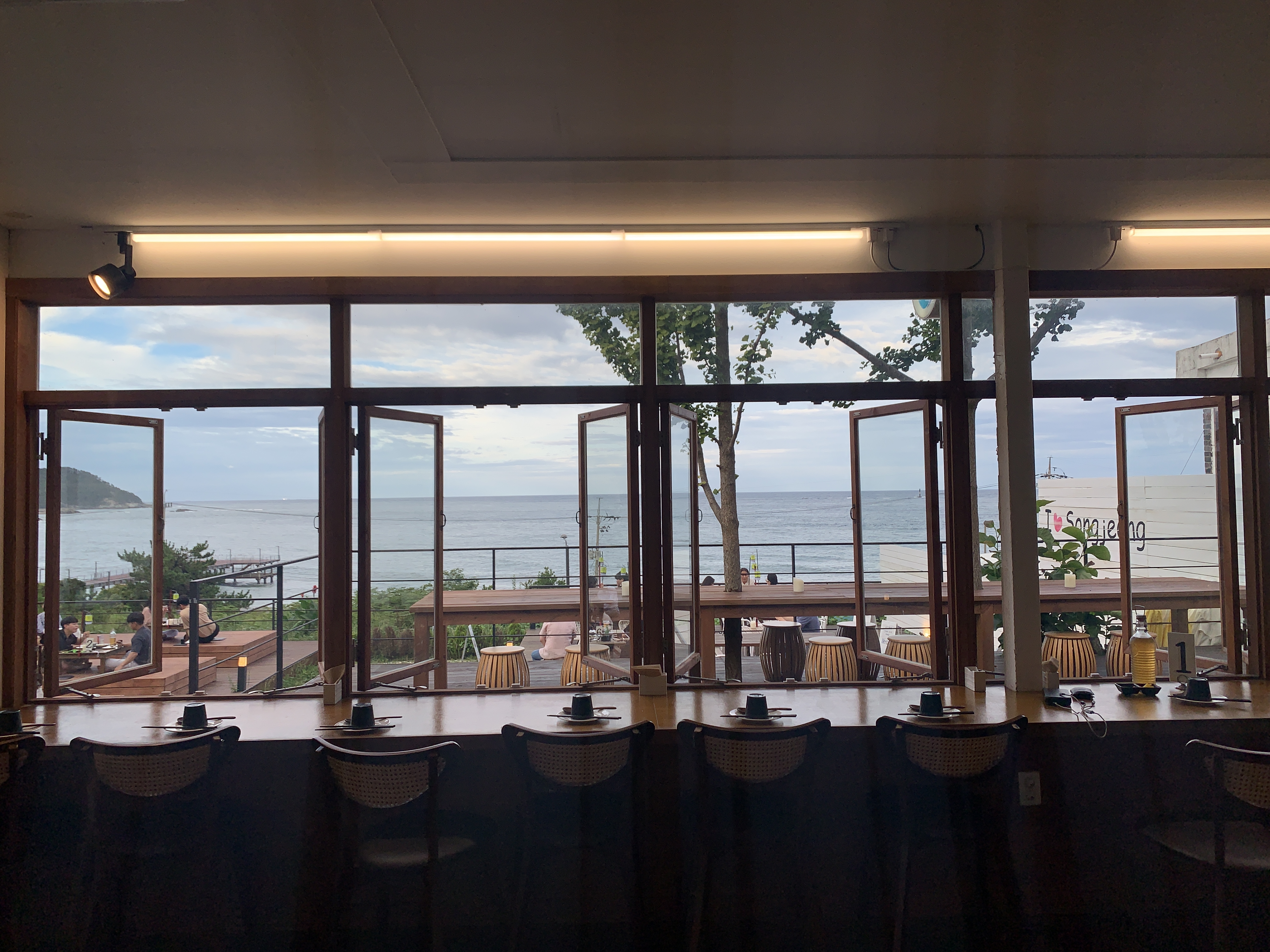 내가 앉았던 자리는 이런 식으로 생긴 곳인데, 여기도 나름 창문이 하나의 프레임처럼 보여서, 창 밖으로 보이는 오션뷰가 정말 이쁘다.