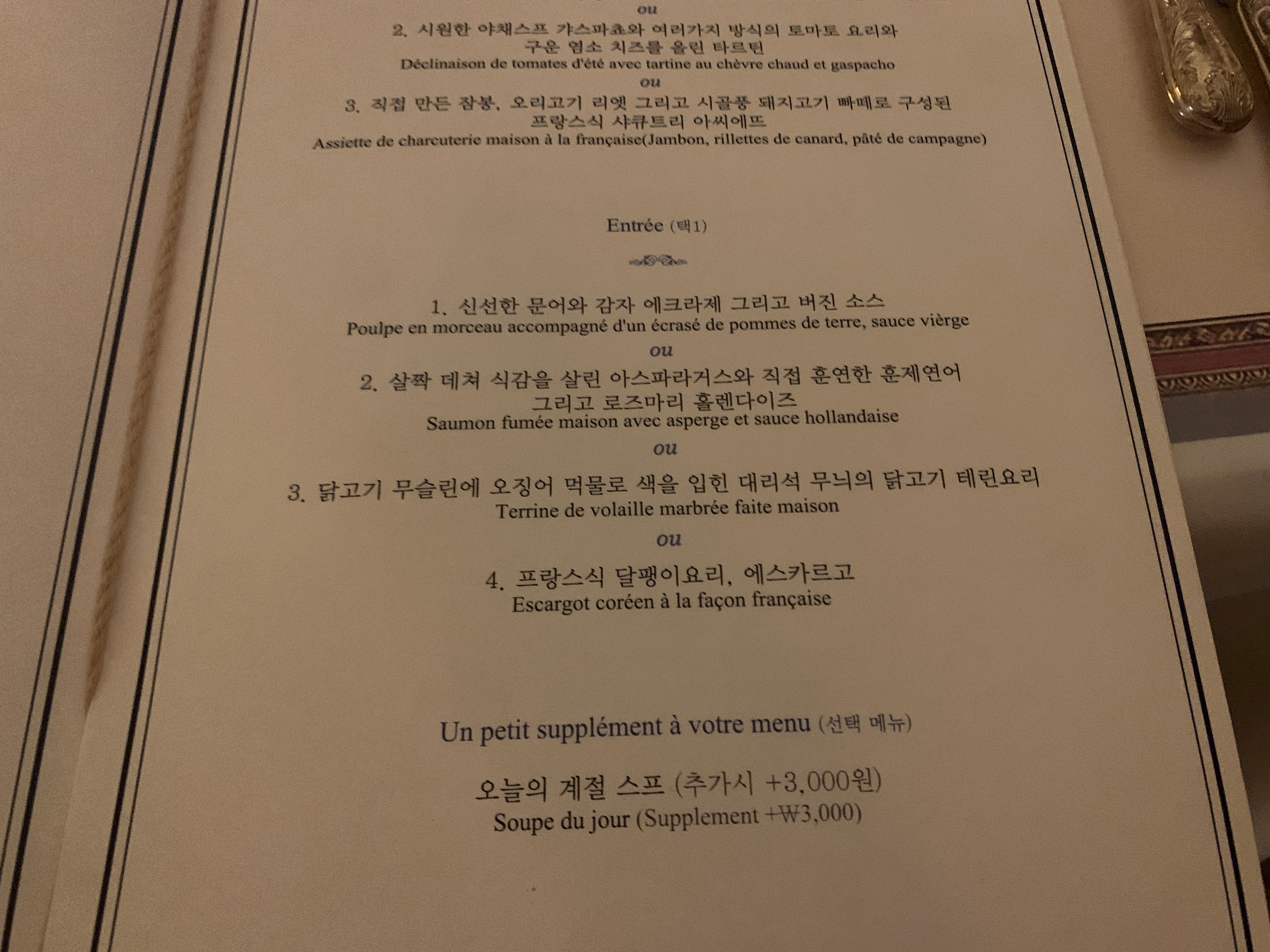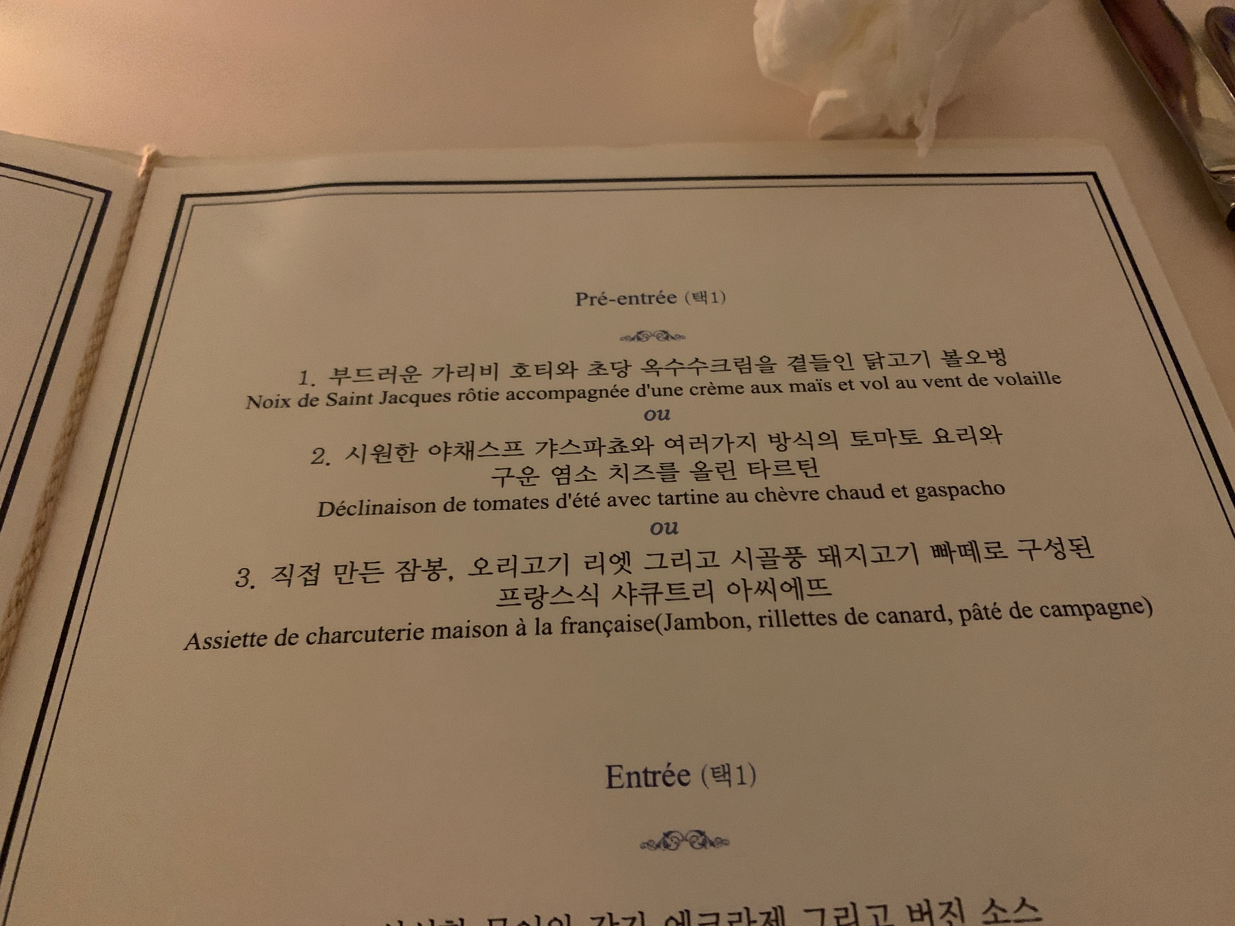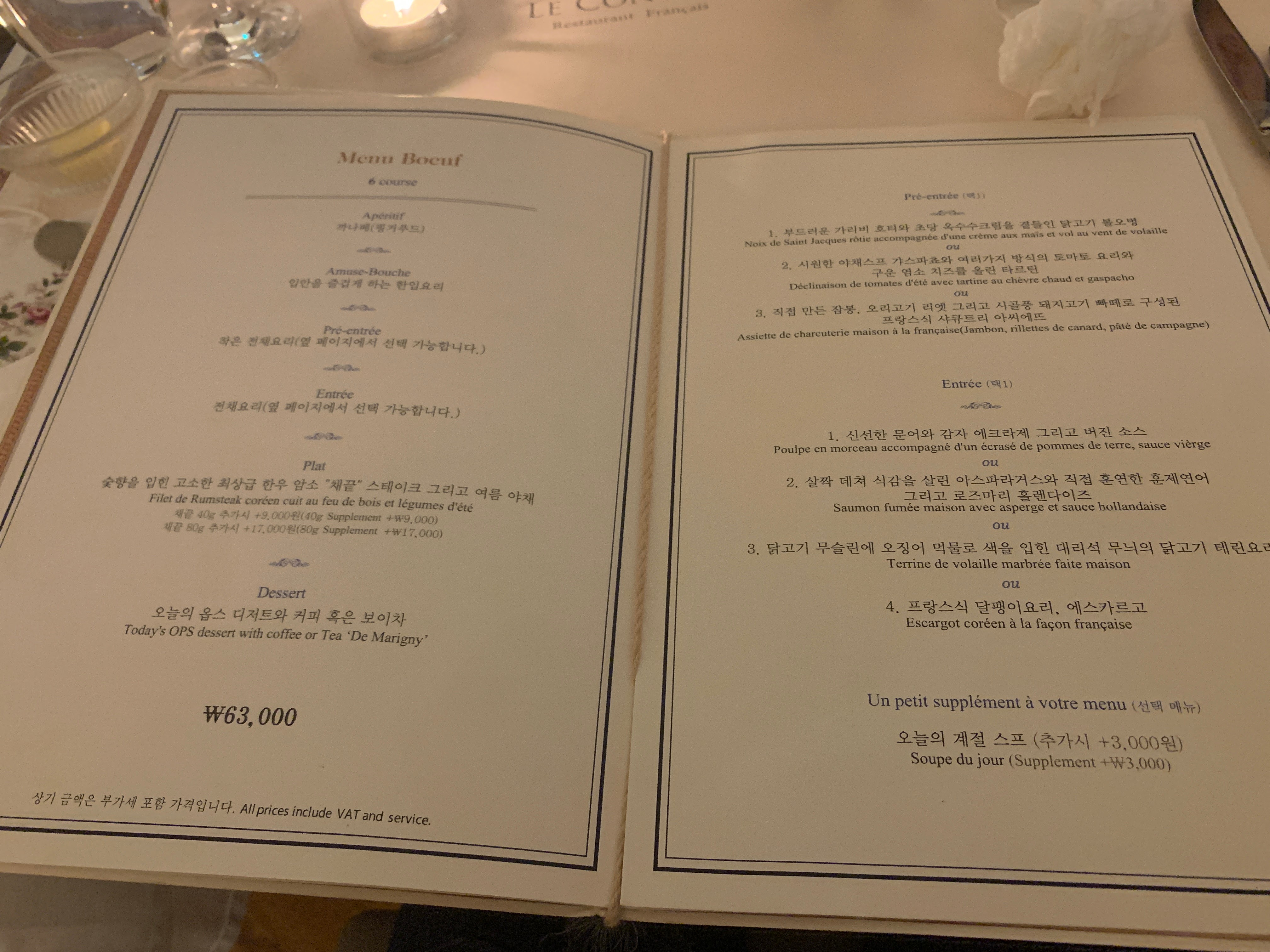 이렇게 코스로 나오는 요리의 가격이 약 7만원 정도. 비싸다면 비싸고 저렴하다면 저렴한 가격일 수 있는데, 사실 부산 한복판 센텀에서 먹는 프렌치 요리라고 생각하면 일단 나쁘지는 않다.