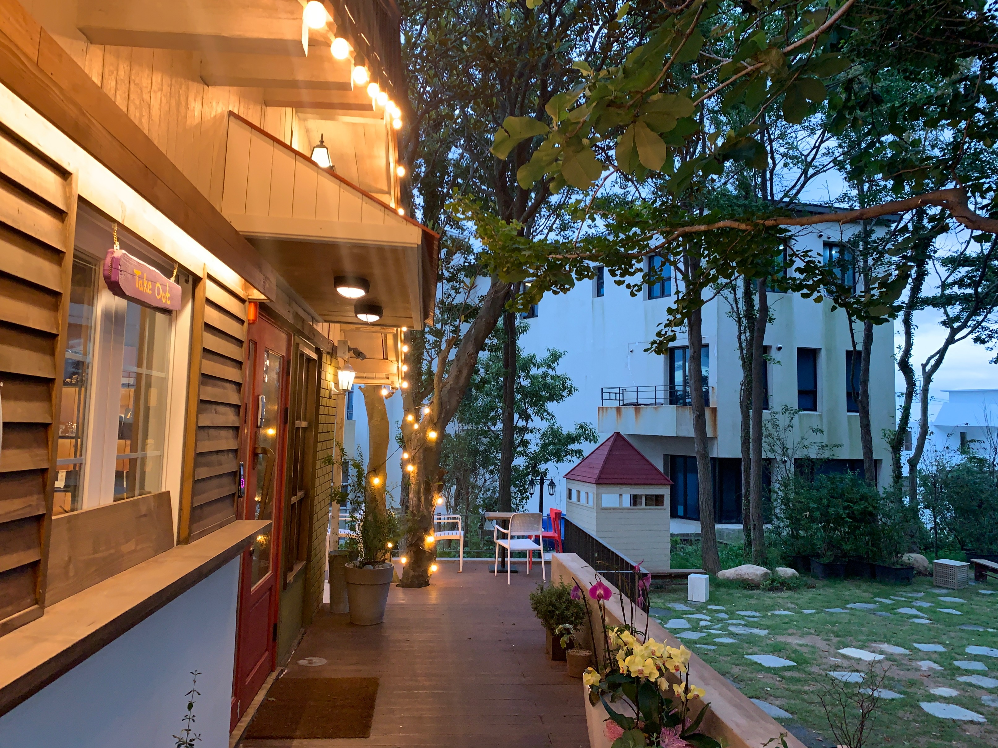 따뜻한 불빛, 나무, 그리고 오두막 같은 카페 건물이 잘 어우러져 있는 곳이다.