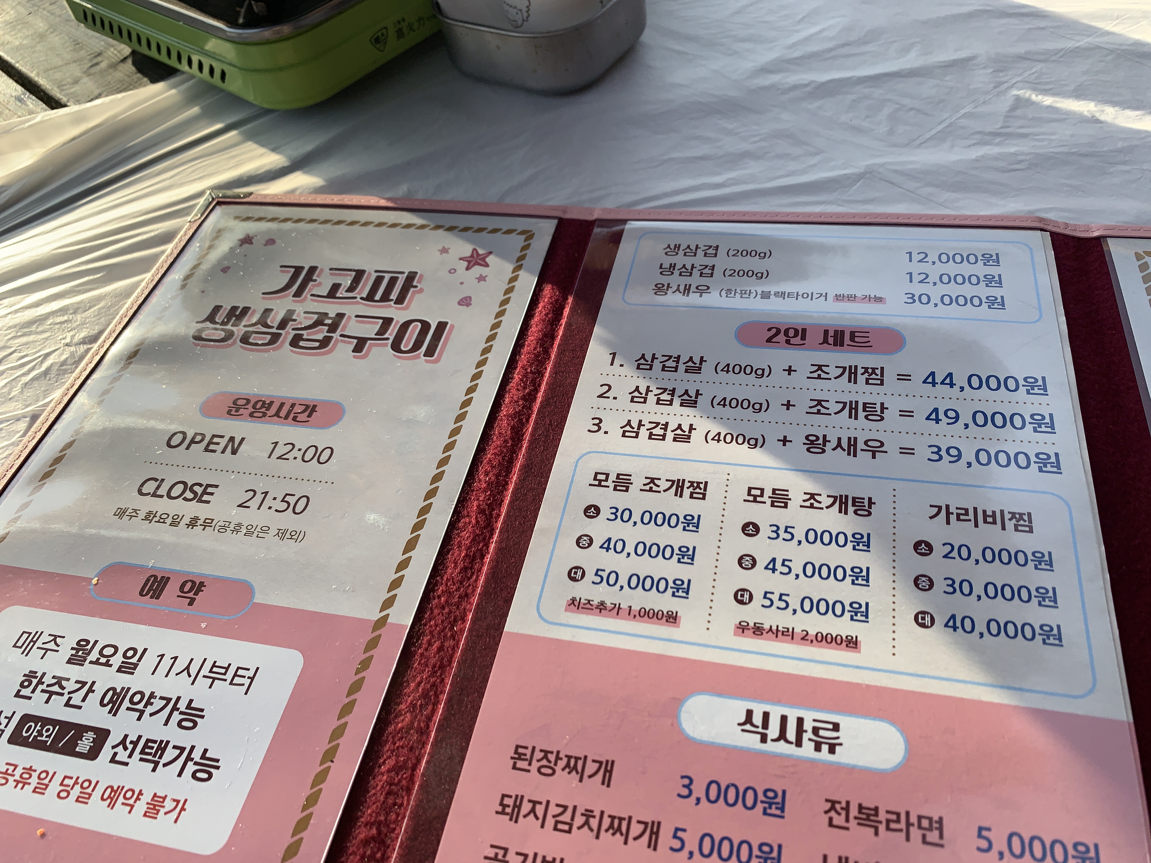 삼겹살과 조개찜 조개탕 세트 메뉴가 있는데 우리는 그냥 간단하게 삼겹살만 시켰다.