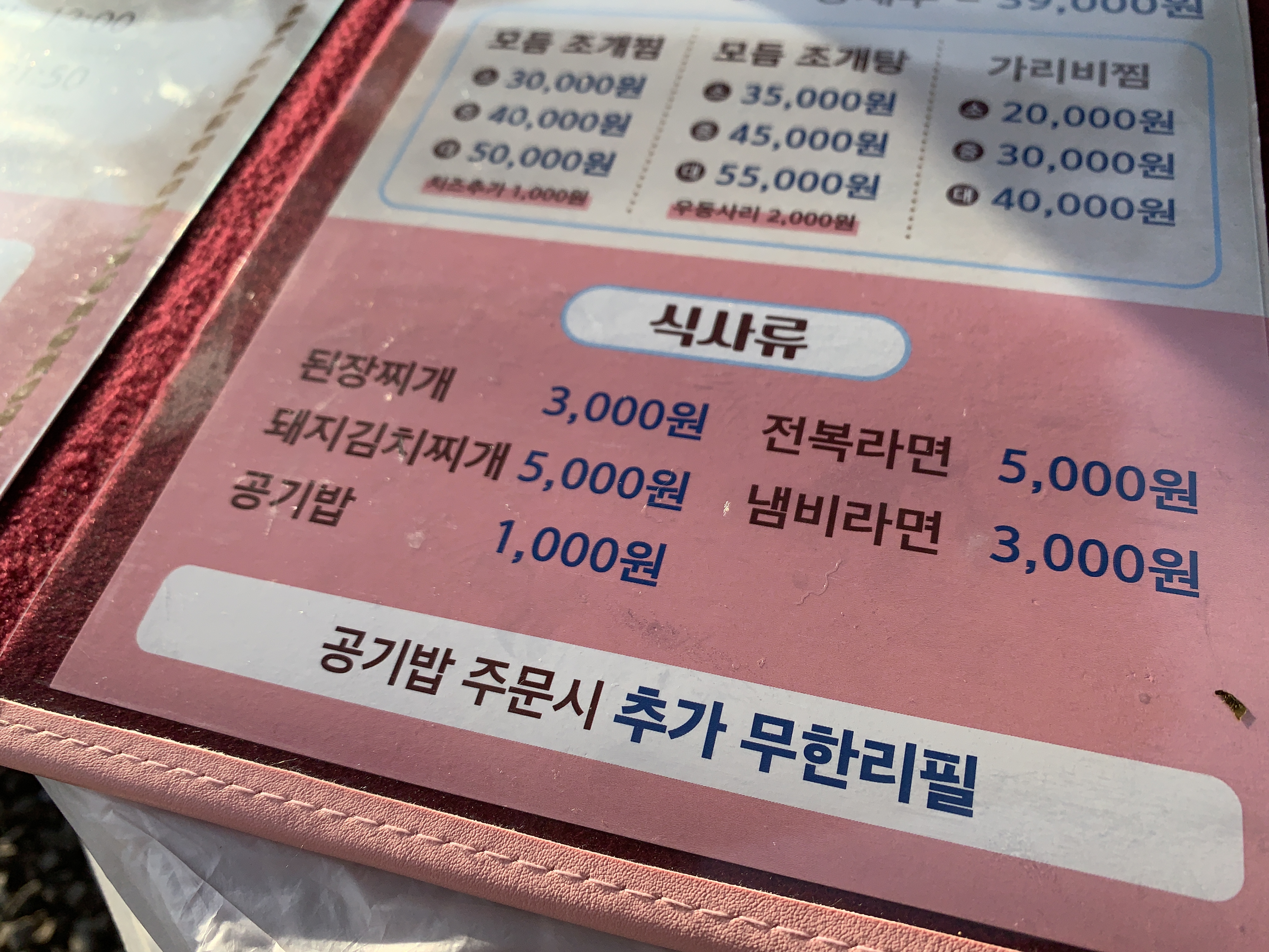 식사는 된장찌개 3천 원, 라면 3천 원, 전복 라면 5천 원으로 나중에 고기를 먹고 난 뒤에 후식으로 먹기에 좋은 가격이다.
