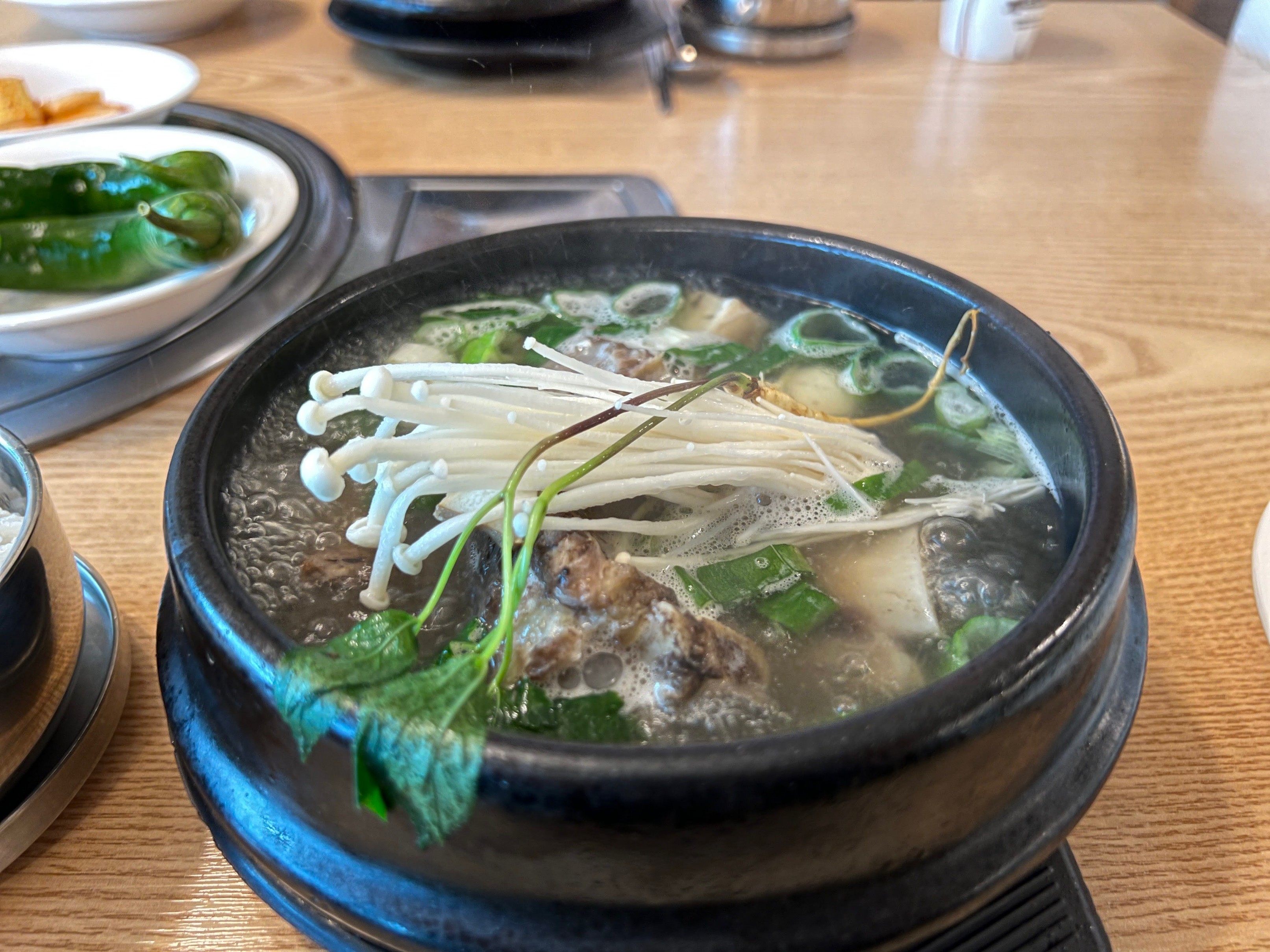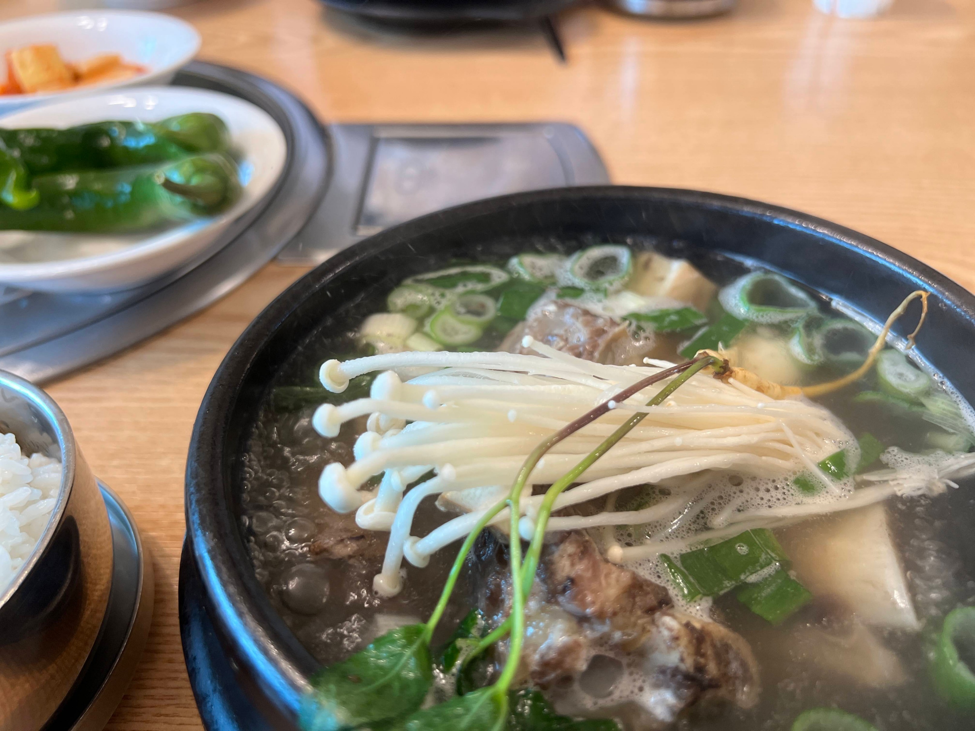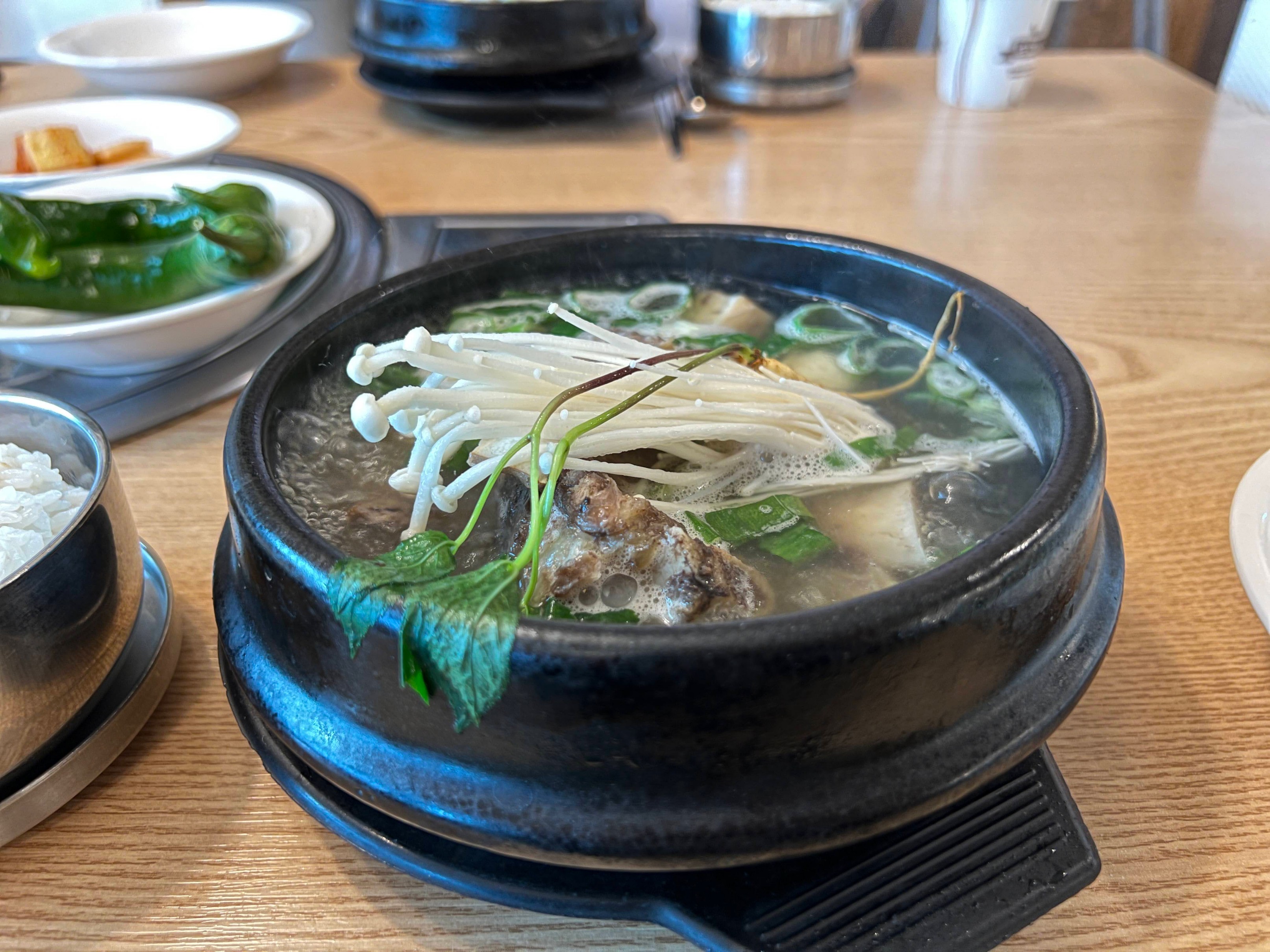 대신 위에는 작은 인삼이 하나 얹어져 있어서 이 인삼을 하나 먹고 입가심으로 하고 갈비탕을 본격적으로 먹기 시작하면 된다