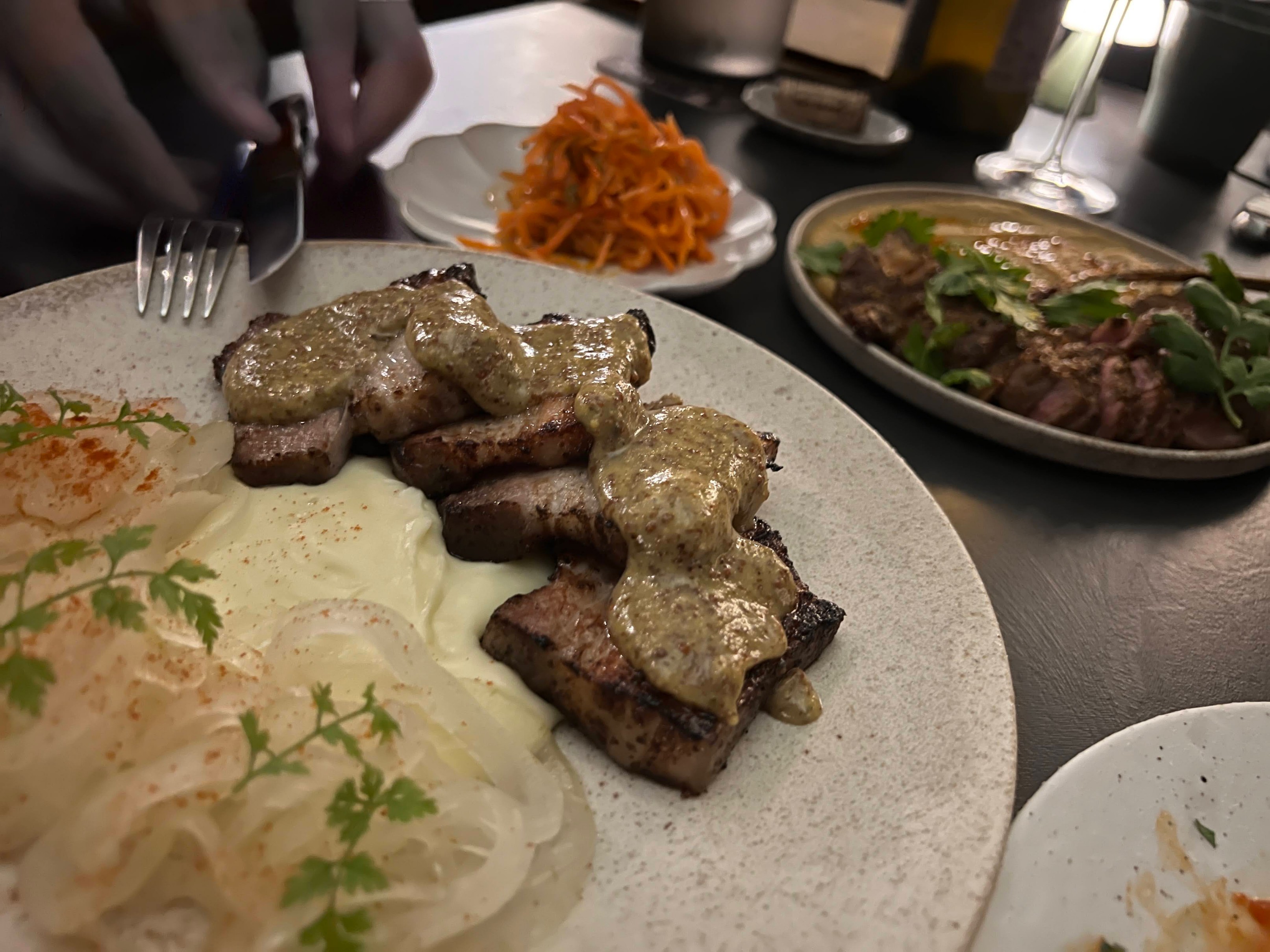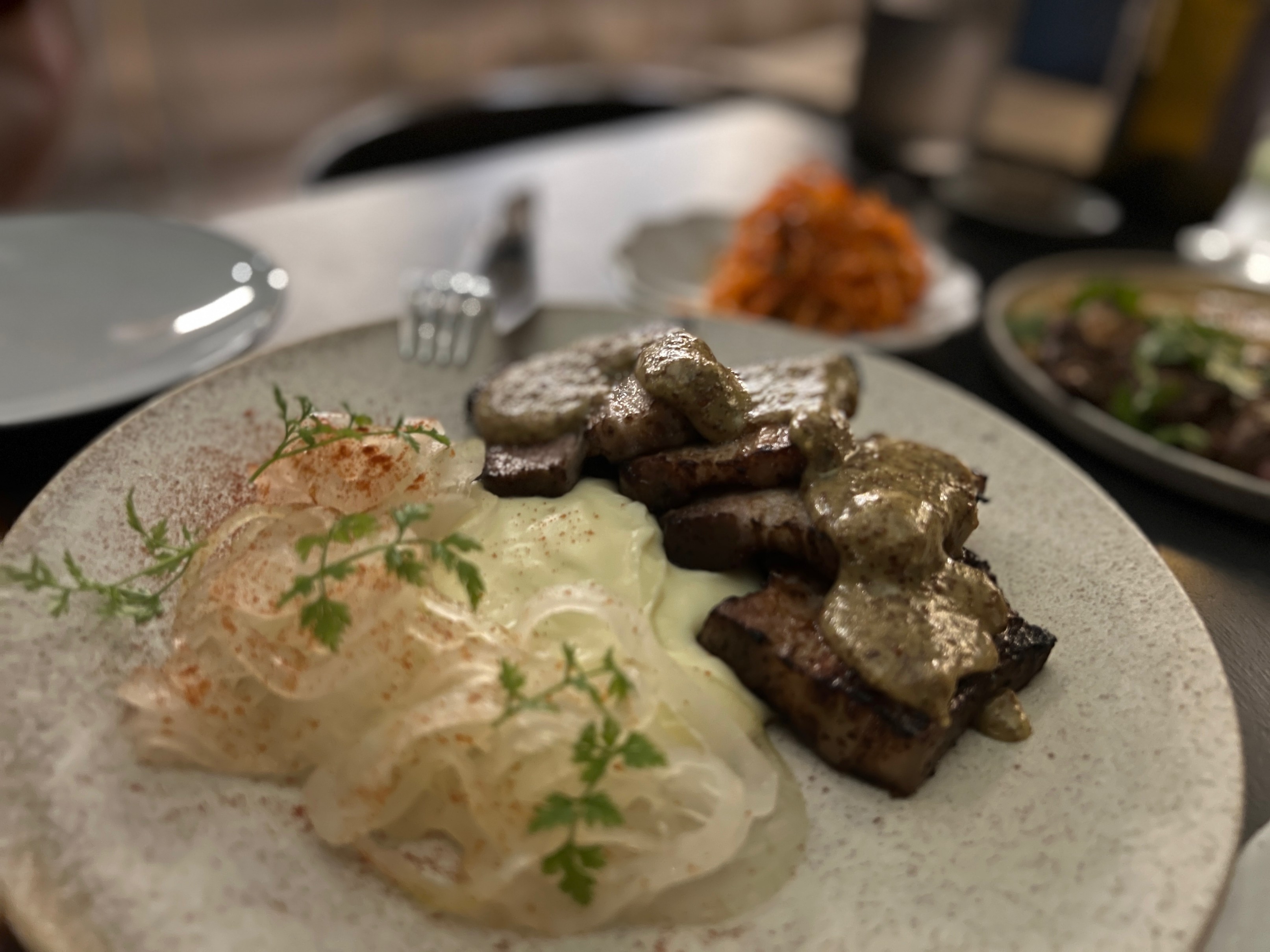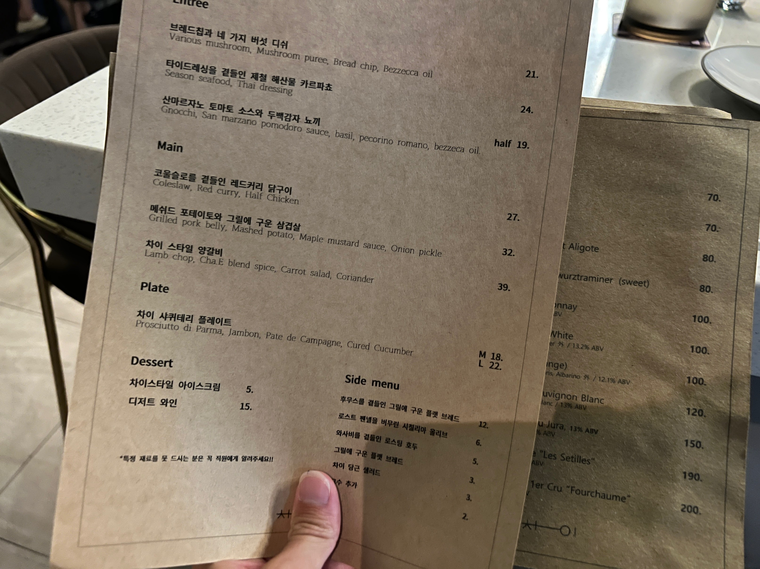 우리는 남자 세 명이서 갔는데 저기 메인 메뉴에 있는 메쉬드 포테이트와 그릴에 구운 삼겹살, 차이 스타일 양갈비 그리고 토마토 소스와 두뼉감자 뇨끼를 주문했다.