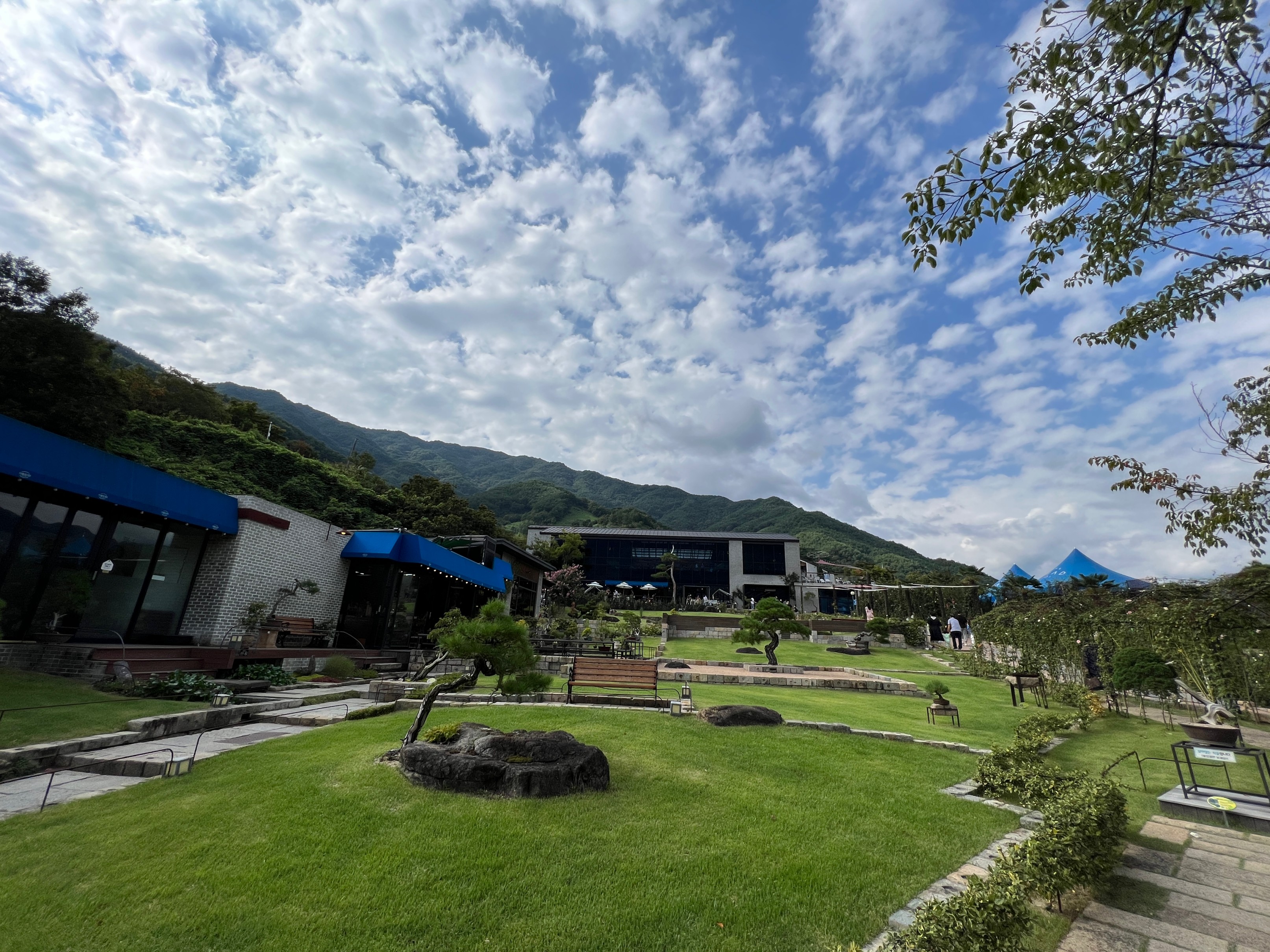 그렇게 입구로 들어가면 잘 꾸며진 정원과 뒤편에 카페 건물이 보인다.