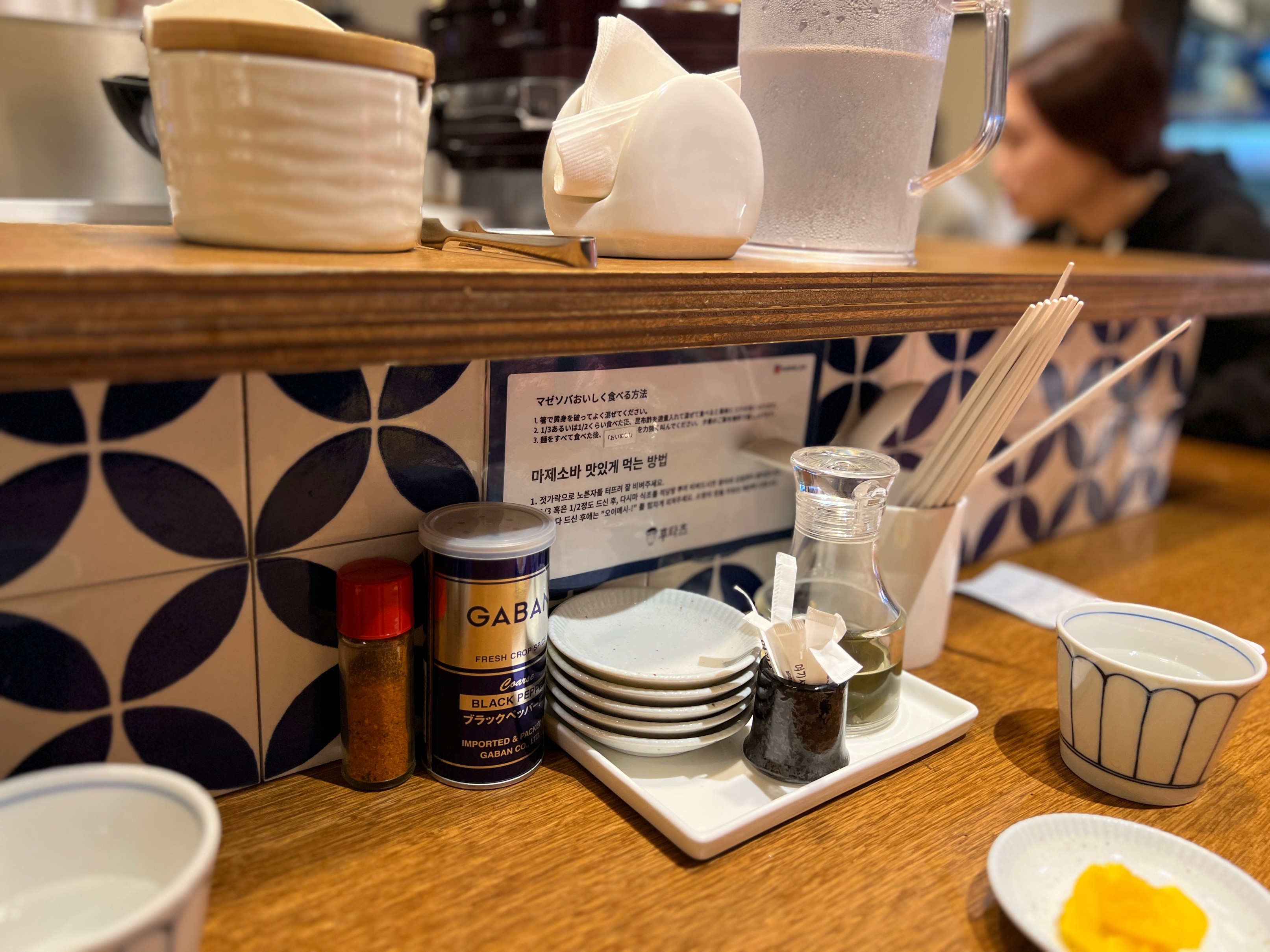 마제소바를 맛있게 먹는 법이라고 하는데, 처음에는 일단 비벼서 먹다가 나중에 절반 정도 먹었을 때 다시마 식초를 살짝 부어서 먹으면 향이 또다시 확 올라온다고 한다.