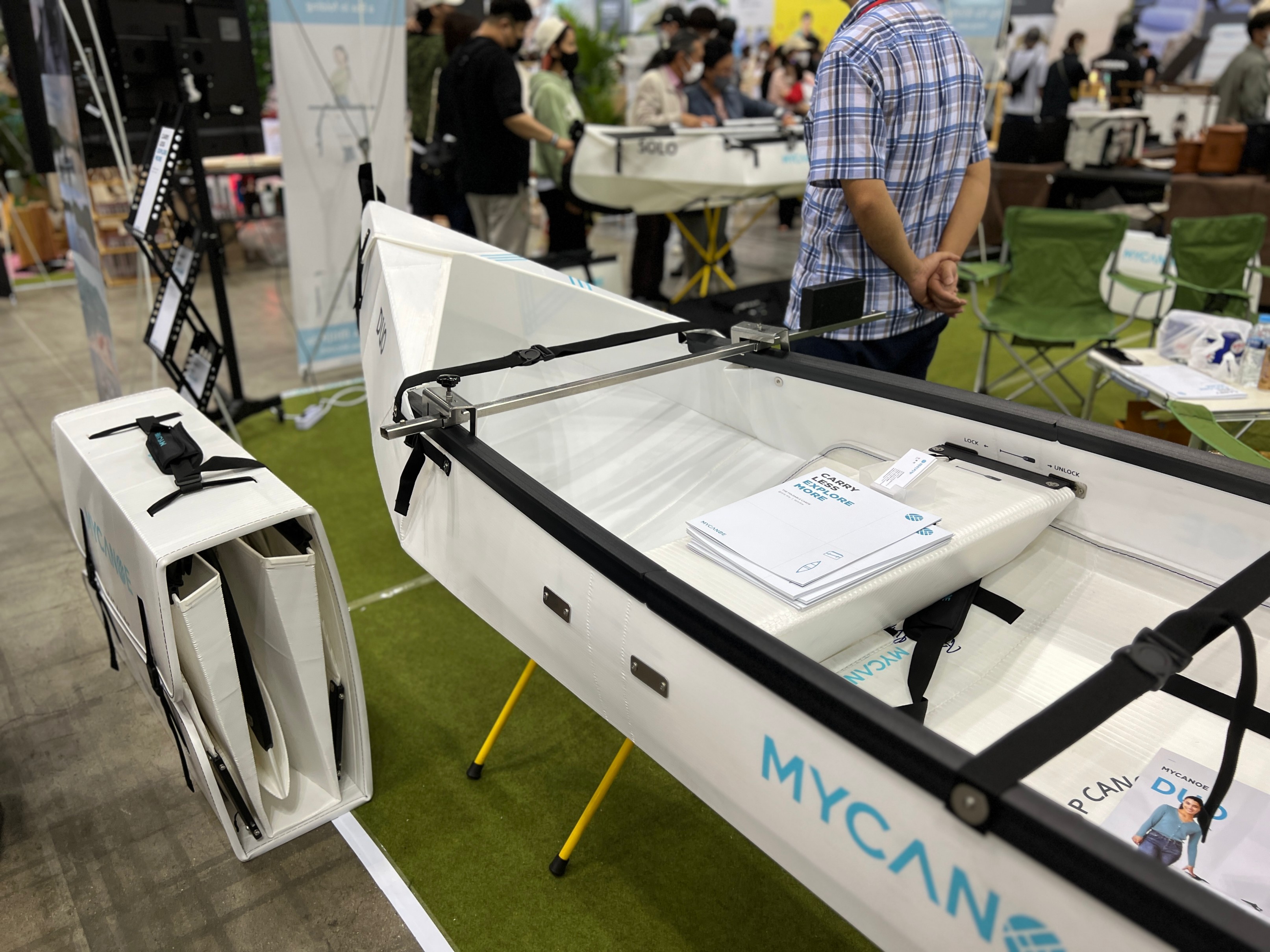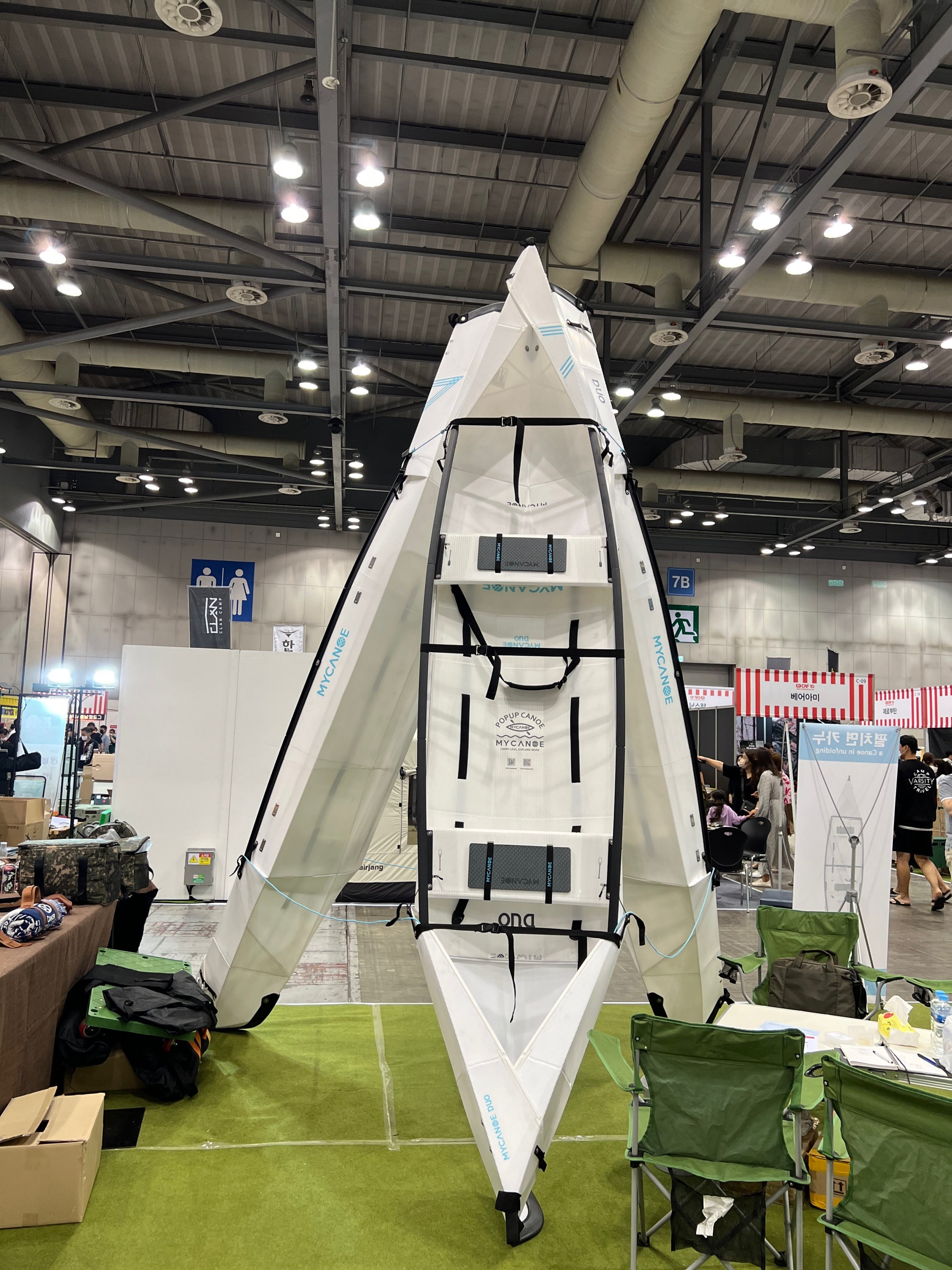캠핑을 하면서 쓸 수 있는 접이식 보트고 전시가 되어 있습니다