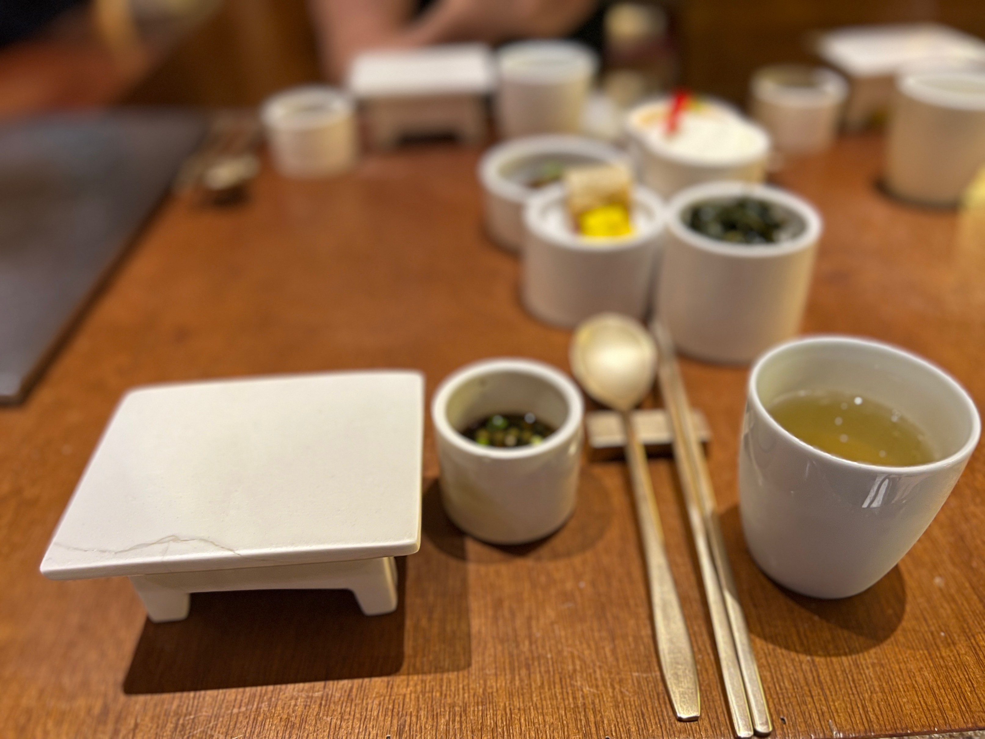 이런 식으로 우리 접시에 하나씩 올려주시는데 이거를 소금을 찍어 먹어도 되고 아니면 양념을 찍어 먹어도 된다.