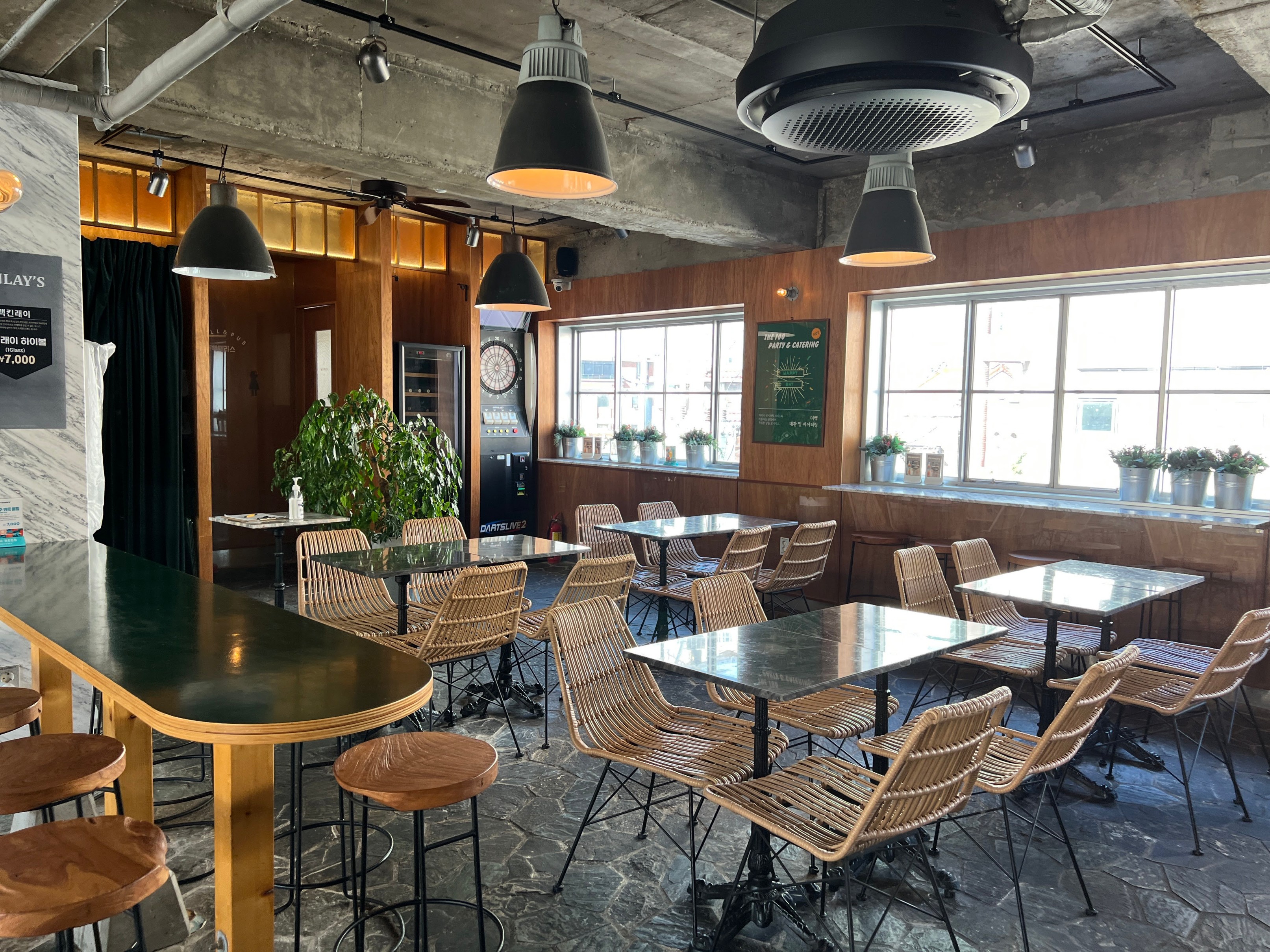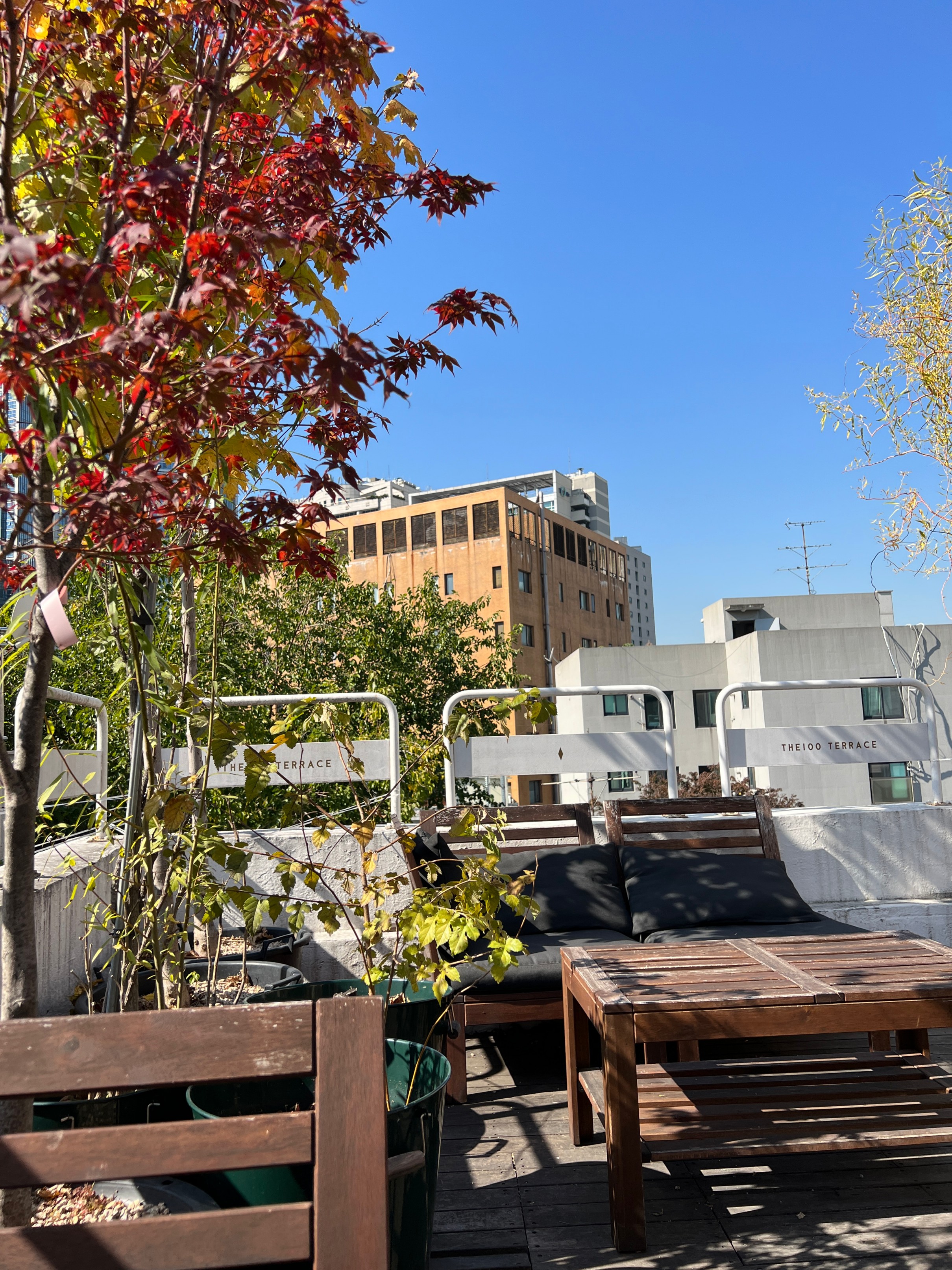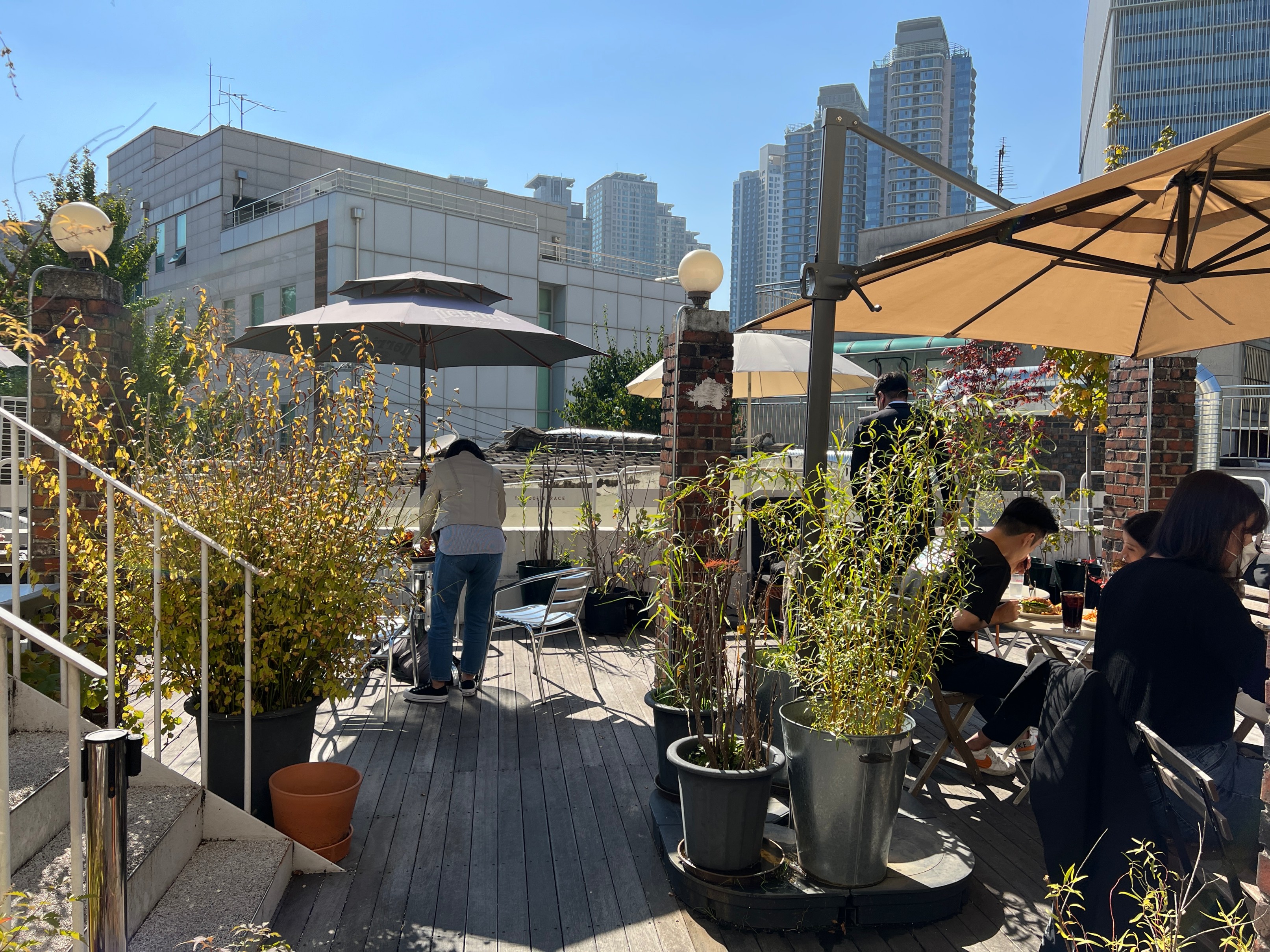 바깥 테라스에는 테이블이 6개 정도 있고 하나 더 위로 올라가면 옥탑에도 테라스가 더 있다.