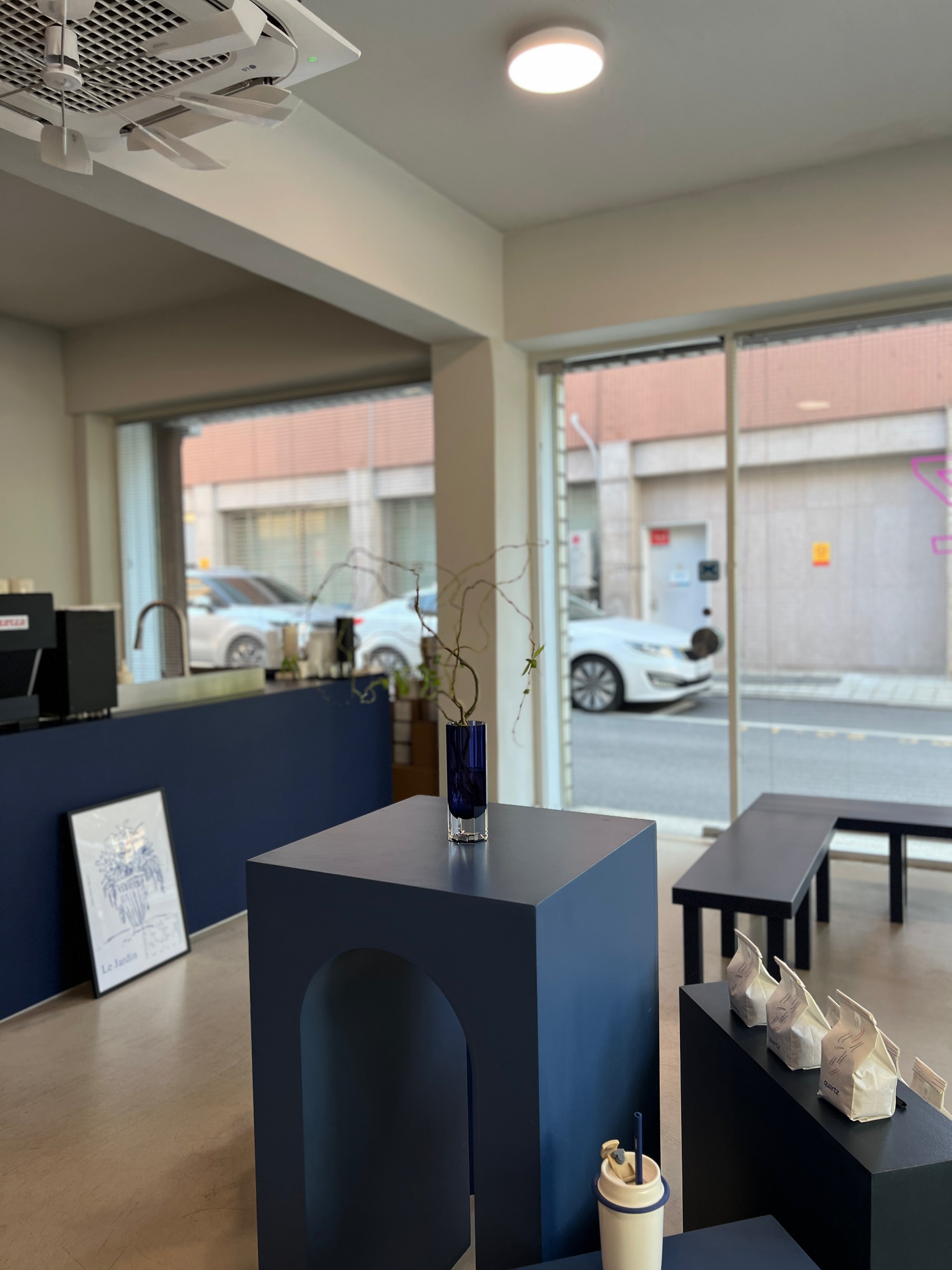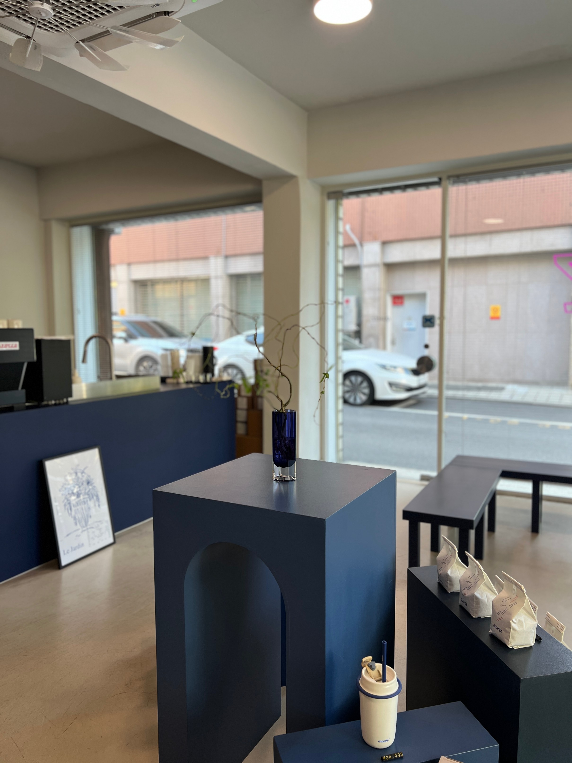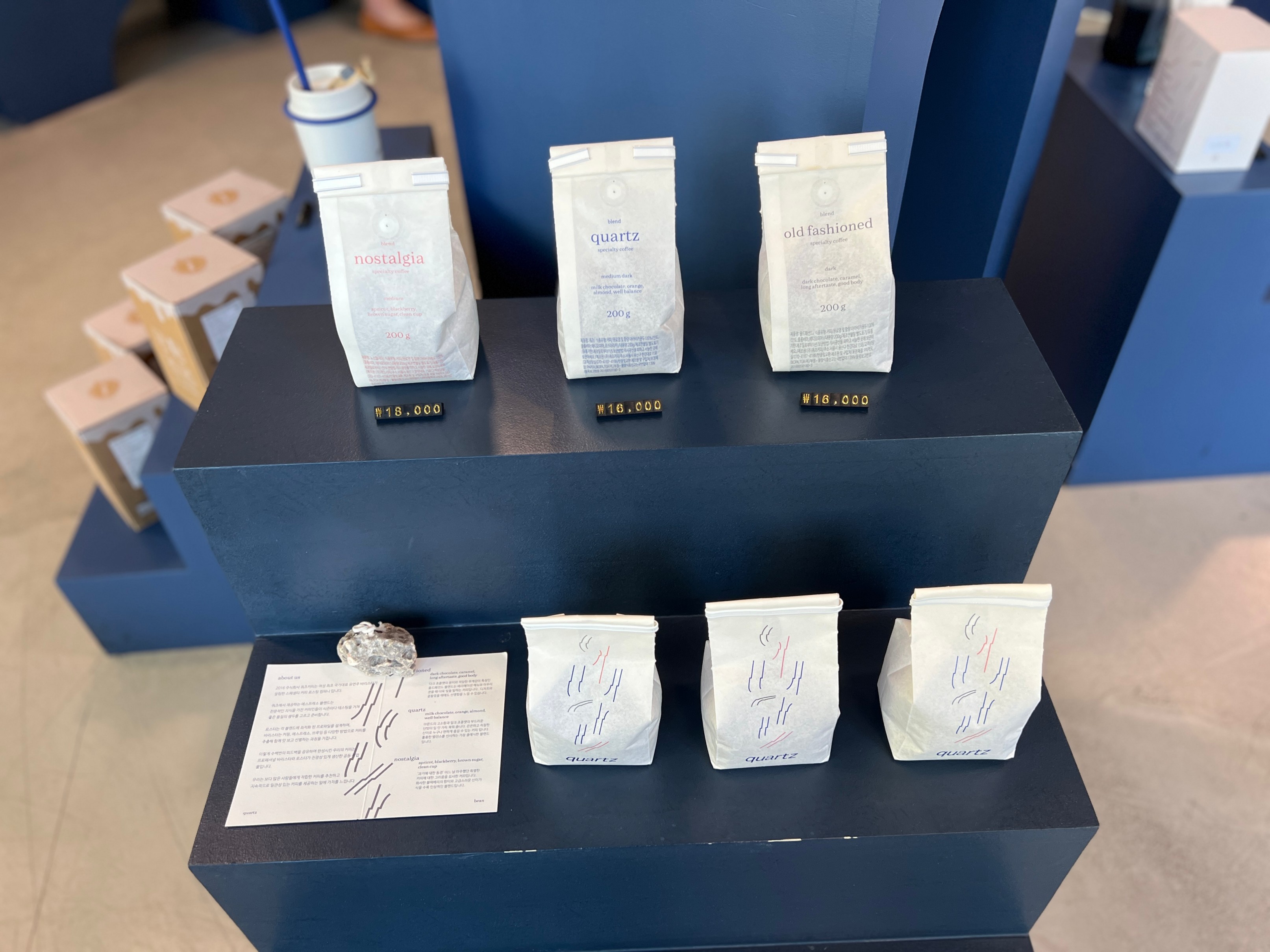 가게 가운데에는 이런 식으로 파란색 심플한 조형물과 함께 카페에서 판매하는 원두가 전시되어 있다.