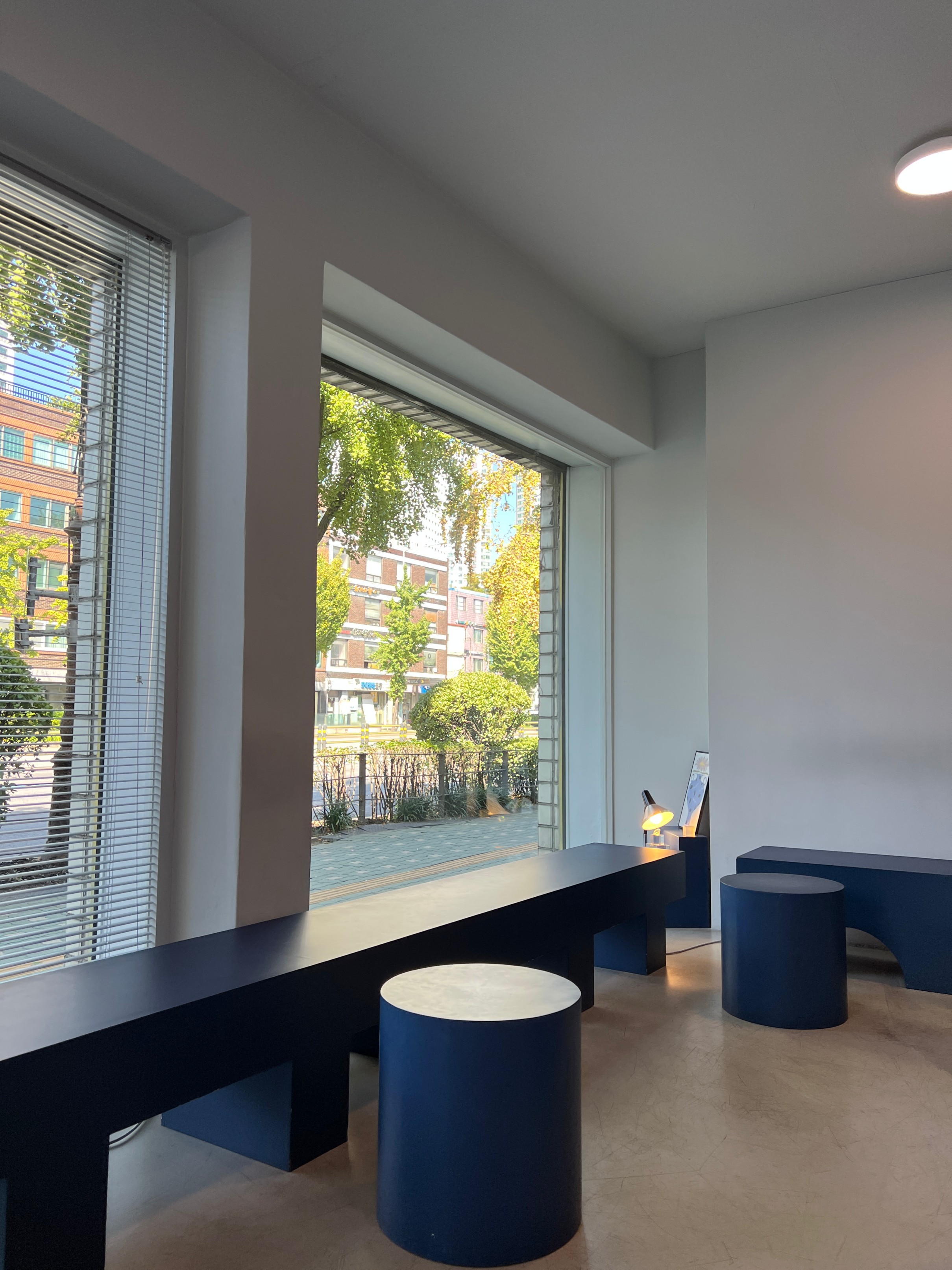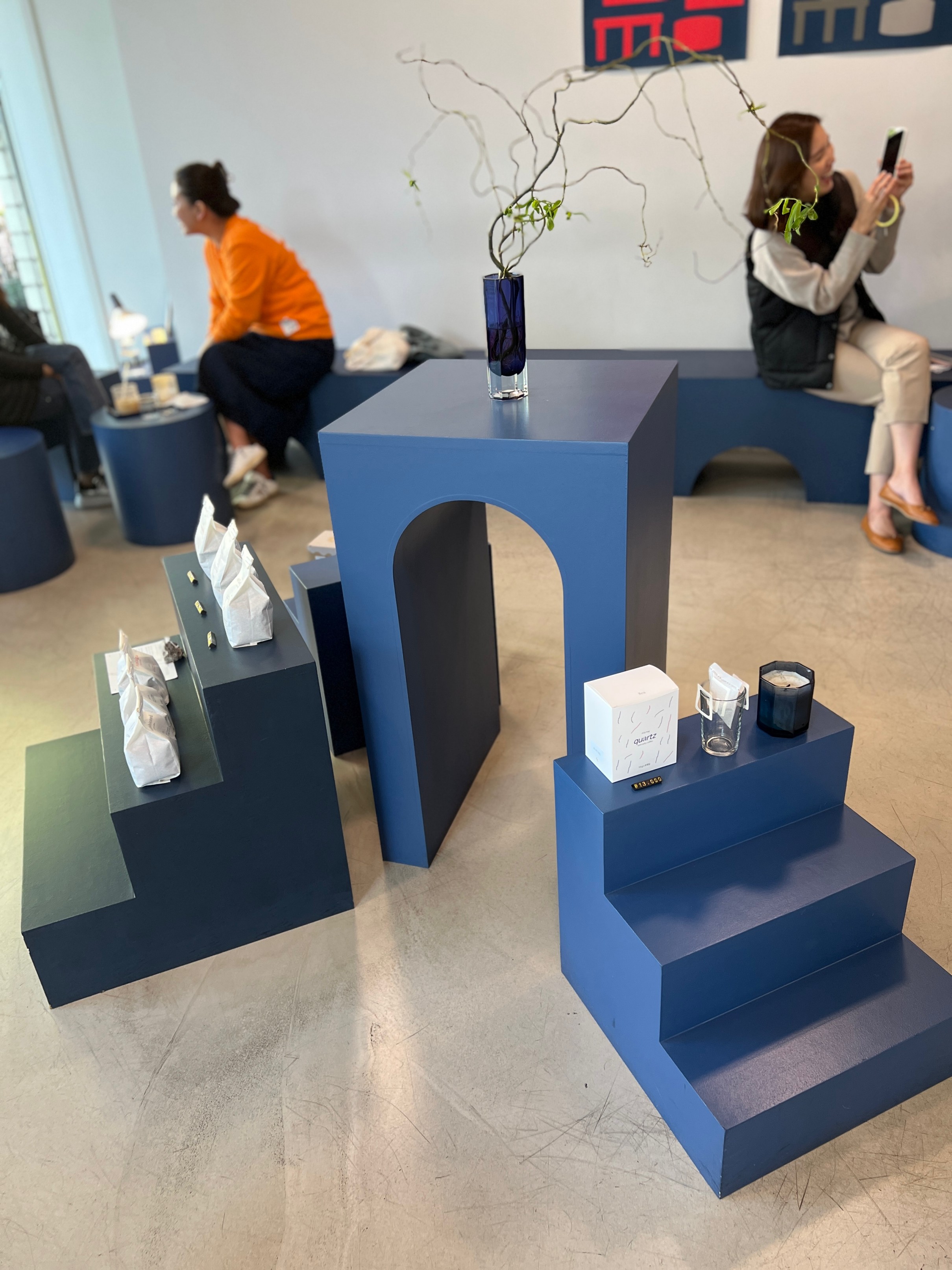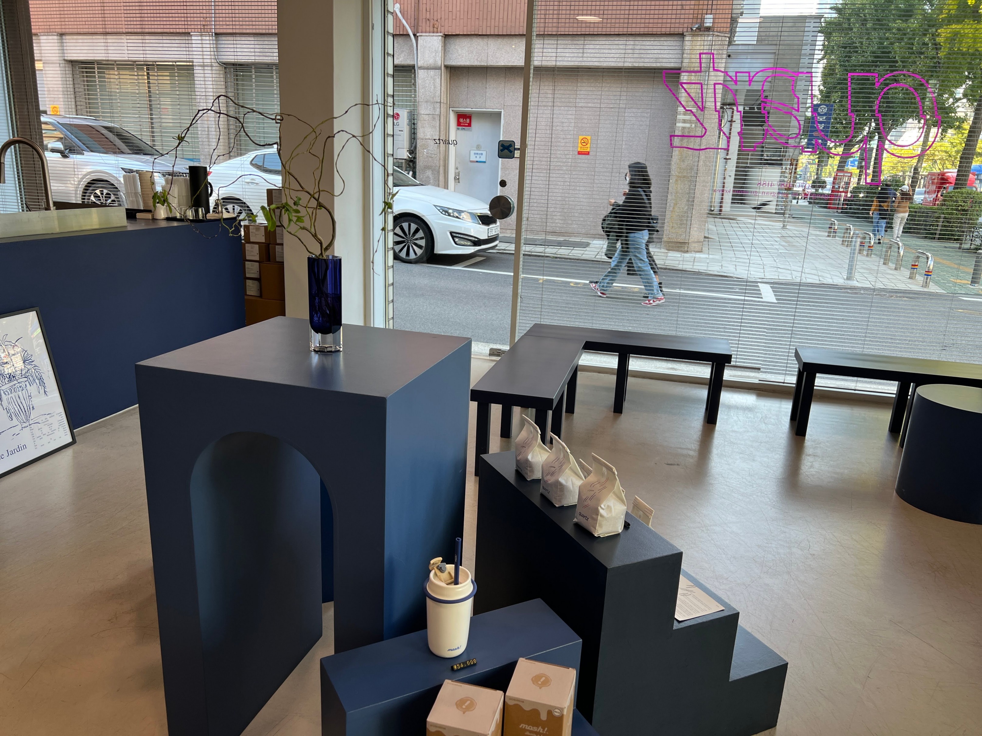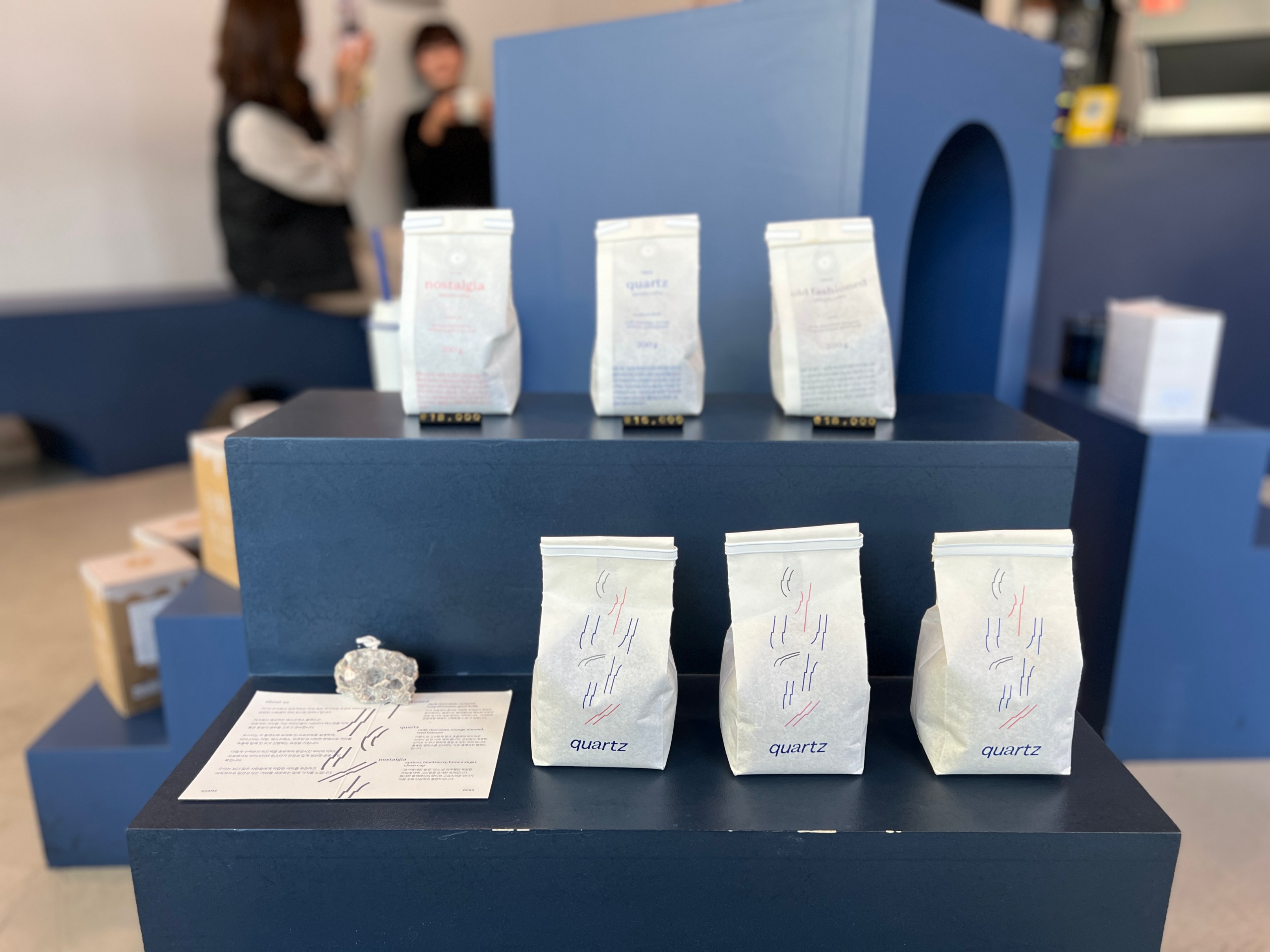 가게 가운데에는 이런 식으로 파란색 심플한 조형물과 함께 카페에서 판매하는 원두가 전시되어 있다.
