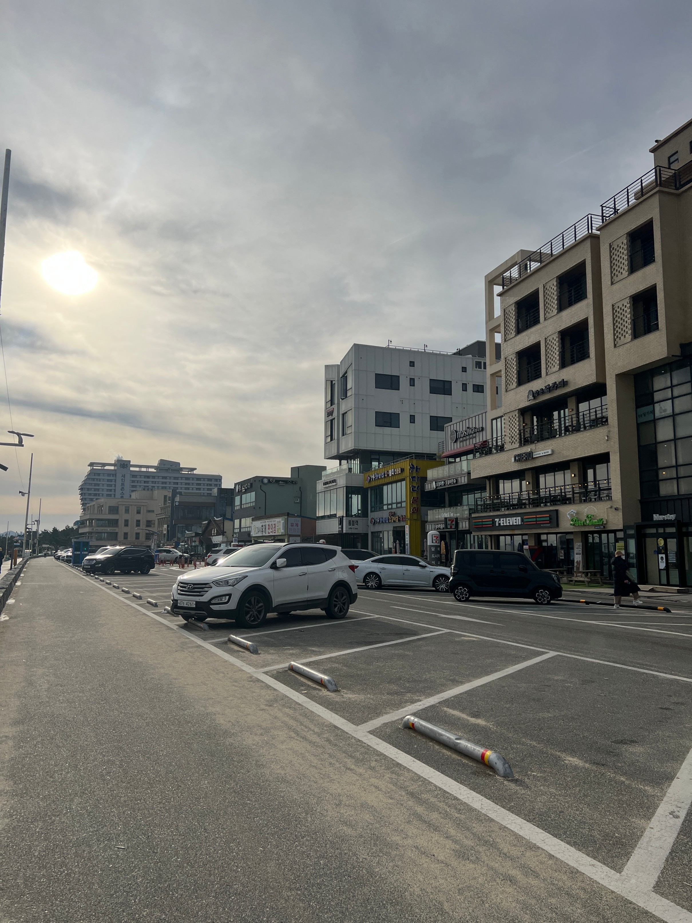 강문해변에는 이렇게 가운데에 공영주차장이 있다.