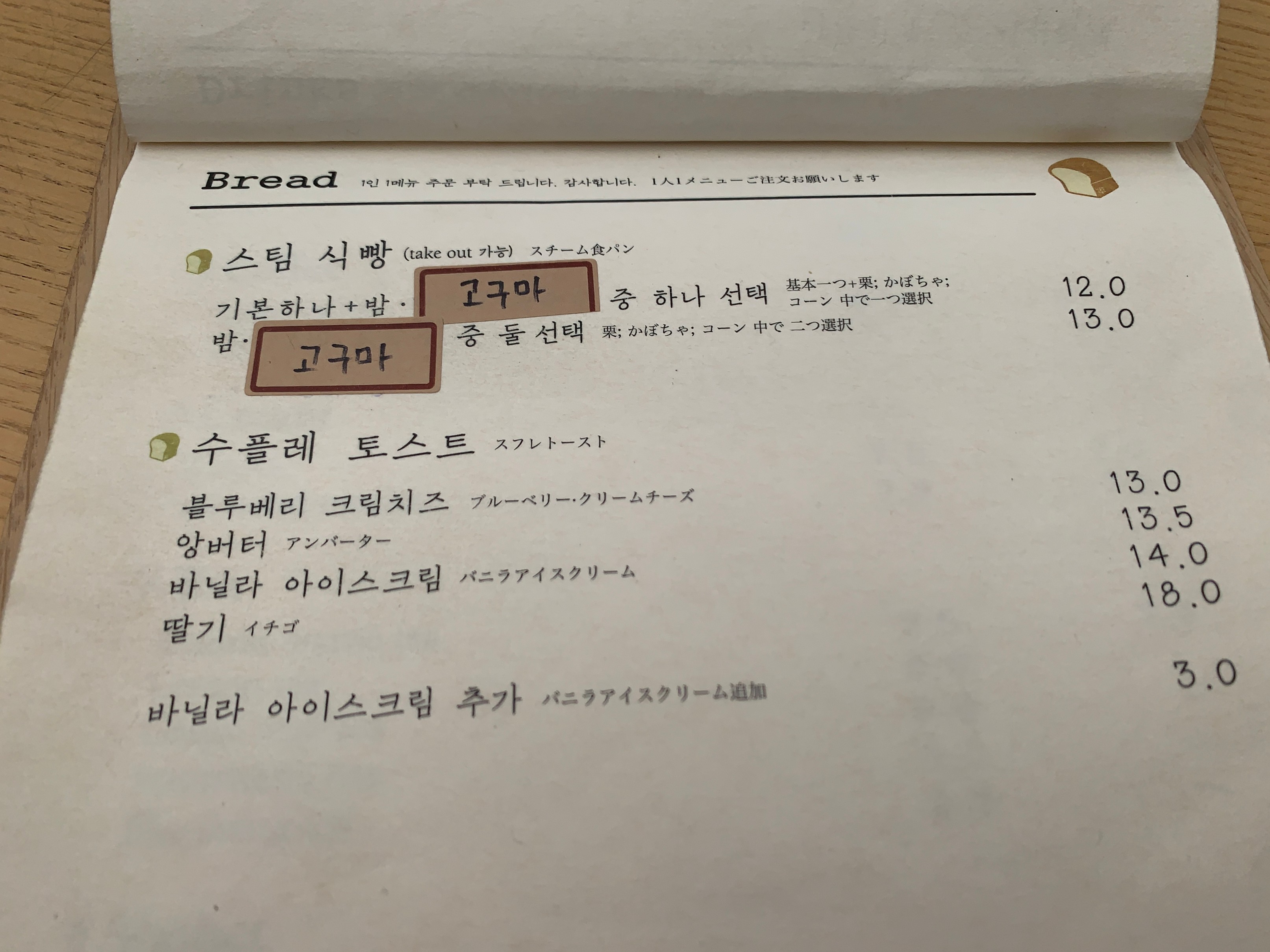 그리고 단연 여기서 제일 많이 시키는 스팀 식빵은 12,000원이다.