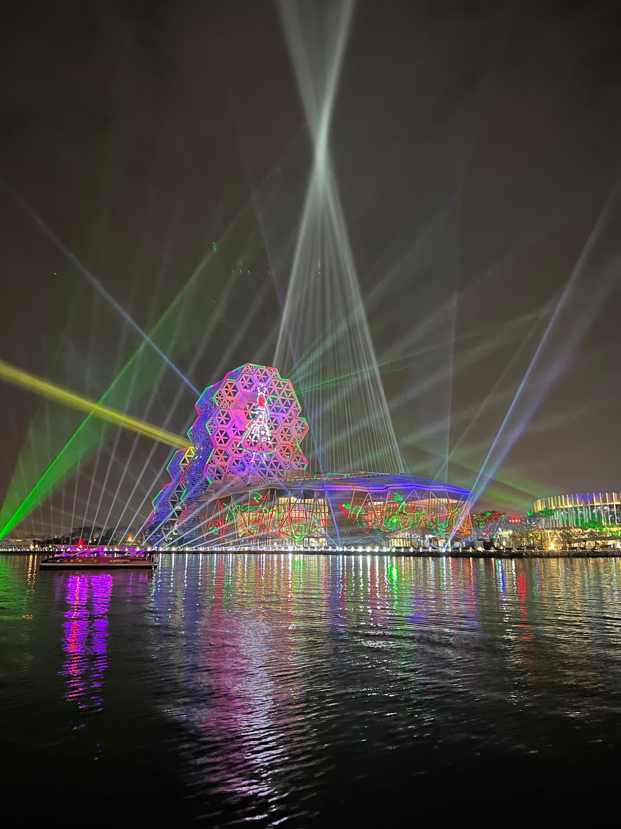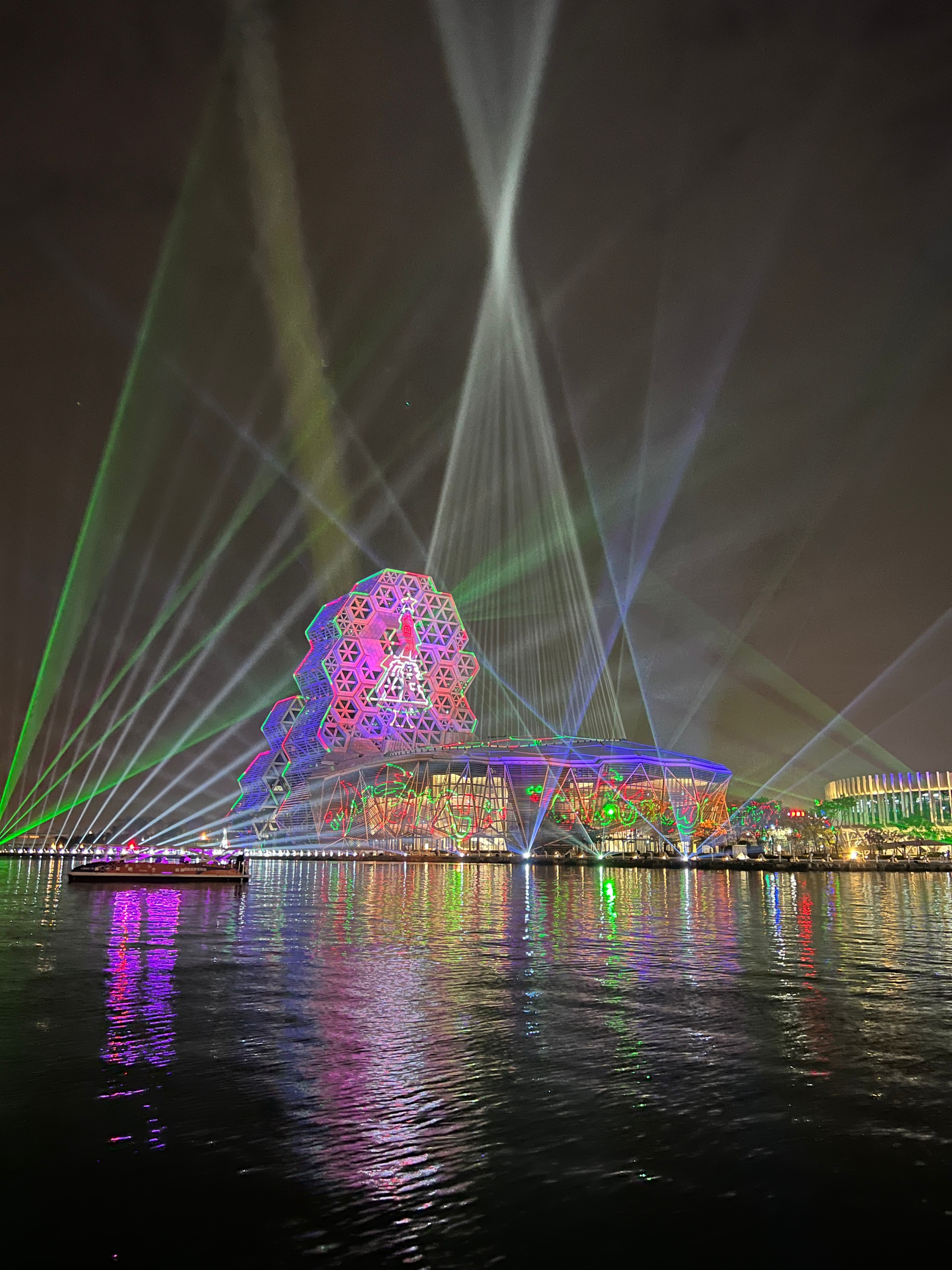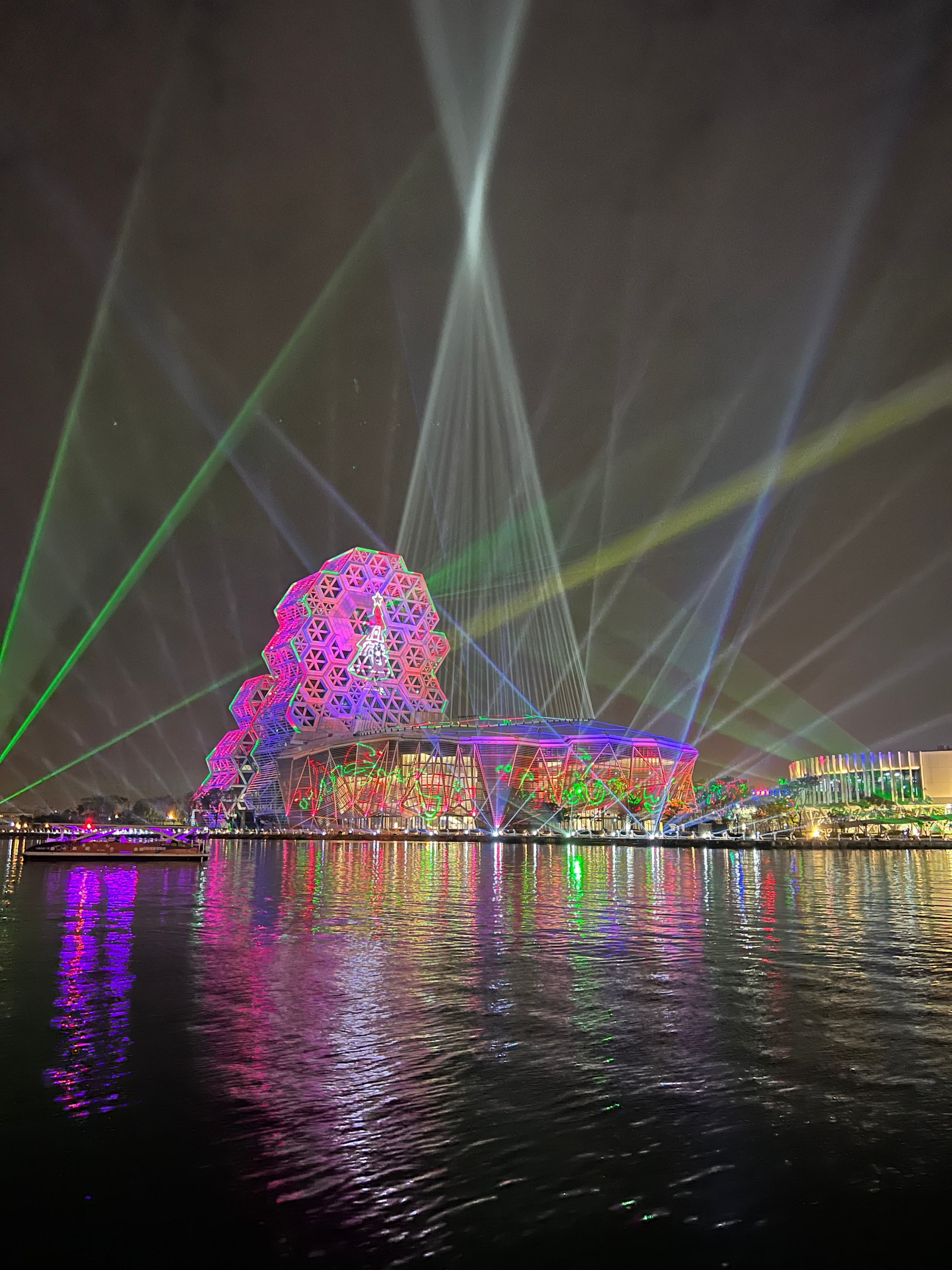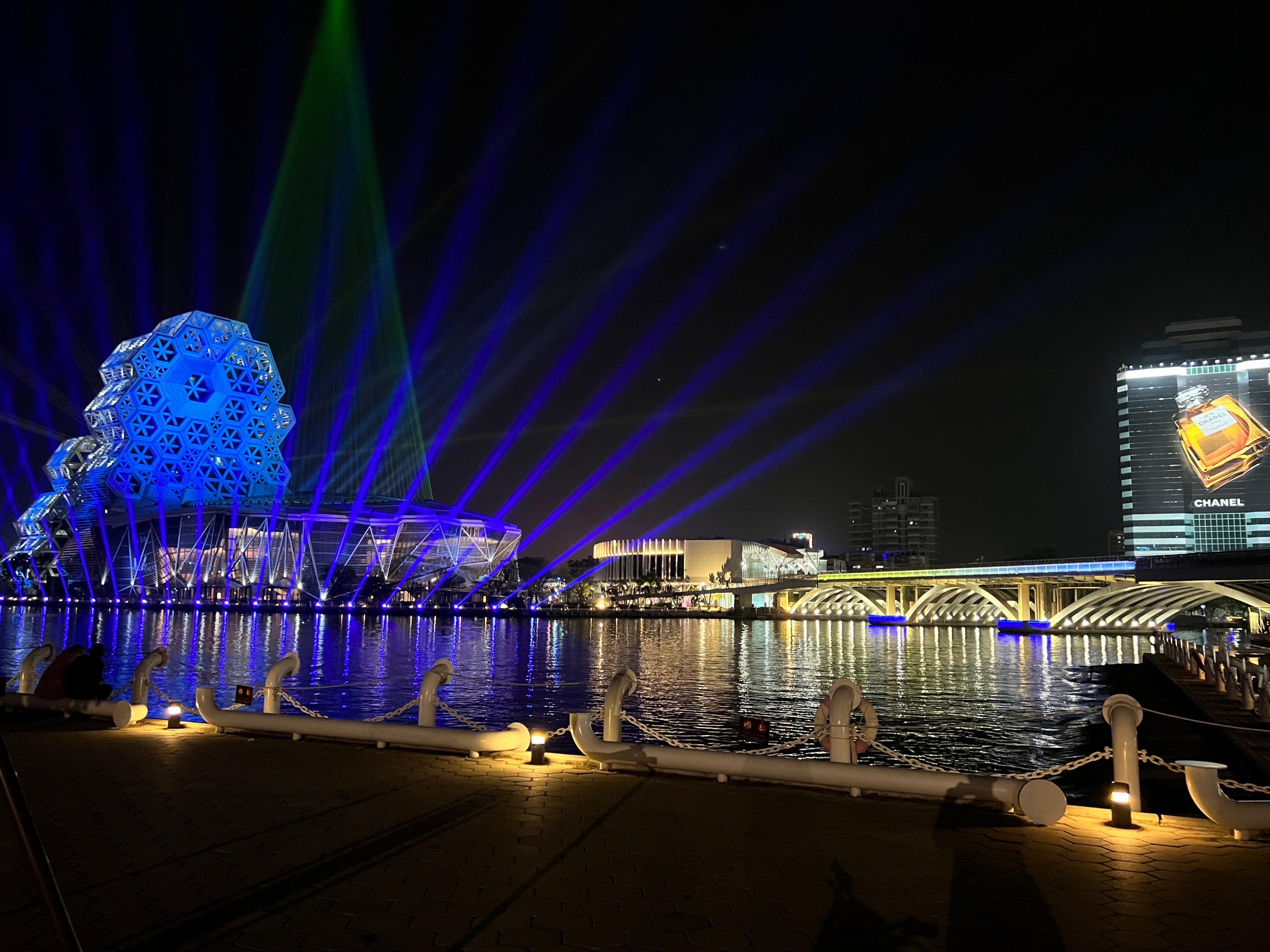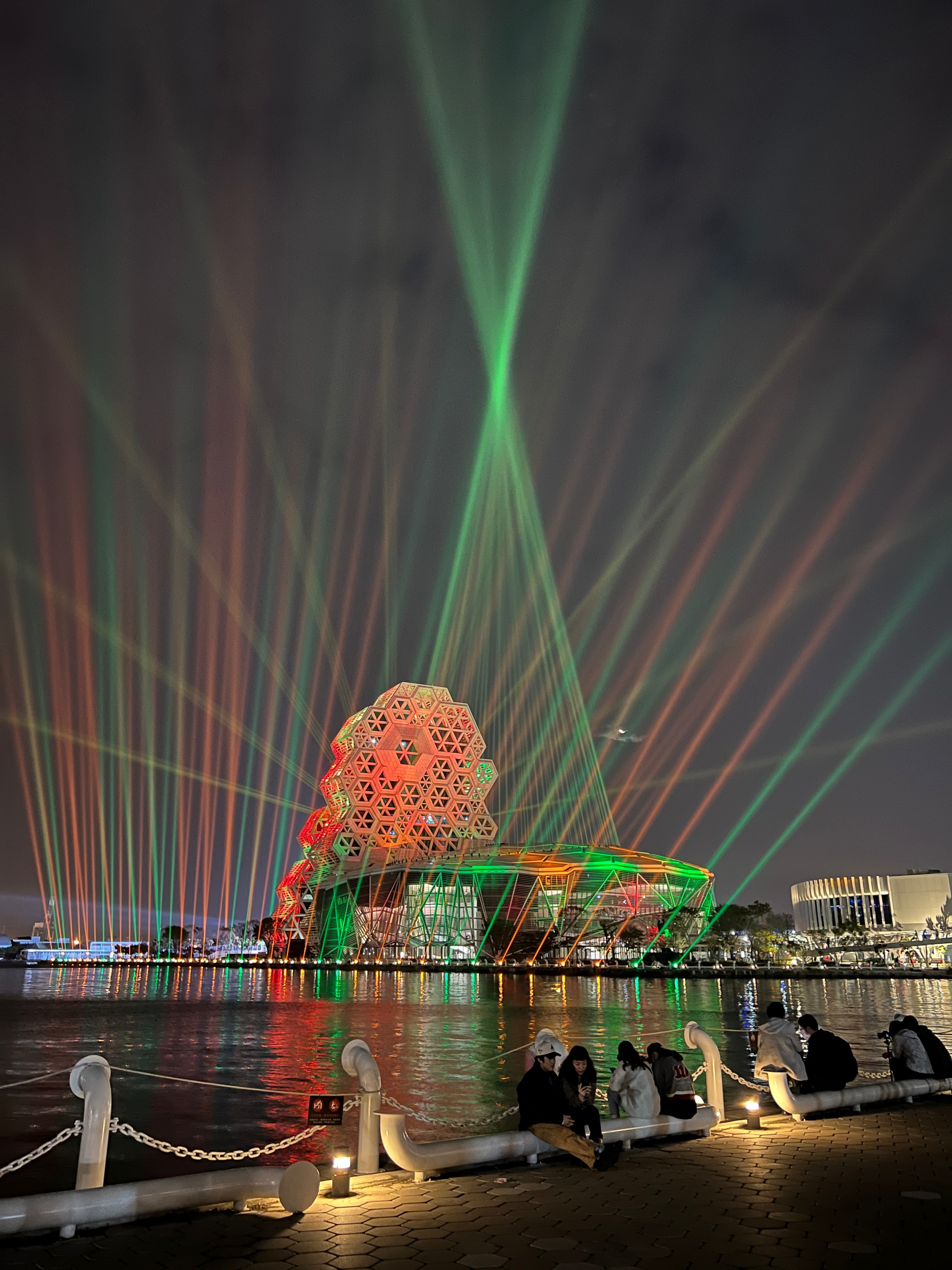 #KaohsiungMusicCenter #가오슝유행음악중심 : 아이허를 자전거 타고 가다보면 자연스럽게 발견할 수밖에 없는 멋진 건물. 멀리서도 보일 정도로 규모가 크고 독특하게 생겼다. 전혀 촌스럽지 않고 엄청 세련됨! 이건 밤에 빛을 발하는데 건물 곳곳에 있는 레이저 불빛만 봐도 이쁜데 일정한 시간이 되면 레이저쇼를 한다. 나름 음악당답게 배경음악이랑 어우러지게 해서 레이저쇼를 하는데 이건 진짜 무조건 봐야 한다. 마침 내가 가오슝에서 마지막 밤을 보내면서 봐서 더 센치하게 봤을 수도 있긴 한데 맥주 한캔 마시면서 진짜 넋 놓고 보게 된다. 정확히 시간은 언제 하는지 모르겠는데 저녁에 강변에 앉아서 적당히 기다리면 금방 금방 하는 것 같다. 하루의 마무리로 딱 보기 좋으니 기억해뒀다가 무조건 보는 거 추천.