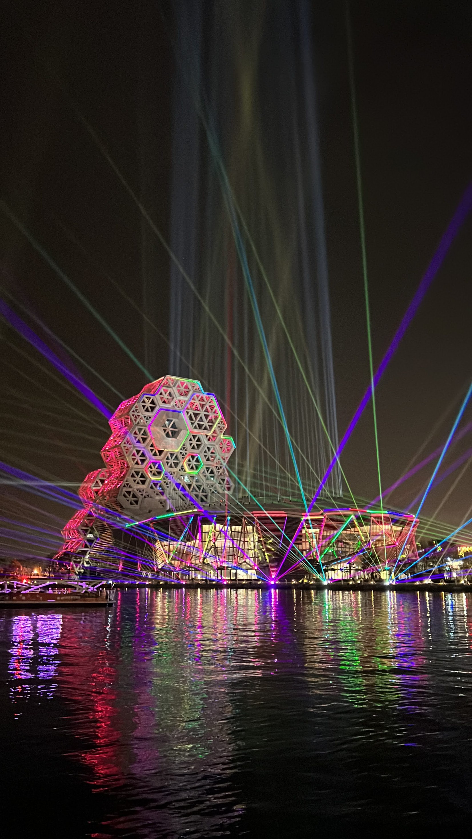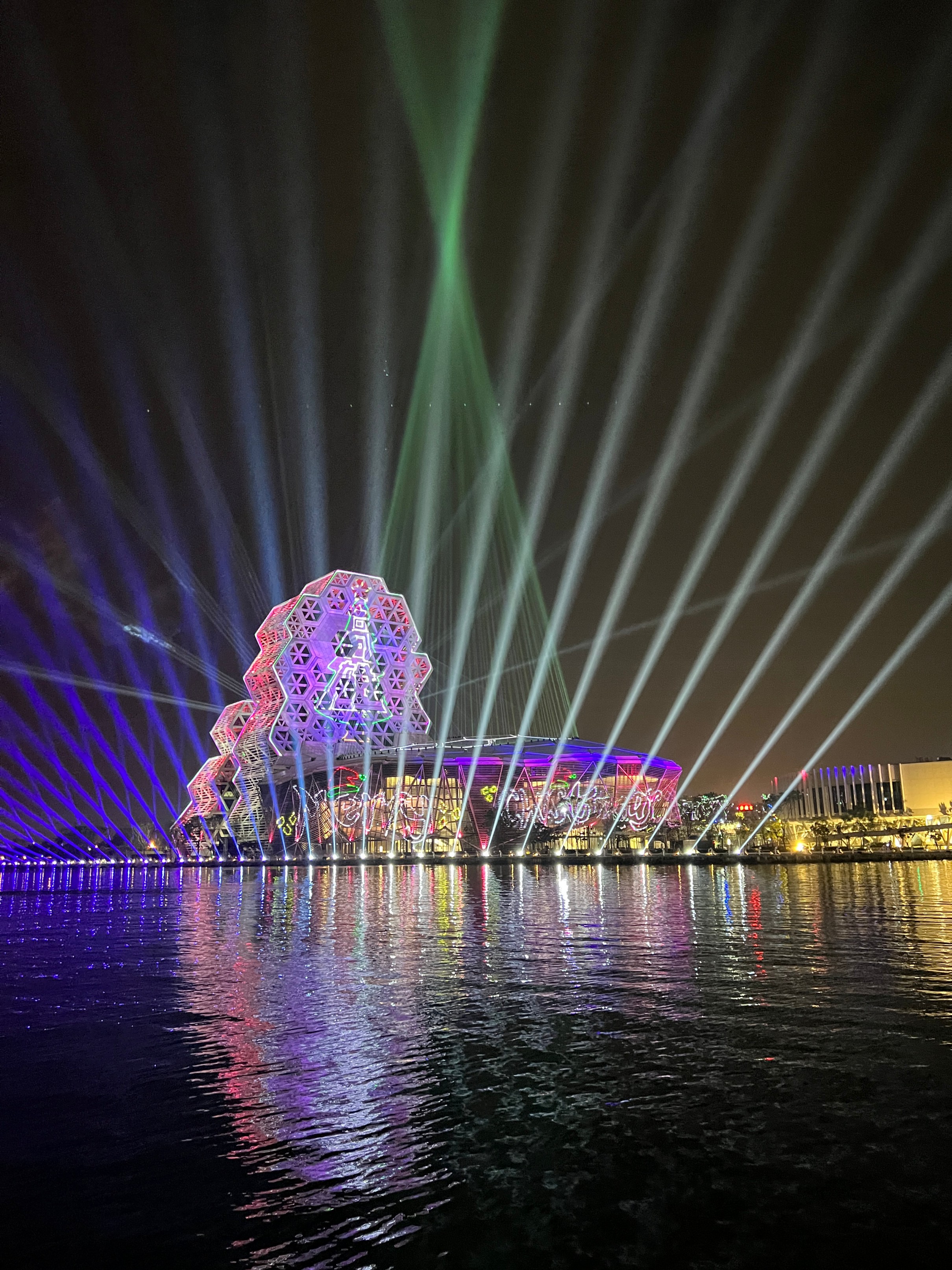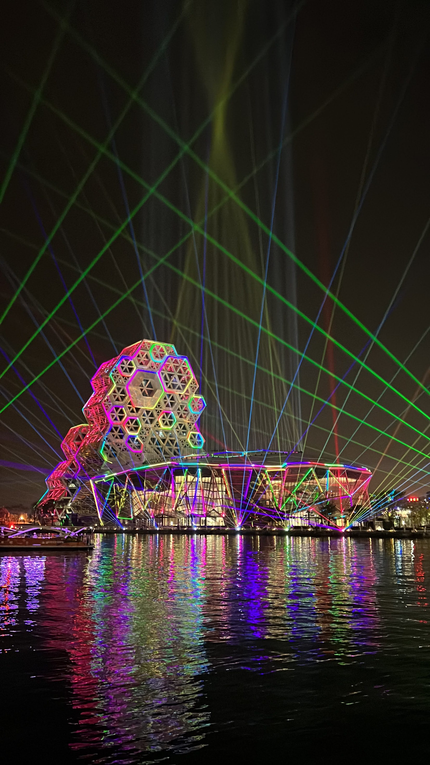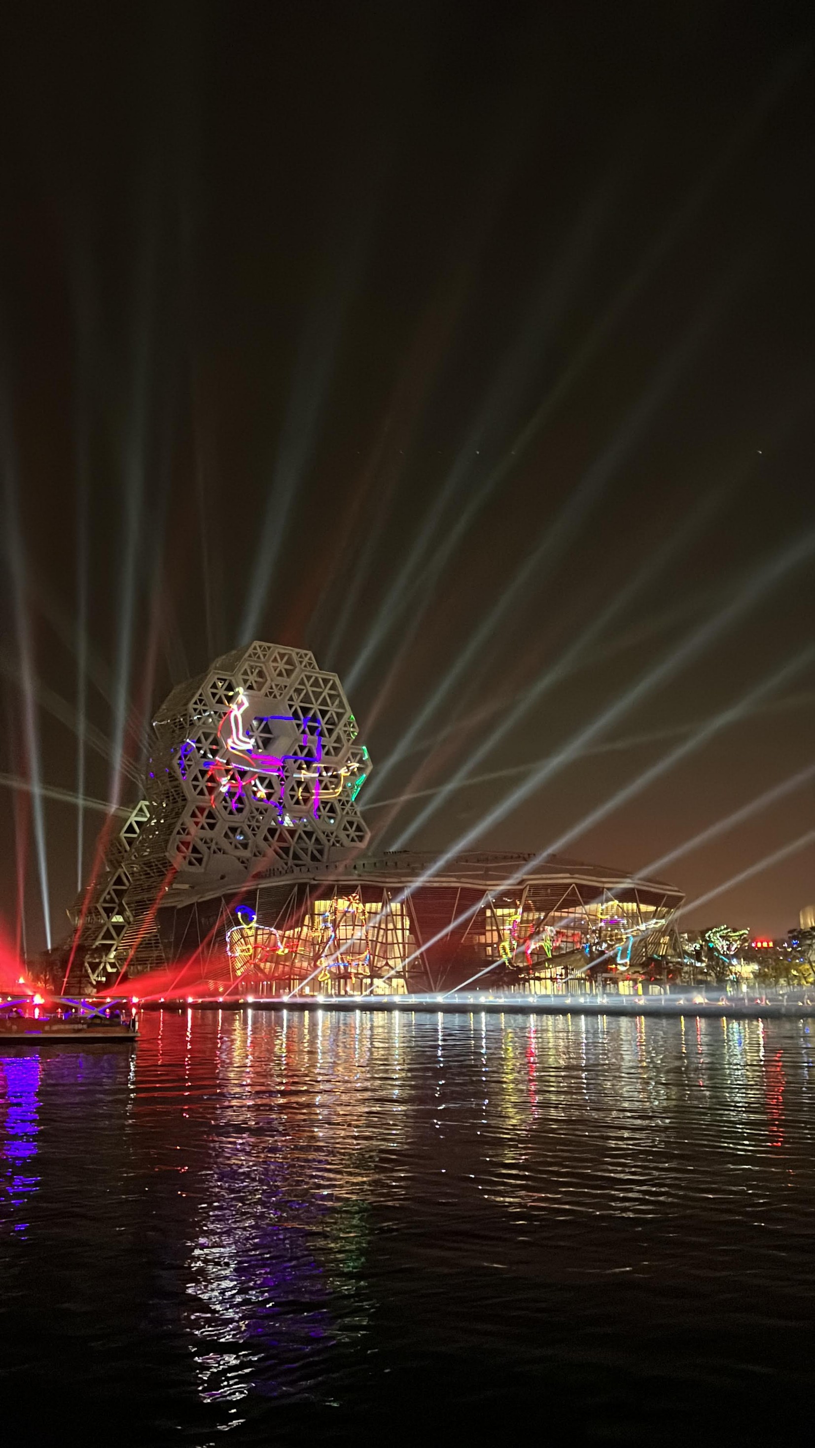#KaohsiungMusicCenter #가오슝유행음악중심 : 아이허를 자전거 타고 가다보면 자연스럽게 발견할 수밖에 없는 멋진 건물. 멀리서도 보일 정도로 규모가 크고 독특하게 생겼다. 전혀 촌스럽지 않고 엄청 세련됨! 이건 밤에 빛을 발하는데 건물 곳곳에 있는 레이저 불빛만 봐도 이쁜데 일정한 시간이 되면 레이저쇼를 한다. 나름 음악당답게 배경음악이랑 어우러지게 해서 레이저쇼를 하는데 이건 진짜 무조건 봐야 한다. 마침 내가 가오슝에서 마지막 밤을 보내면서 봐서 더 센치하게 봤을 수도 있긴 한데 맥주 한캔 마시면서 진짜 넋 놓고 보게 된다. 정확히 시간은 언제 하는지 모르겠는데 저녁에 강변에 앉아서 적당히 기다리면 금방 금방 하는 것 같다. 하루의 마무리로 딱 보기 좋으니 기억해뒀다가 무조건 보는 거 추천.