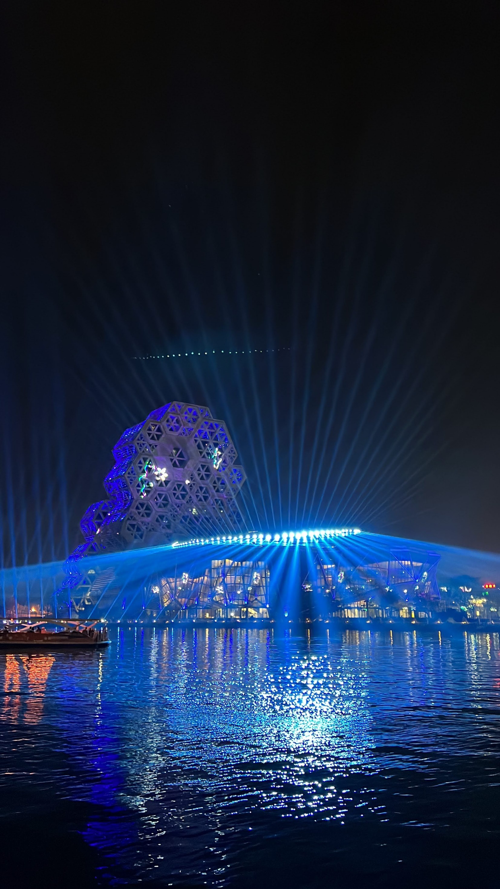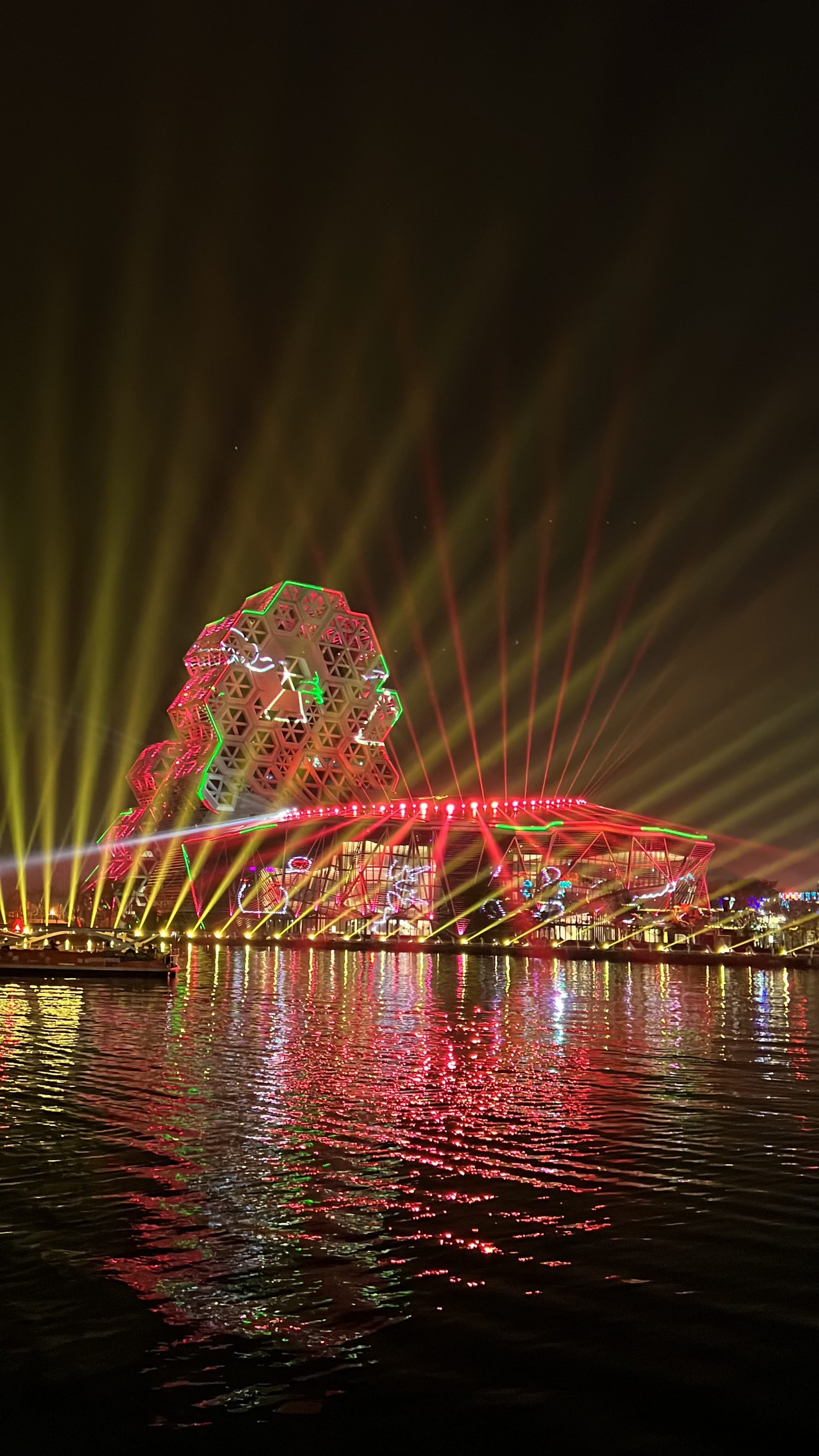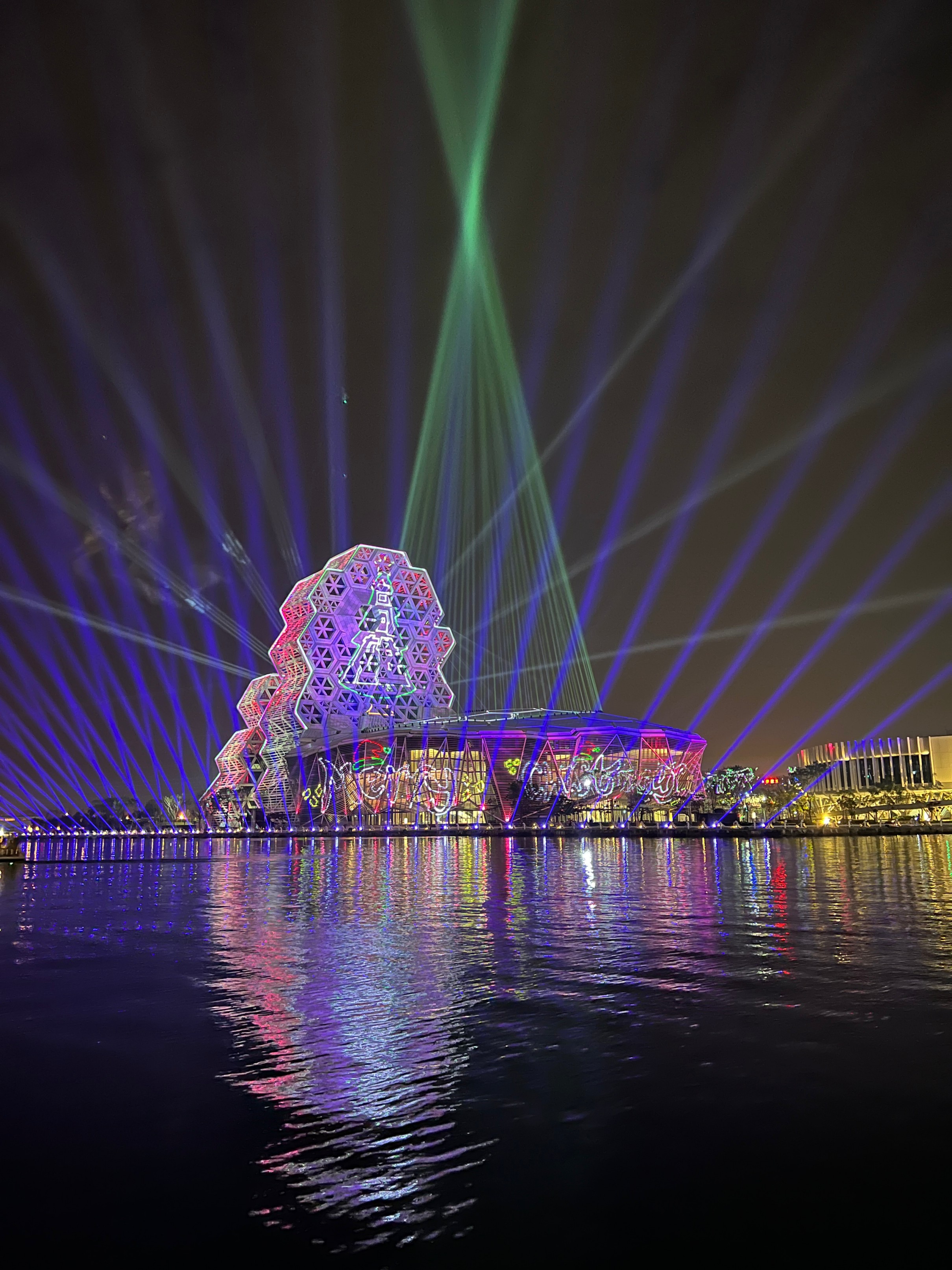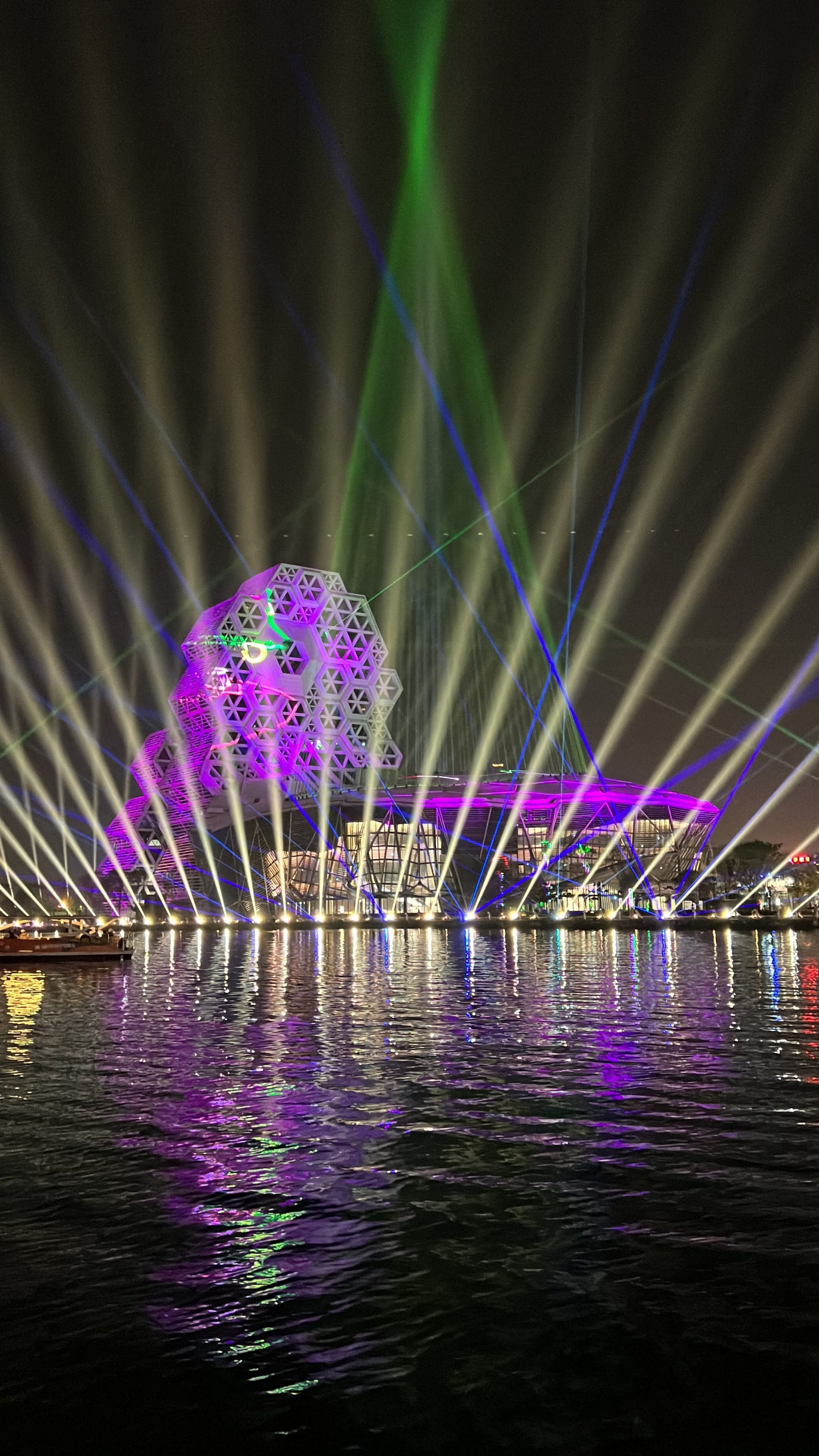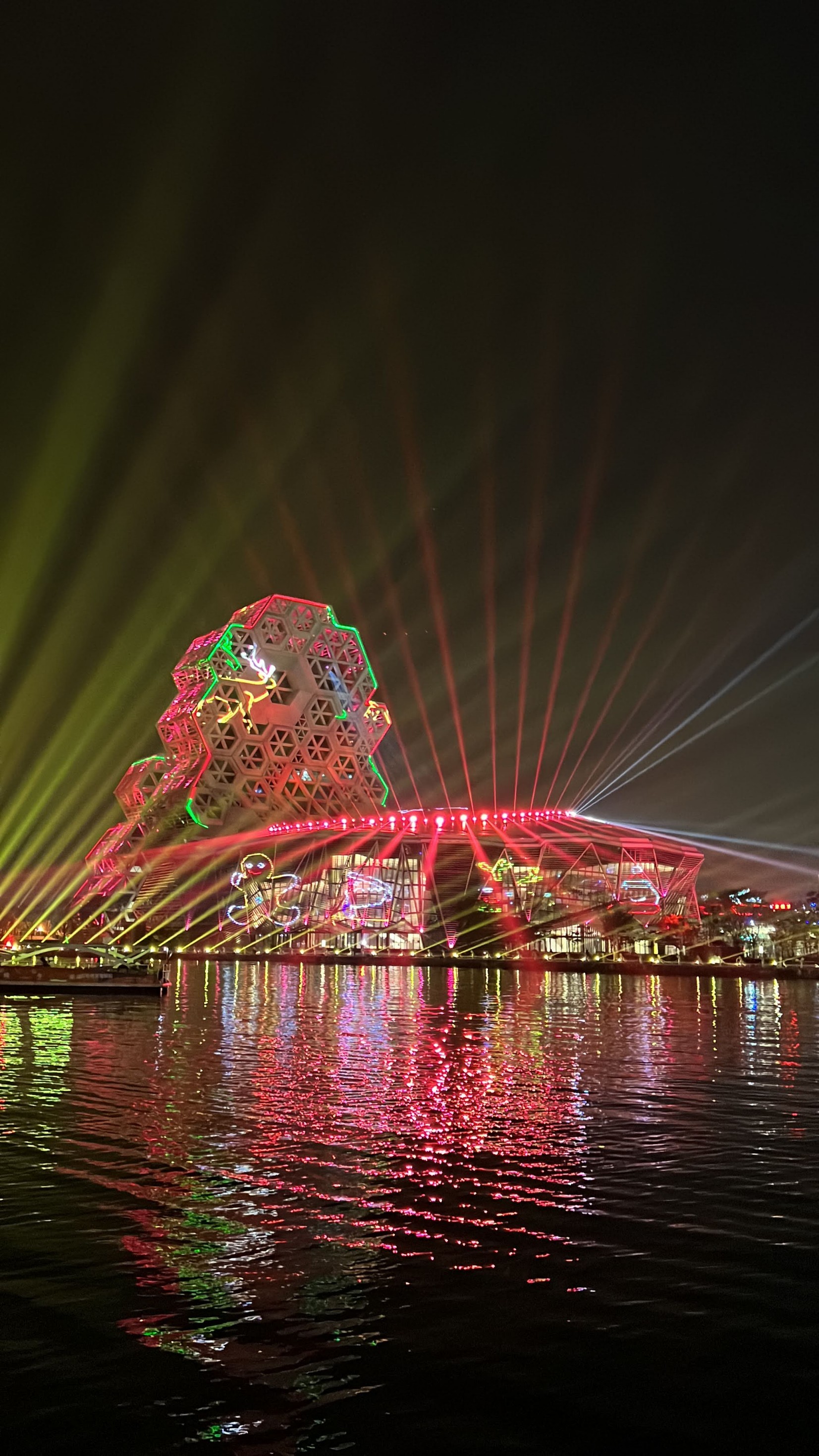 #KaohsiungMusicCenter #가오슝유행음악중심 : 아이허를 자전거 타고 가다보면 자연스럽게 발견할 수밖에 없는 멋진 건물. 멀리서도 보일 정도로 규모가 크고 독특하게 생겼다. 전혀 촌스럽지 않고 엄청 세련됨! 이건 밤에 빛을 발하는데 건물 곳곳에 있는 레이저 불빛만 봐도 이쁜데 일정한 시간이 되면 레이저쇼를 한다. 나름 음악당답게 배경음악이랑 어우러지게 해서 레이저쇼를 하는데 이건 진짜 무조건 봐야 한다. 마침 내가 가오슝에서 마지막 밤을 보내면서 봐서 더 센치하게 봤을 수도 있긴 한데 맥주 한캔 마시면서 진짜 넋 놓고 보게 된다. 정확히 시간은 언제 하는지 모르겠는데 저녁에 강변에 앉아서 적당히 기다리면 금방 금방 하는 것 같다. 하루의 마무리로 딱 보기 좋으니 기억해뒀다가 무조건 보는 거 추천.