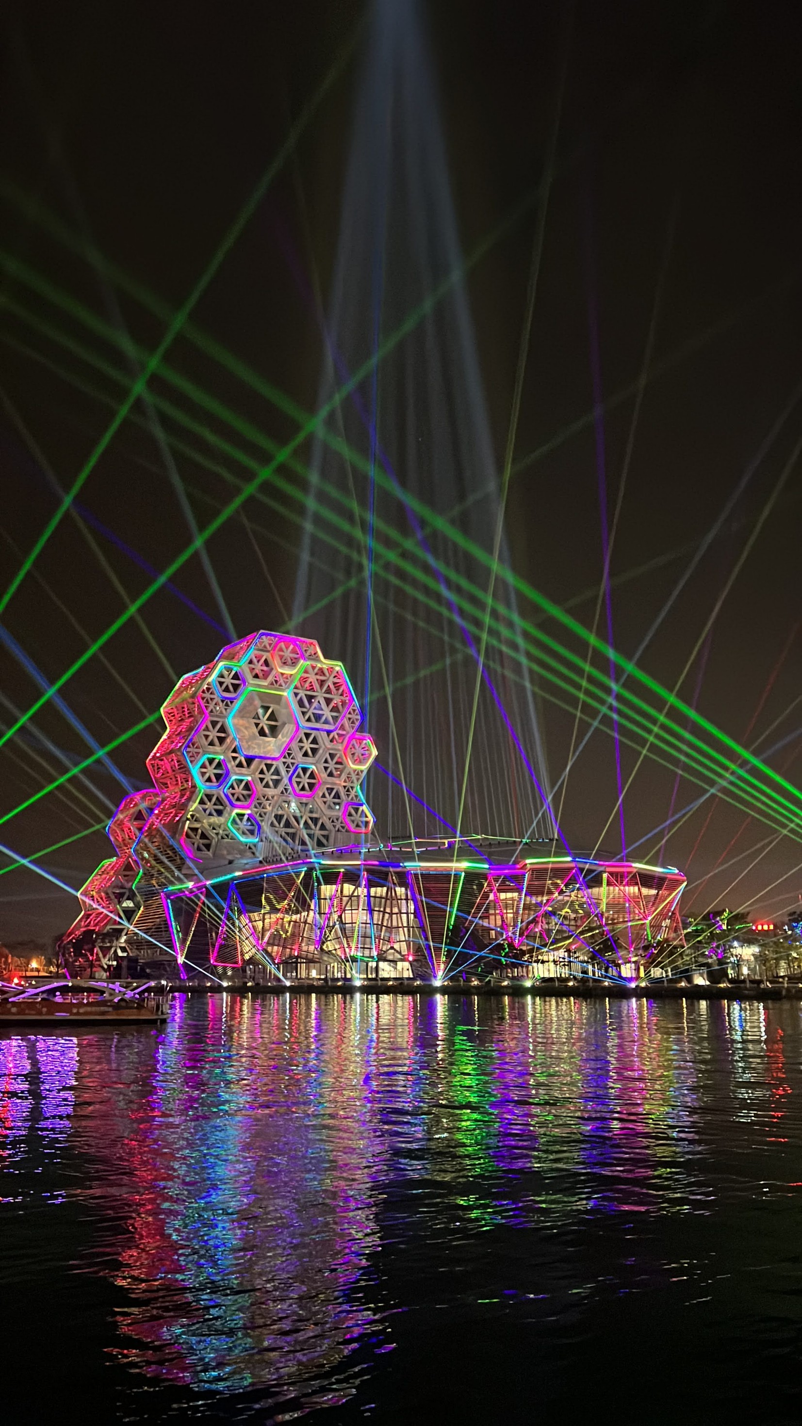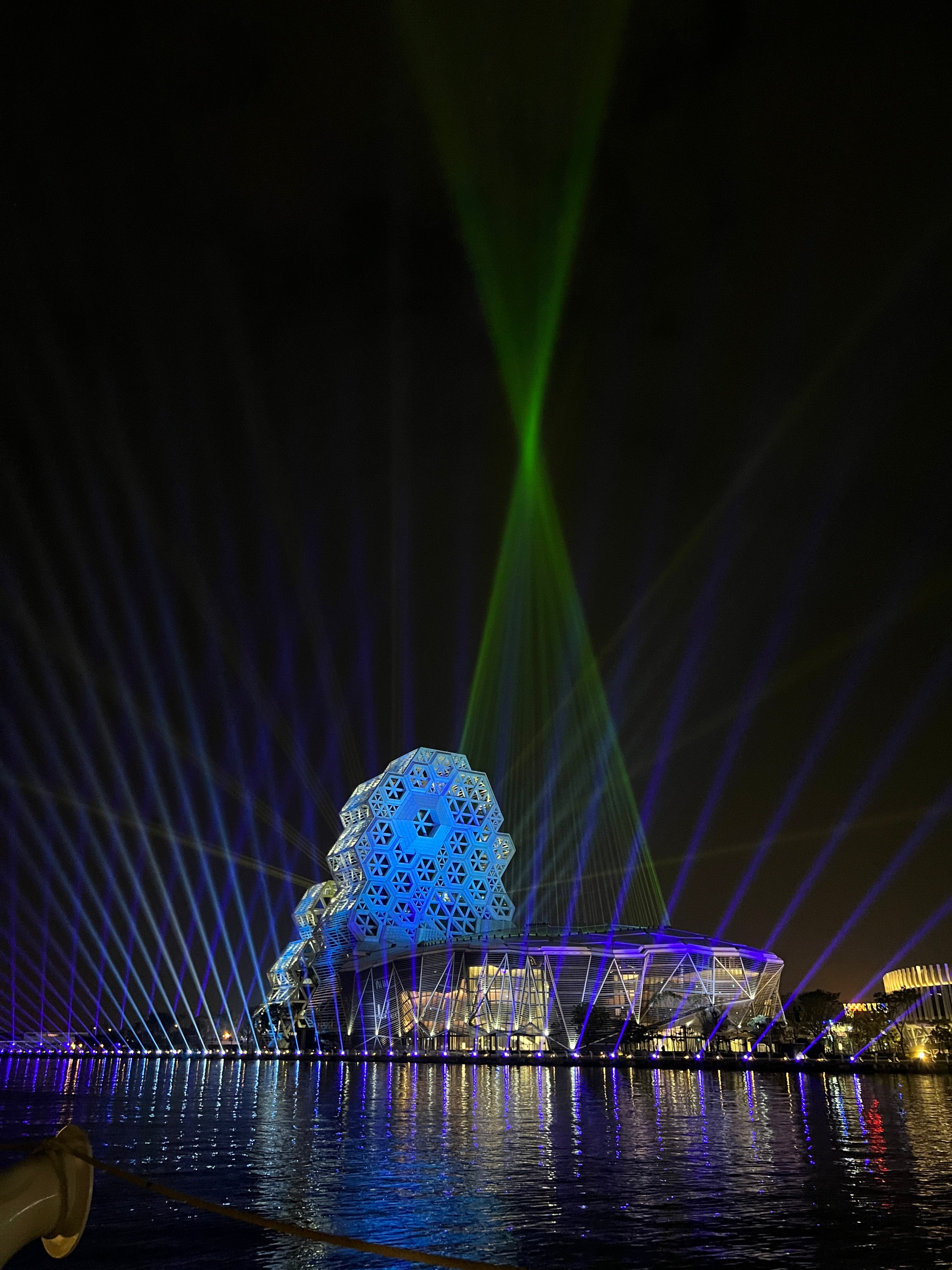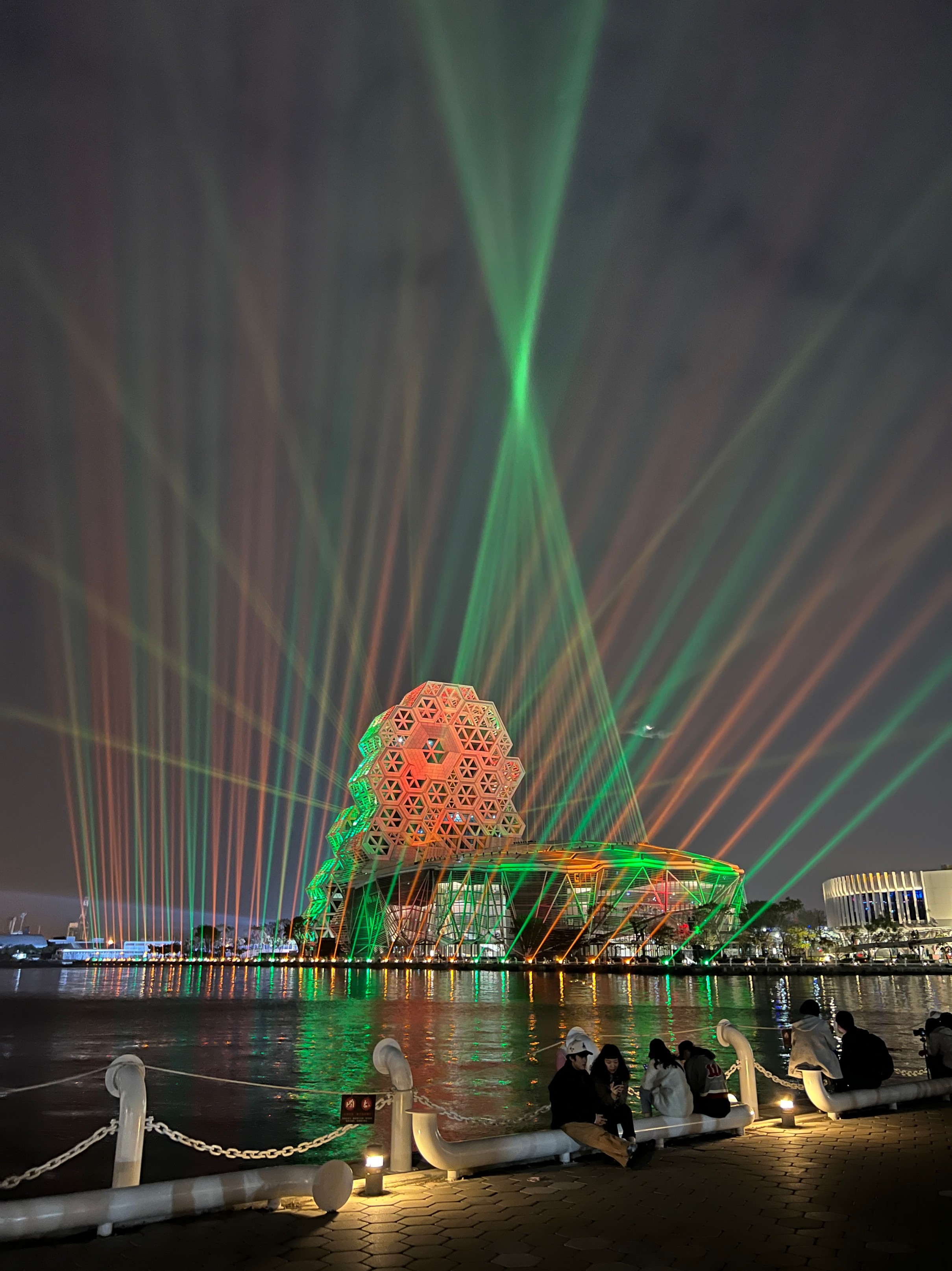 #KaohsiungMusicCenter #가오슝유행음악중심 : 아이허를 자전거 타고 가다보면 자연스럽게 발견할 수밖에 없는 멋진 건물. 멀리서도 보일 정도로 규모가 크고 독특하게 생겼다. 전혀 촌스럽지 않고 엄청 세련됨! 이건 밤에 빛을 발하는데 건물 곳곳에 있는 레이저 불빛만 봐도 이쁜데 일정한 시간이 되면 레이저쇼를 한다. 나름 음악당답게 배경음악이랑 어우러지게 해서 레이저쇼를 하는데 이건 진짜 무조건 봐야 한다. 마침 내가 가오슝에서 마지막 밤을 보내면서 봐서 더 센치하게 봤을 수도 있긴 한데 맥주 한캔 마시면서 진짜 넋 놓고 보게 된다. 정확히 시간은 언제 하는지 모르겠는데 저녁에 강변에 앉아서 적당히 기다리면 금방 금방 하는 것 같다. 하루의 마무리로 딱 보기 좋으니 기억해뒀다가 무조건 보는 거 추천.