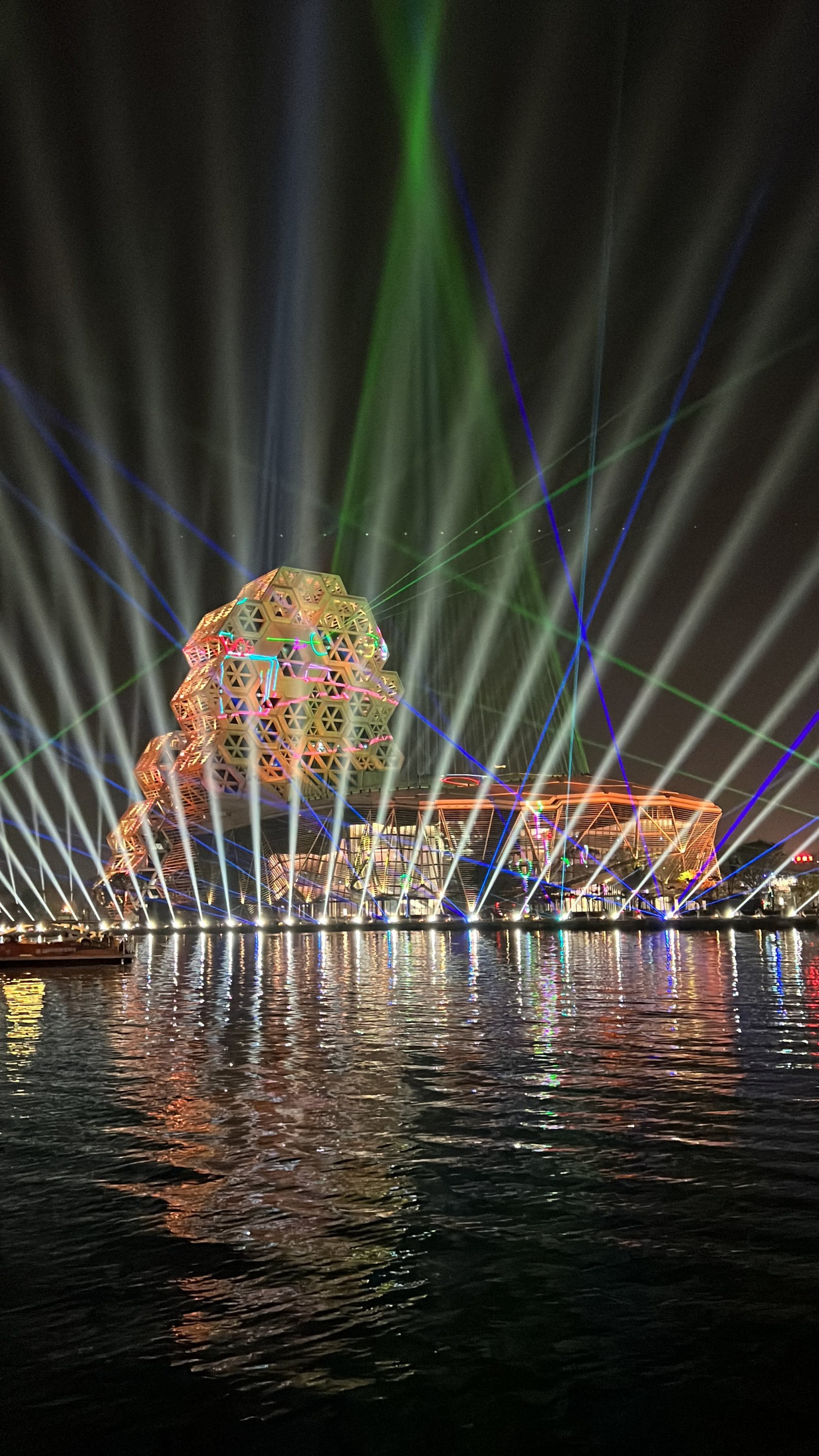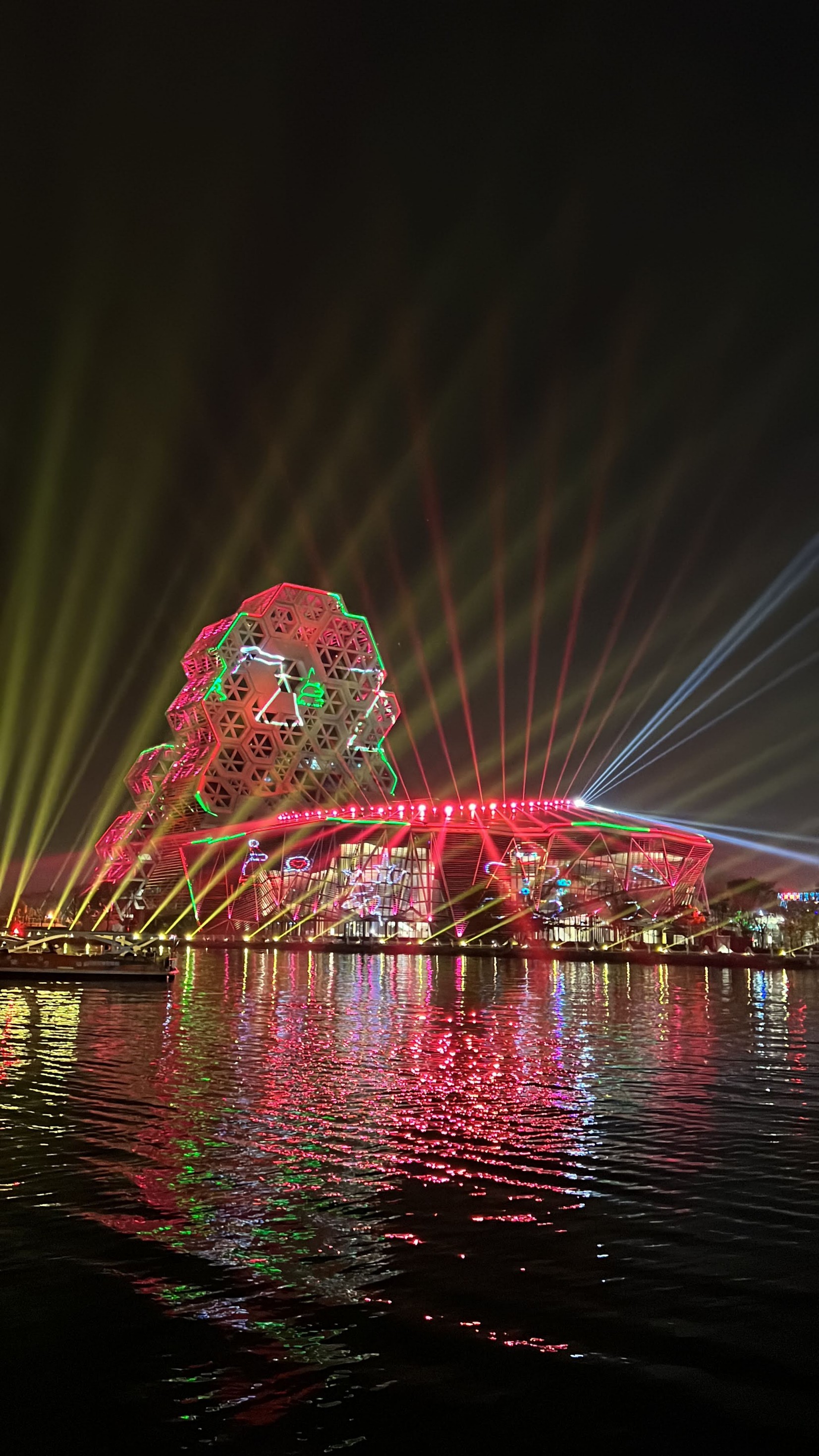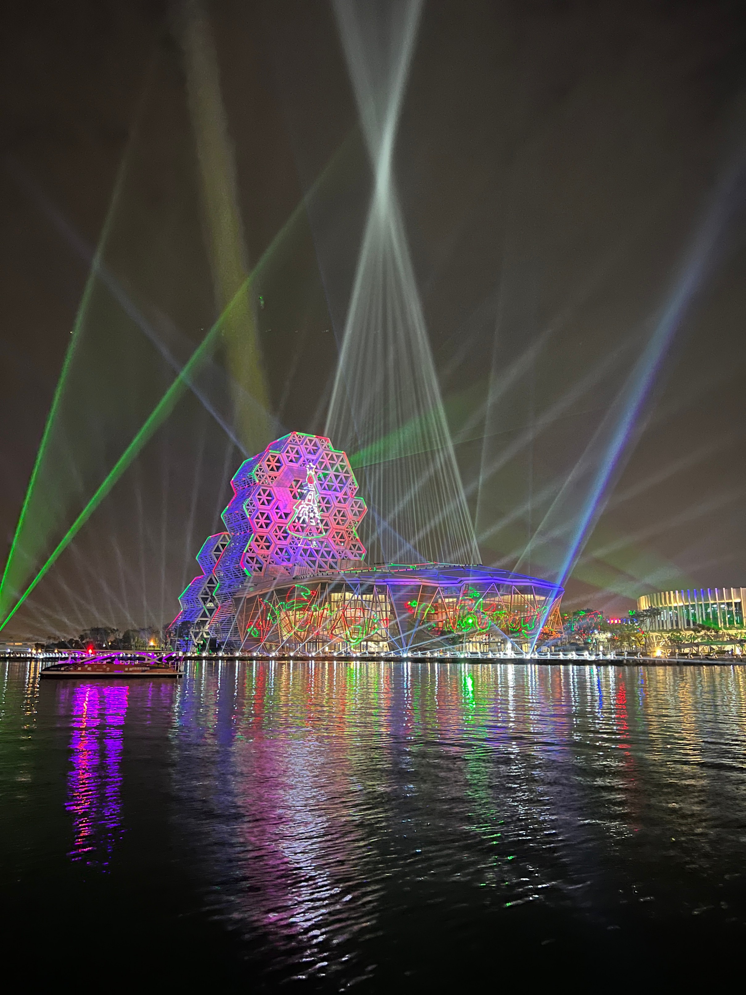 #KaohsiungMusicCenter #가오슝유행음악중심 : 아이허를 자전거 타고 가다보면 자연스럽게 발견할 수밖에 없는 멋진 건물. 멀리서도 보일 정도로 규모가 크고 독특하게 생겼다. 전혀 촌스럽지 않고 엄청 세련됨! 이건 밤에 빛을 발하는데 건물 곳곳에 있는 레이저 불빛만 봐도 이쁜데 일정한 시간이 되면 레이저쇼를 한다. 나름 음악당답게 배경음악이랑 어우러지게 해서 레이저쇼를 하는데 이건 진짜 무조건 봐야 한다. 마침 내가 가오슝에서 마지막 밤을 보내면서 봐서 더 센치하게 봤을 수도 있긴 한데 맥주 한캔 마시면서 진짜 넋 놓고 보게 된다. 정확히 시간은 언제 하는지 모르겠는데 저녁에 강변에 앉아서 적당히 기다리면 금방 금방 하는 것 같다. 하루의 마무리로 딱 보기 좋으니 기억해뒀다가 무조건 보는 거 추천.