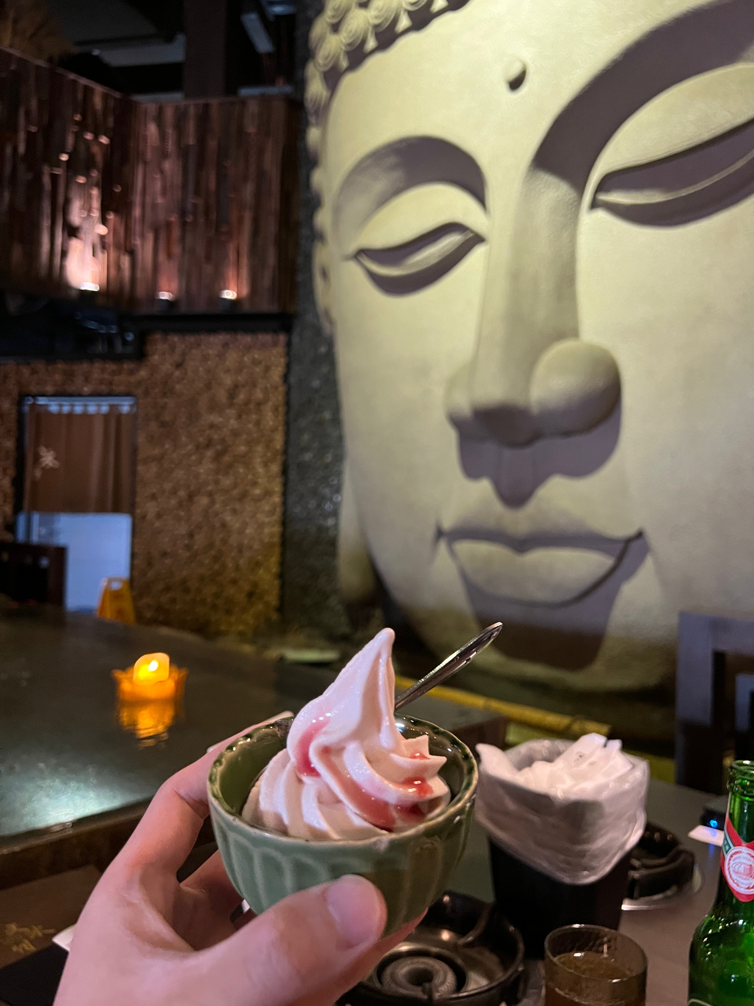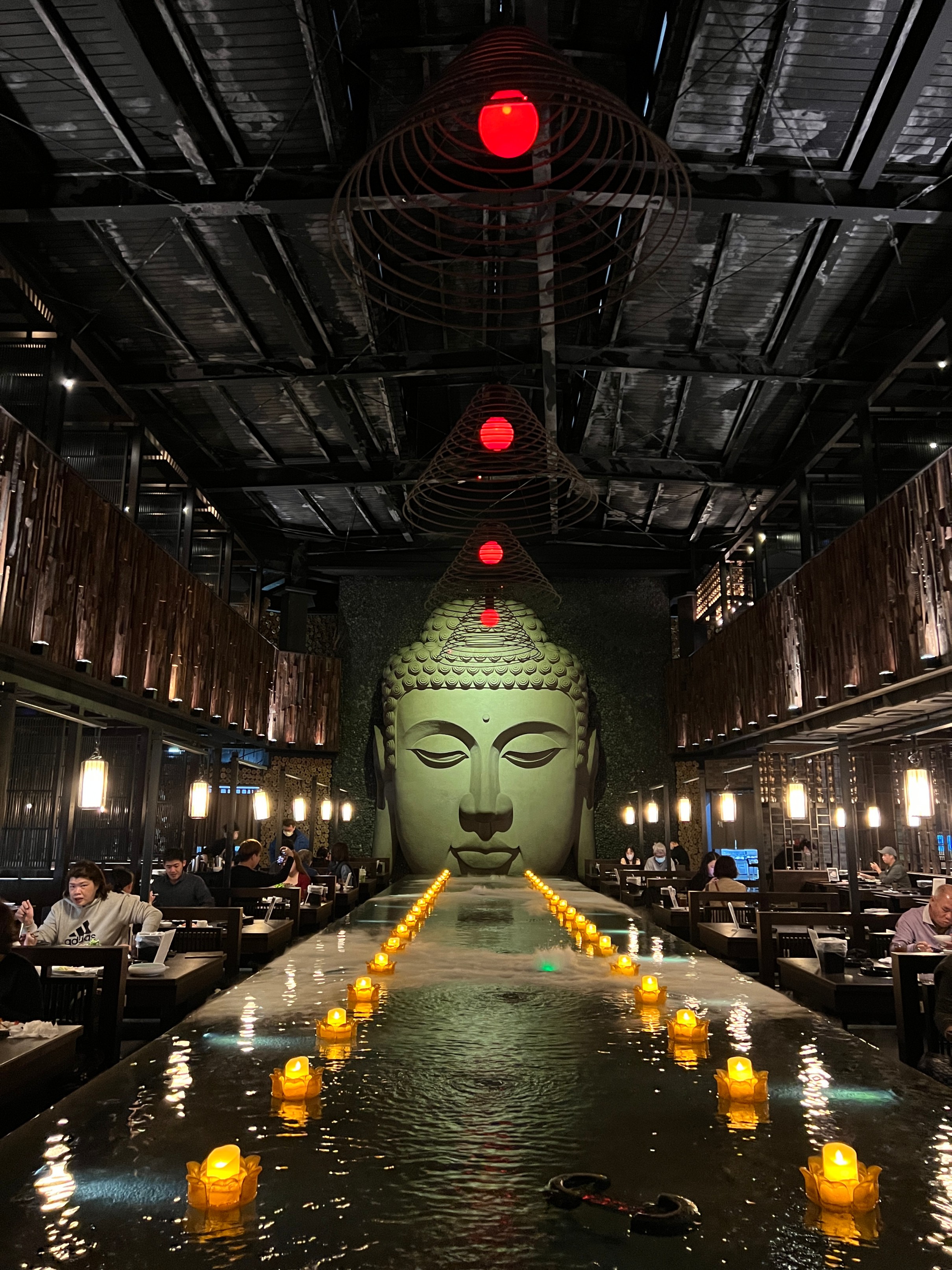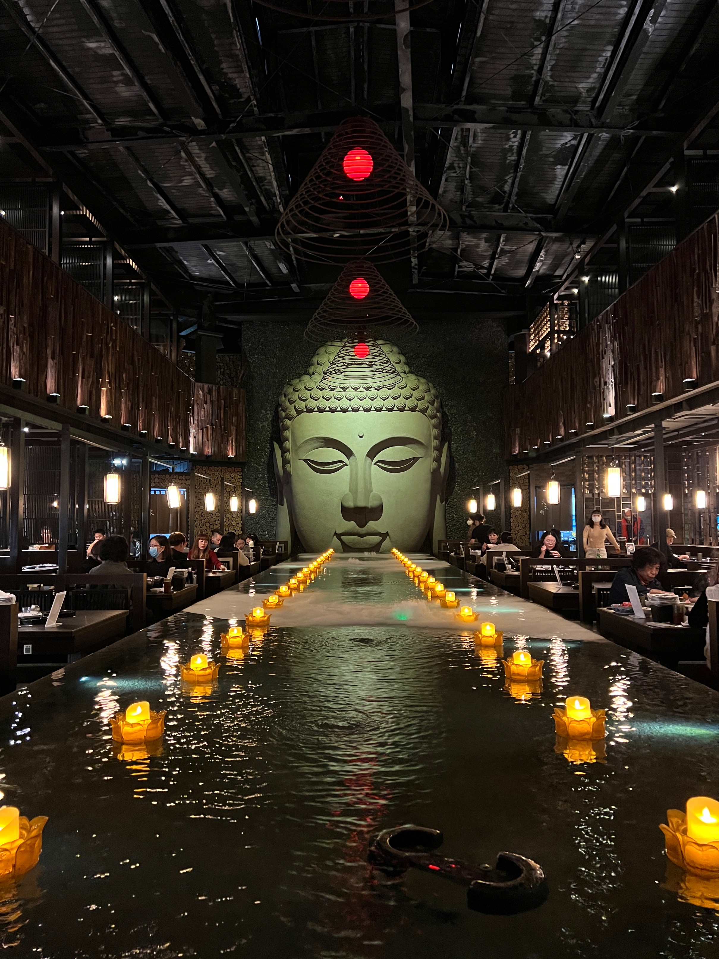 #천수모 #솜사탕스끼야끼 : 가오슝 맛집을 검색하면 제일 위에 나오는 곳 중에 하나인데, 개인적으로 매우 매우 만족했던 곳. 뭐 솔직히 스끼야끼 맛은 그냥 여기저기서 먹는 맛이랑 비슷한데 여기는 실내 인테리어가 진짜 엄청나다. 거대한 문이 열리면 바로 정면에 엄청나게 큰 불상 얼굴이 보이는데 일단 들어갈 때 웅장함에 압도된다. 실내 분위기는 대체로 엄숙하고 조용한 느낌인데, 가운데에 있는 물에서 안개도 피어오르고 해서 차분한 분위기가 좋다.
