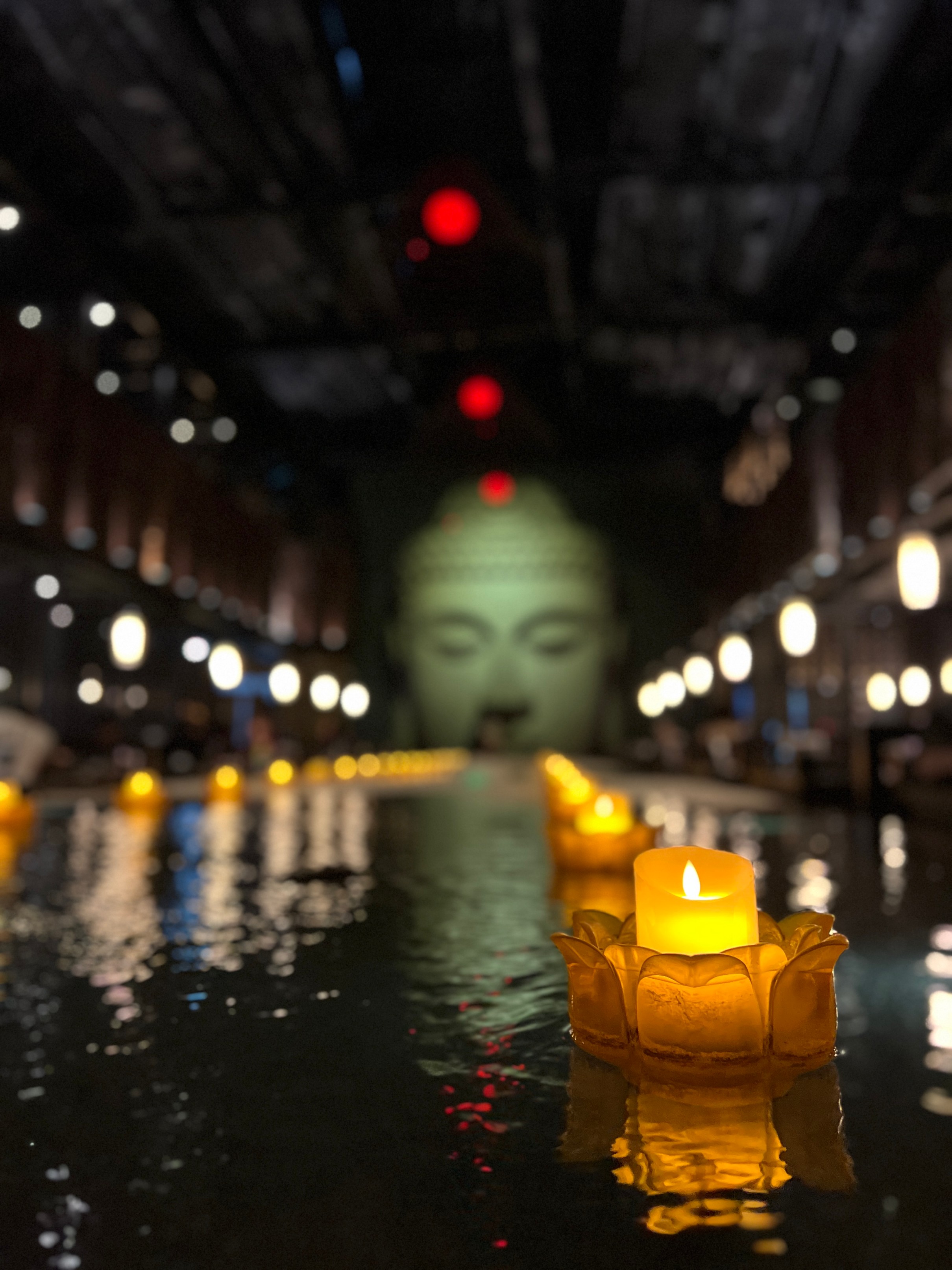 가운데에 물이 있는데 거기에 촛불이 켜져 있고, 저 뒤쪽으로 불상 얼굴이 크게 보이는데 뭔가 분위기가 압도적이면서 멋지다.