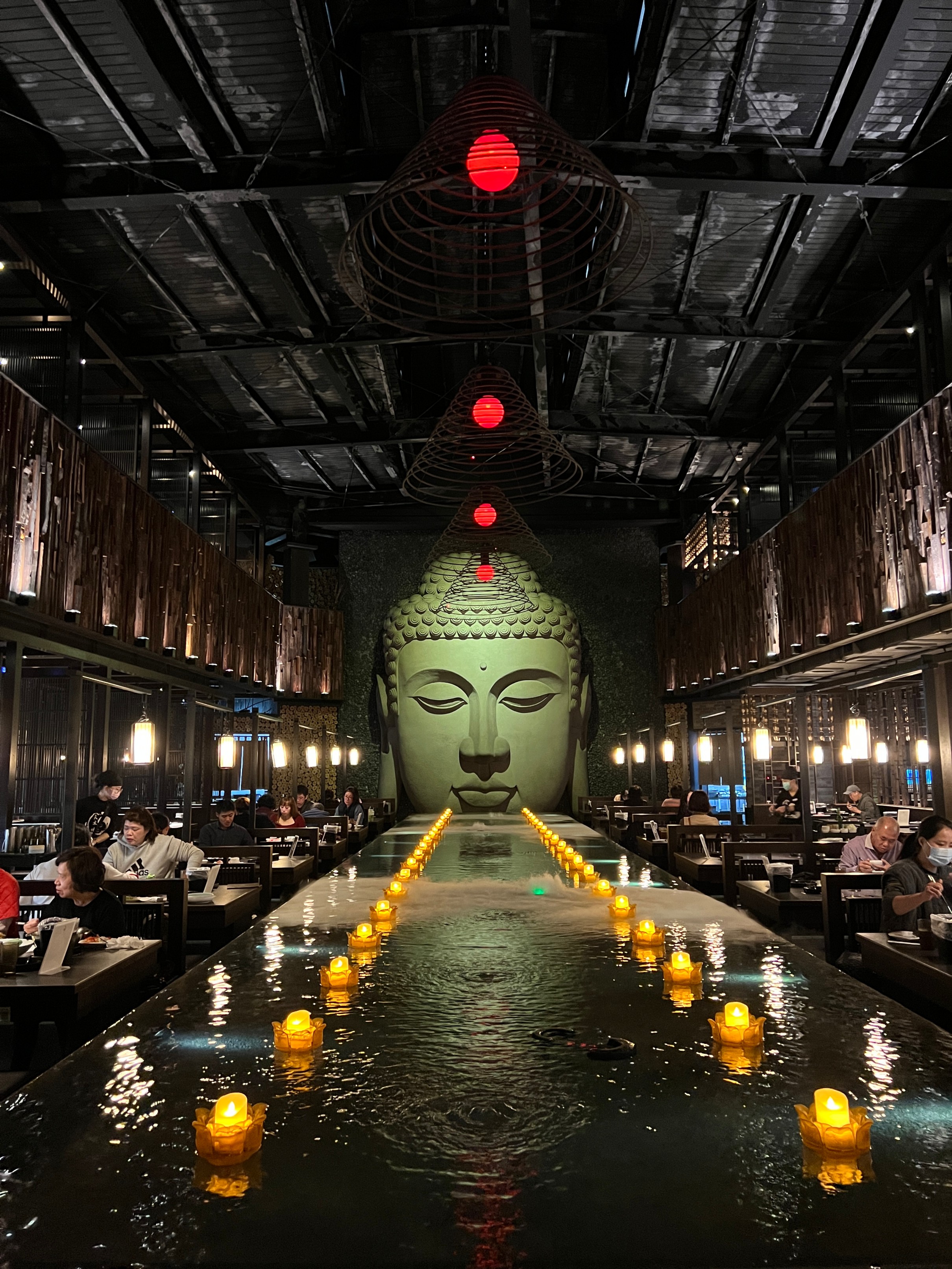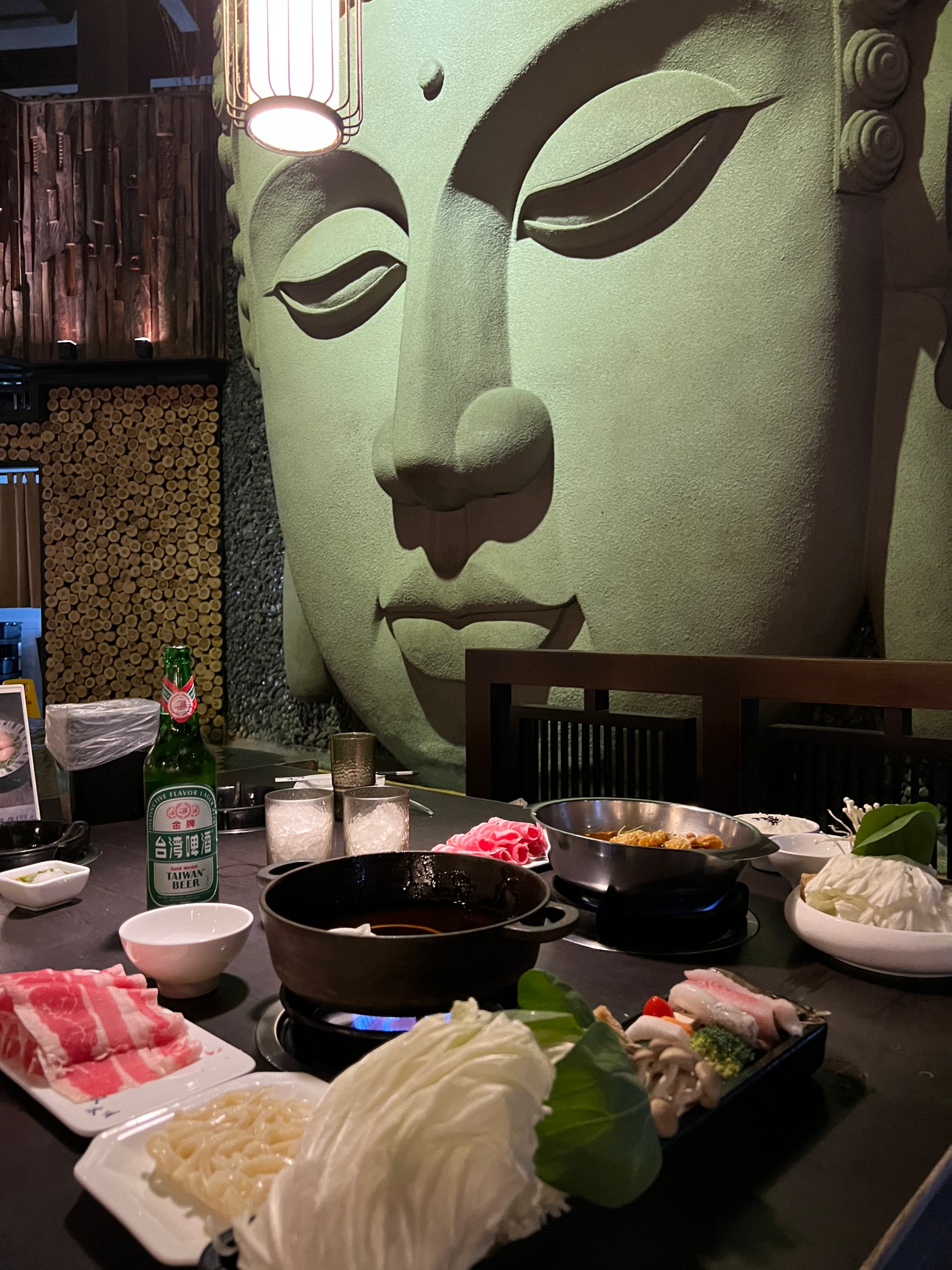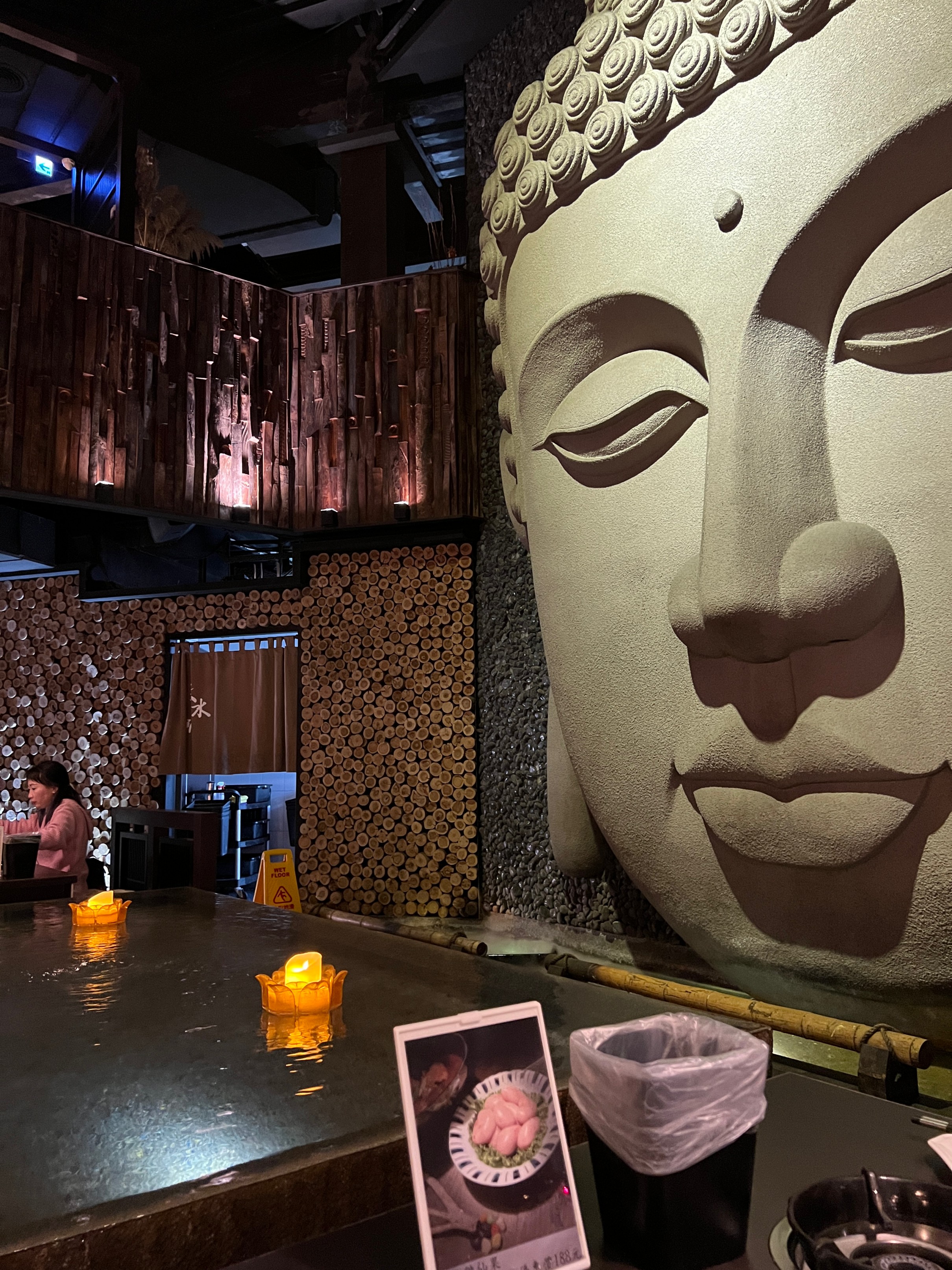 #천수모 #솜사탕스끼야끼 : 가오슝 맛집을 검색하면 제일 위에 나오는 곳 중에 하나인데, 개인적으로 매우 매우 만족했던 곳. 뭐 솔직히 스끼야끼 맛은 그냥 여기저기서 먹는 맛이랑 비슷한데 여기는 실내 인테리어가 진짜 엄청나다. 거대한 문이 열리면 바로 정면에 엄청나게 큰 불상 얼굴이 보이는데 일단 들어갈 때 웅장함에 압도된다. 실내 분위기는 대체로 엄숙하고 조용한 느낌인데, 가운데에 있는 물에서 안개도 피어오르고 해서 차분한 분위기가 좋다.