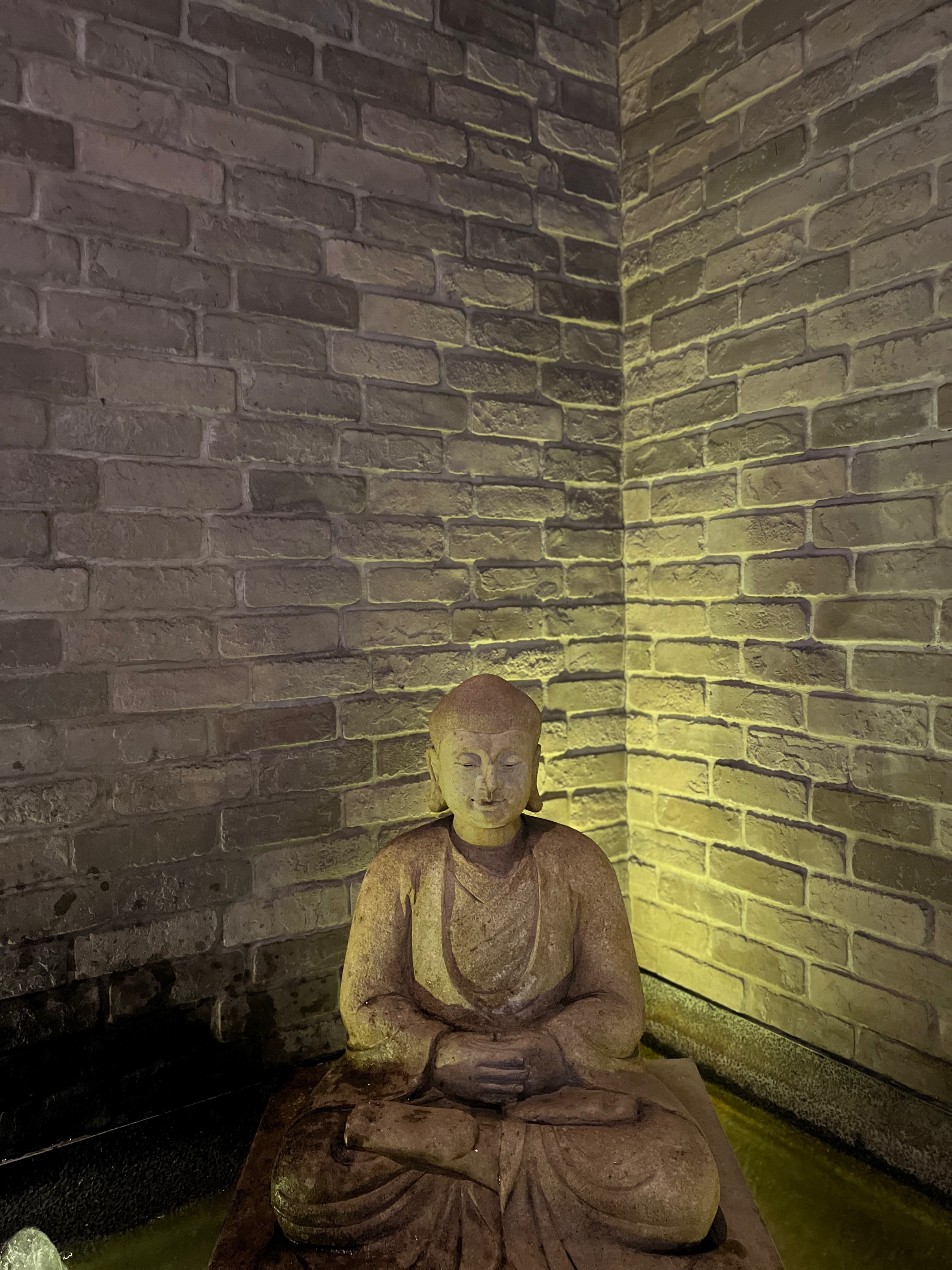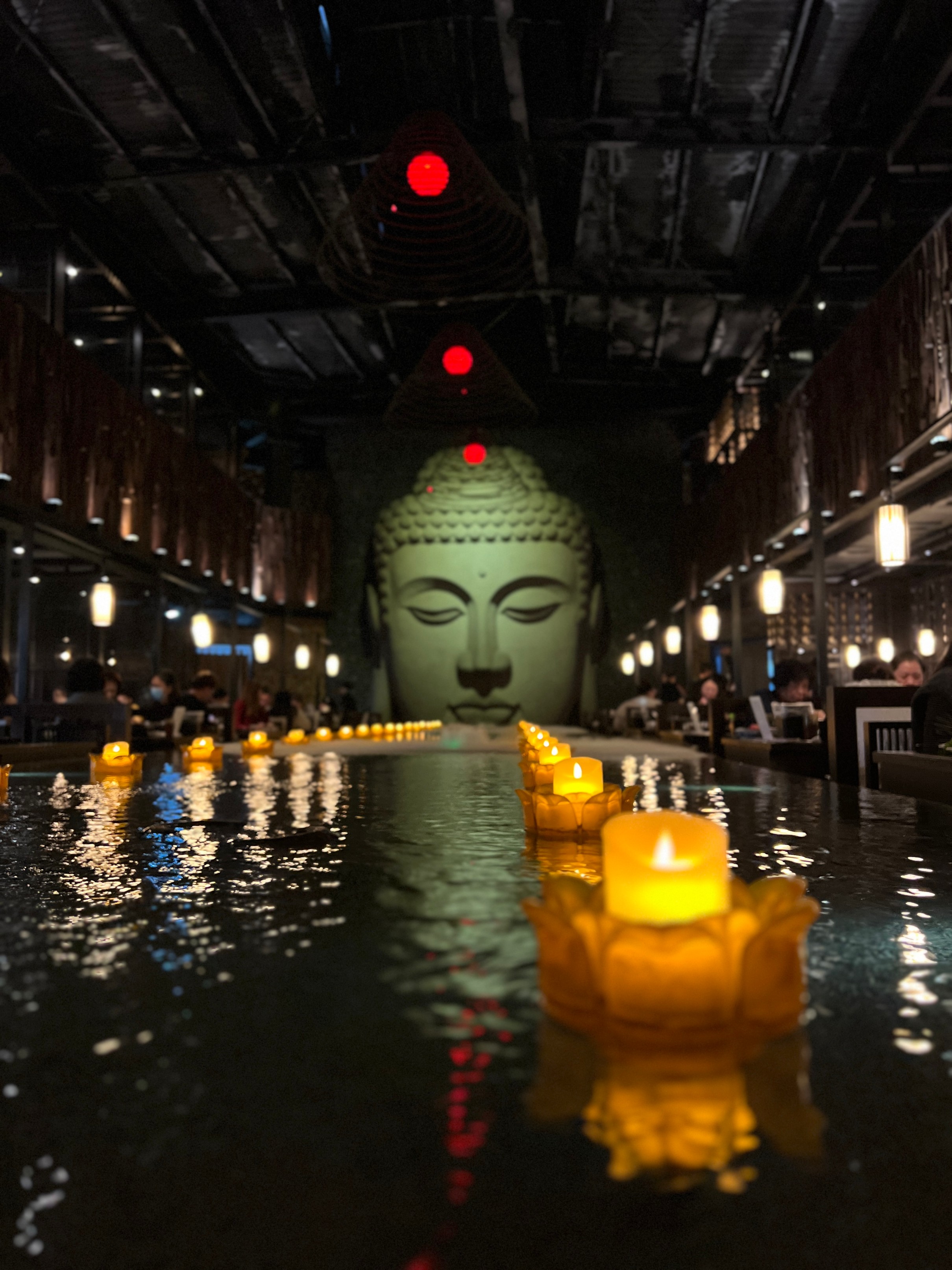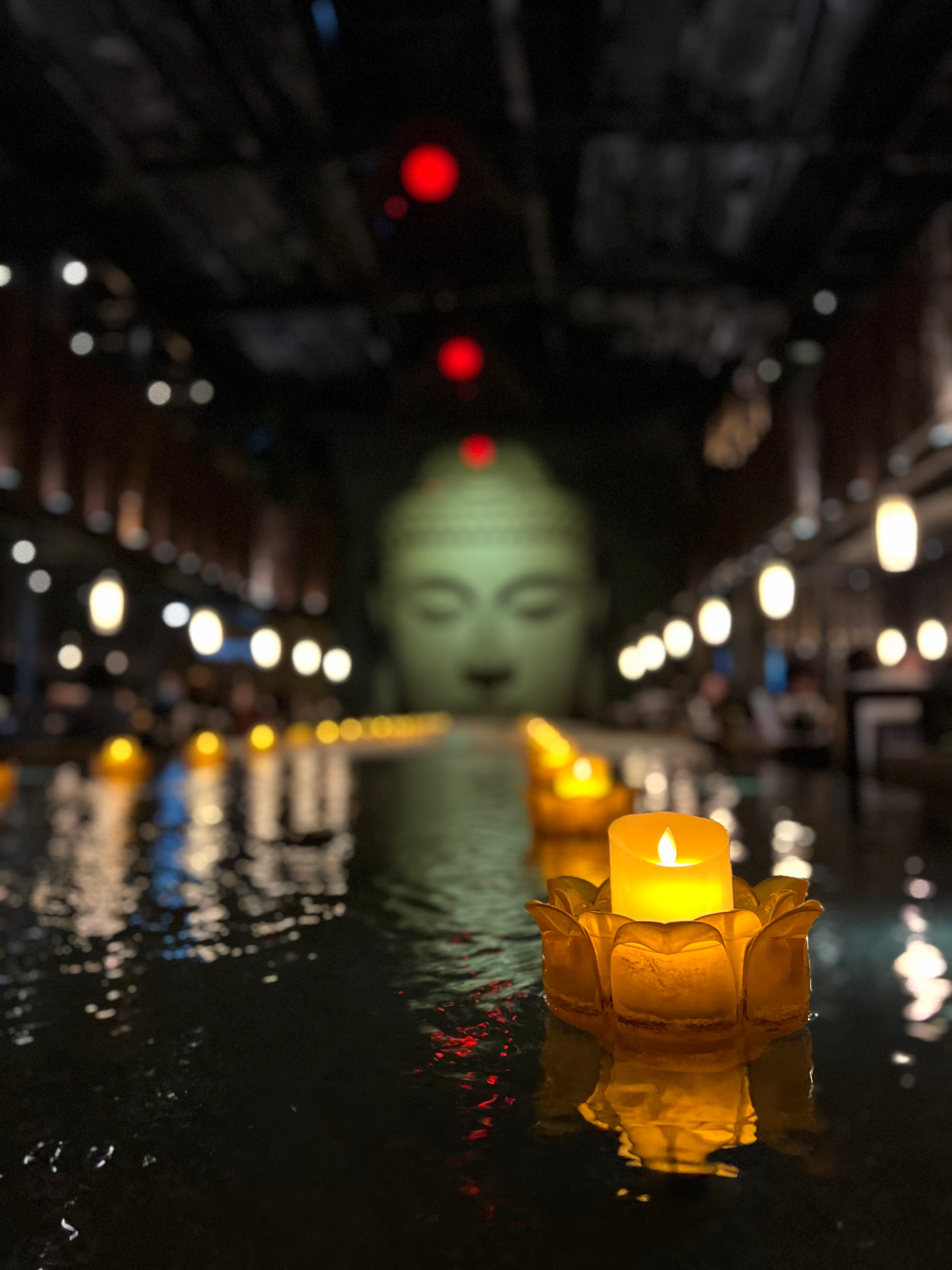 가운데에 물이 있는데 거기에 촛불이 켜져 있고, 저 뒤쪽으로 불상 얼굴이 크게 보이는데 뭔가 분위기가 압도적이면서 멋지다.