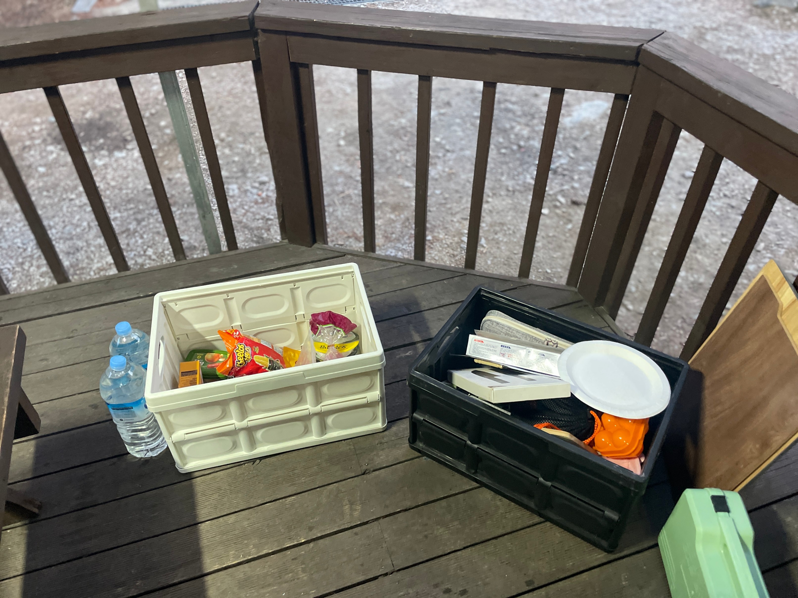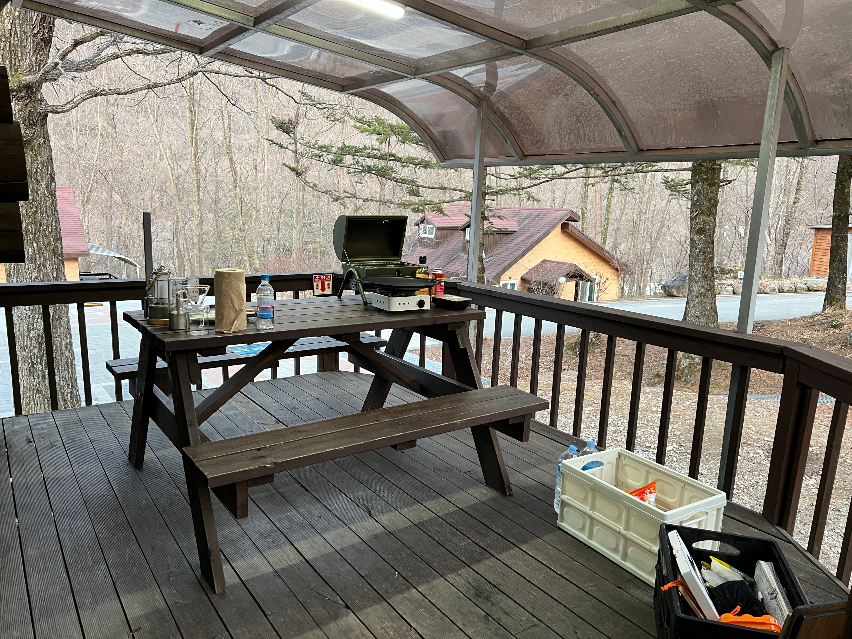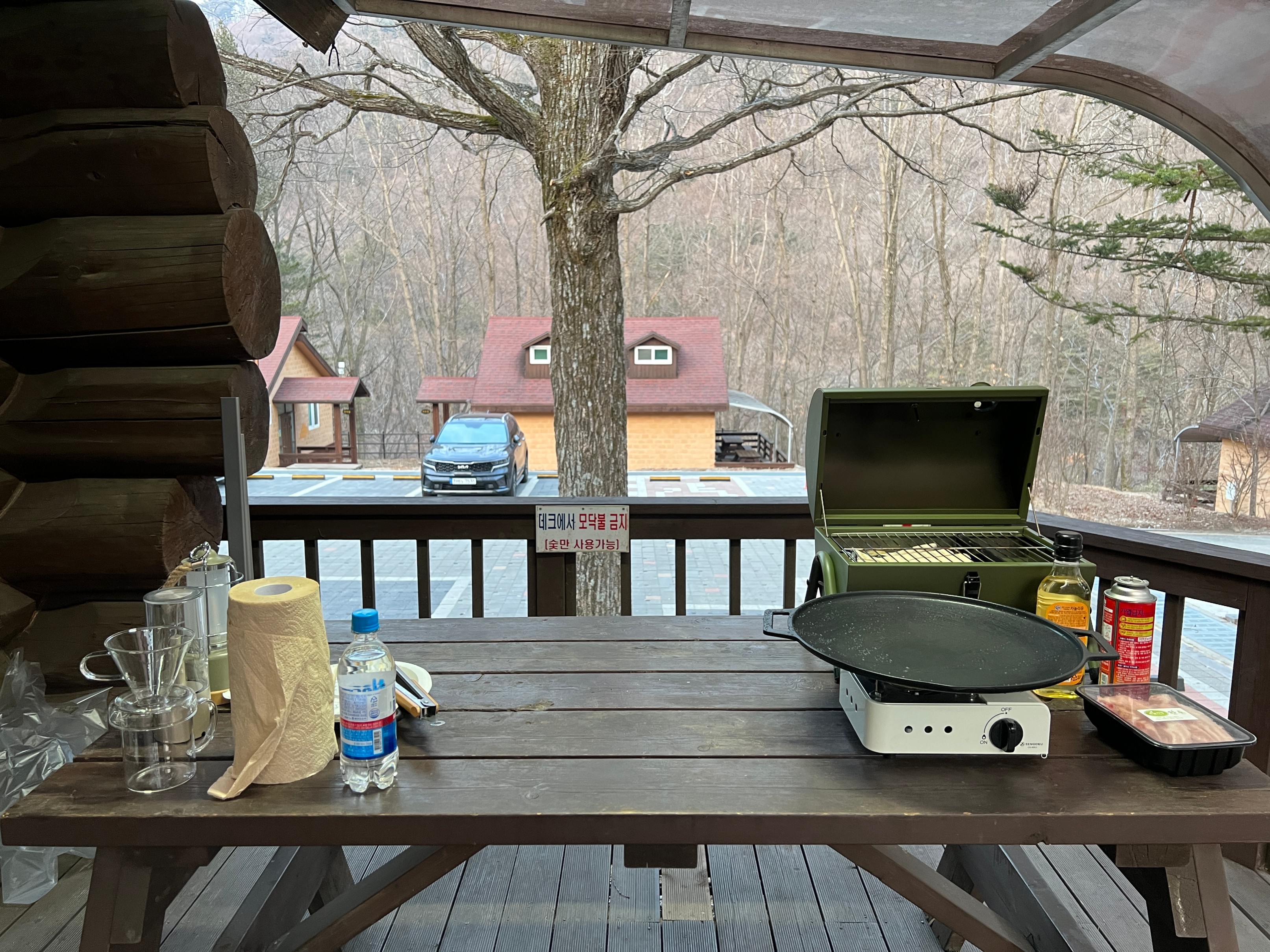 통나무집 앞에는 이렇게 작은 테라스가 있고 테이블이 있어서 별도의 장비들 없이도 여기서 캠핑을 즐길 수 있다.