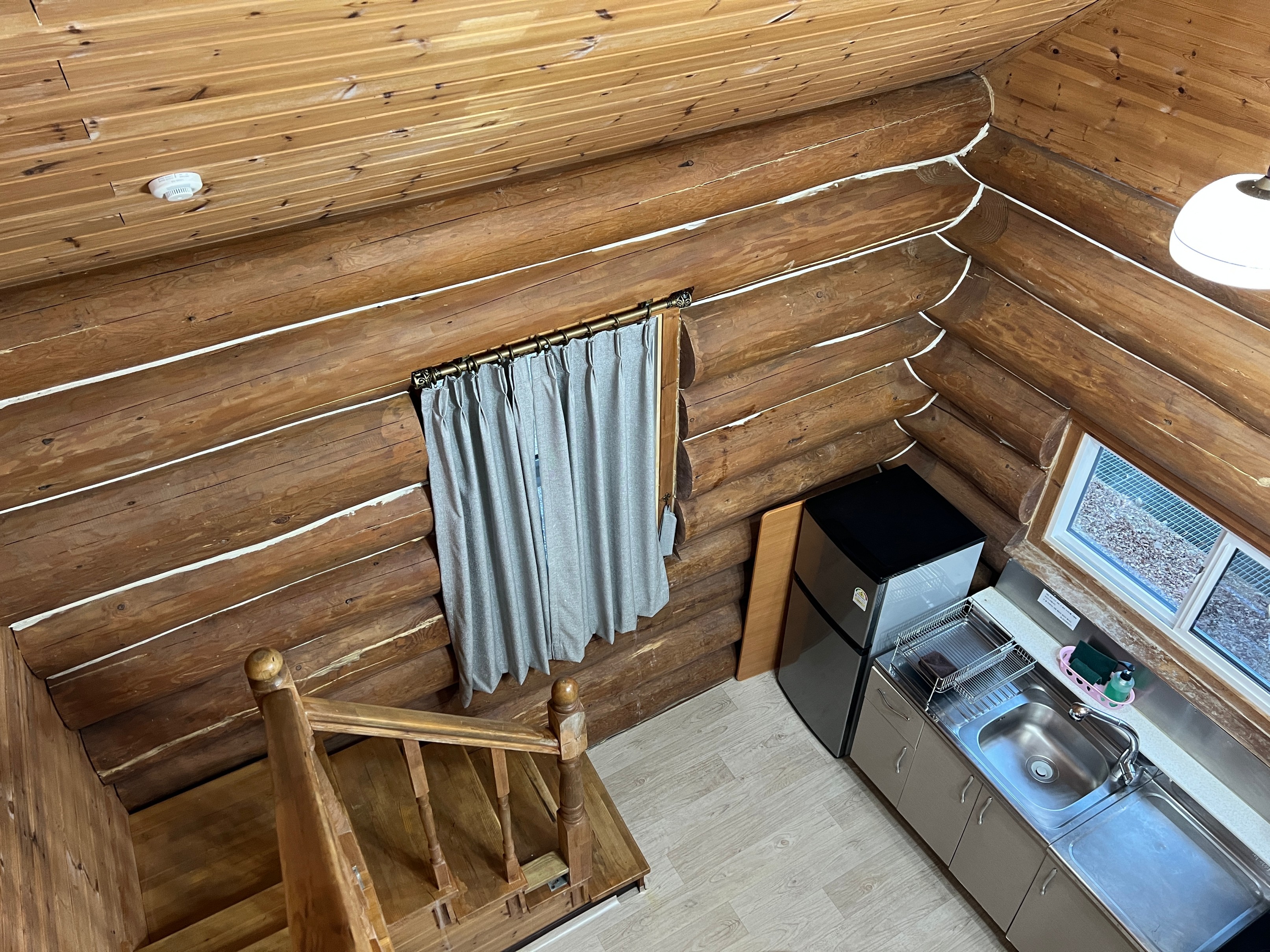 내가 예약한 곳은 '머루동'이라는 곳이었는데 이런 통나무집이 머루, 담비, 여우, 다래, 원추리로 총 5개가 있고 4인용이 있고 6인용이 있다. 내가 예약한 곳은 4인용이고 복층으로 되어 있는 구조였다.