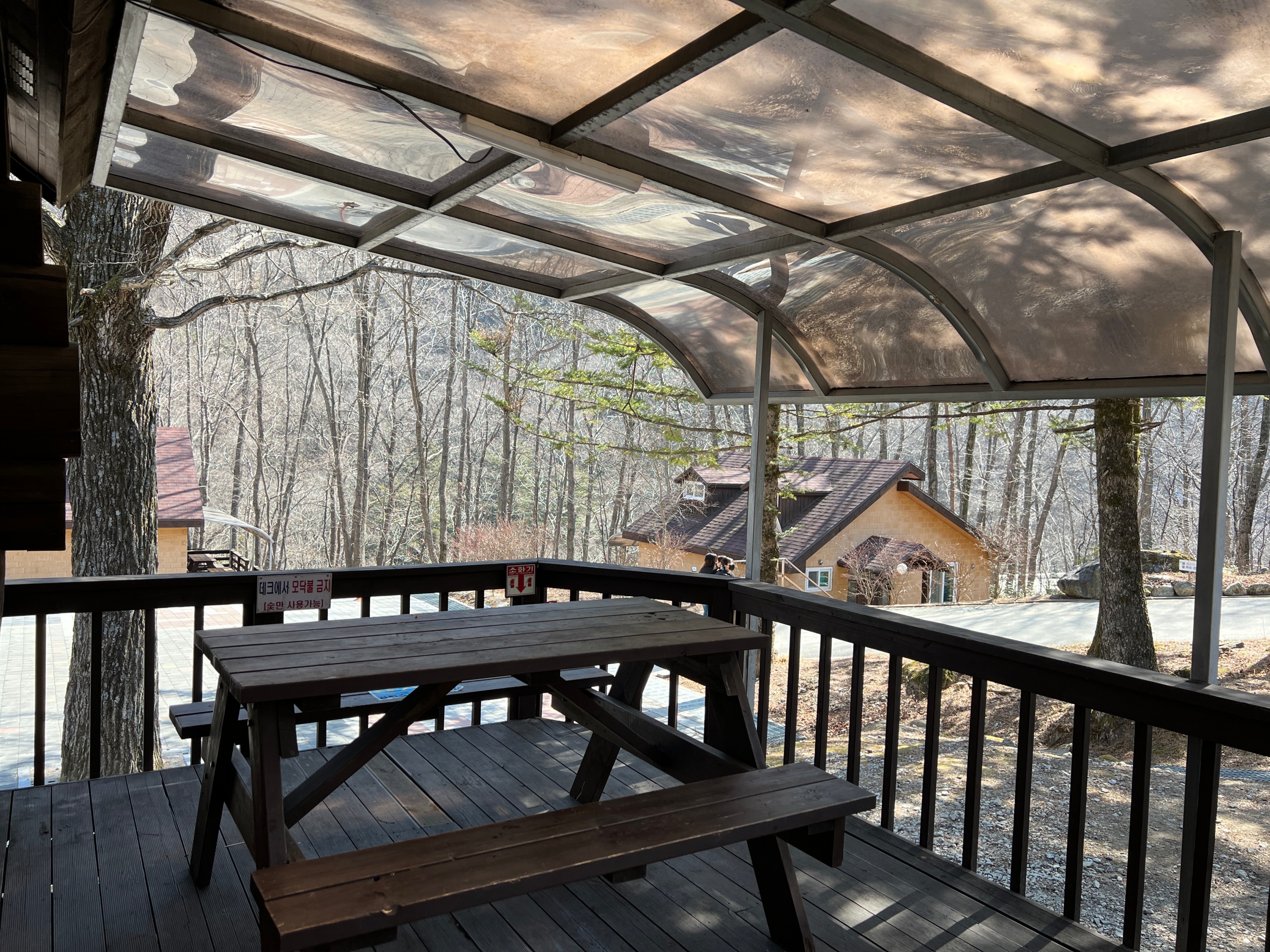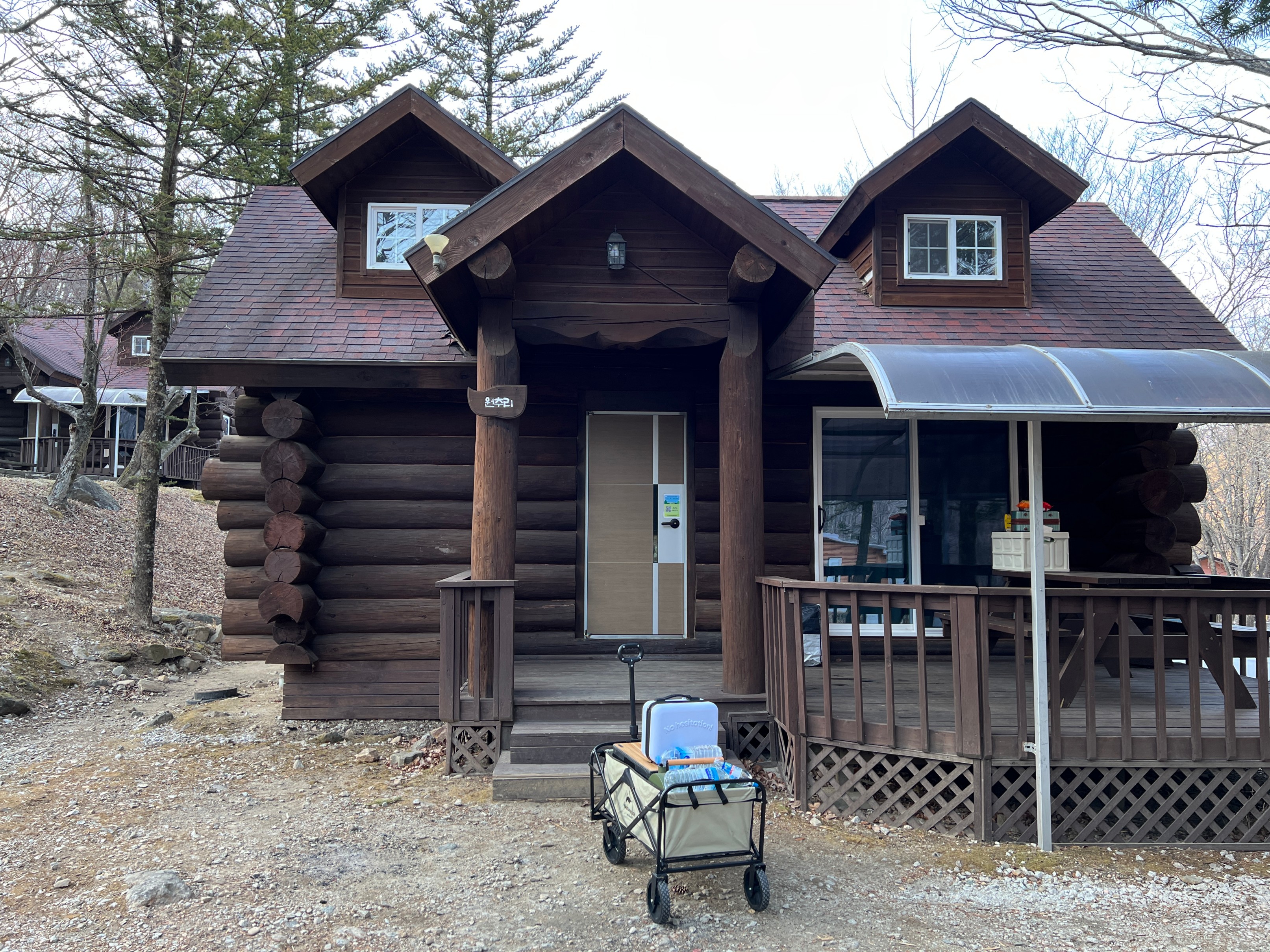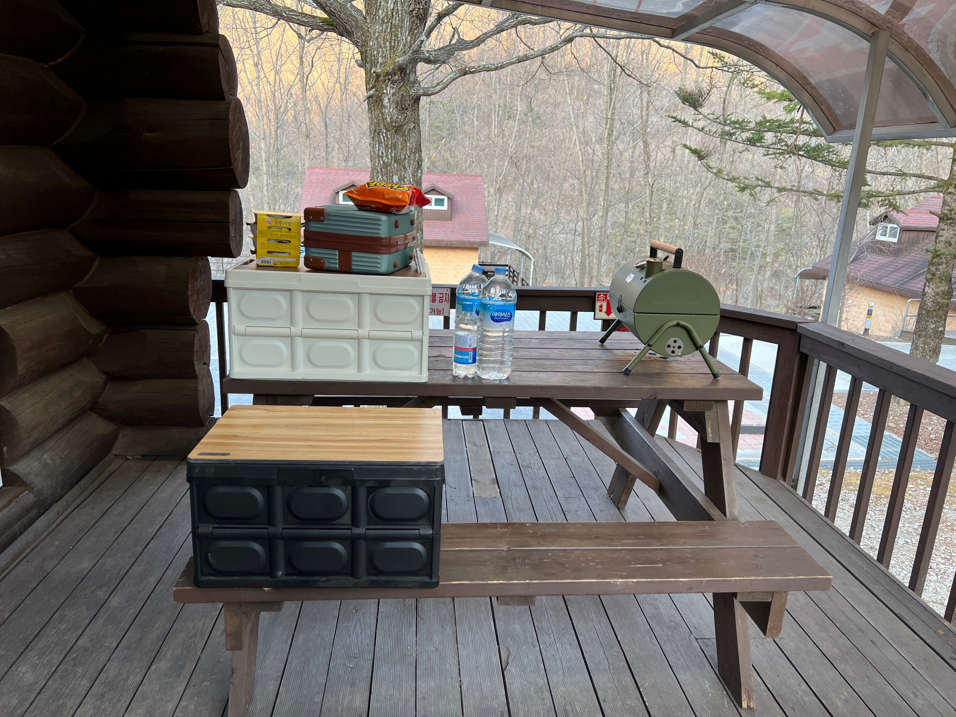 통나무집 앞에는 이렇게 작은 테라스가 있고 테이블이 있어서 별도의 장비들 없이도 여기서 캠핑을 즐길 수 있다.