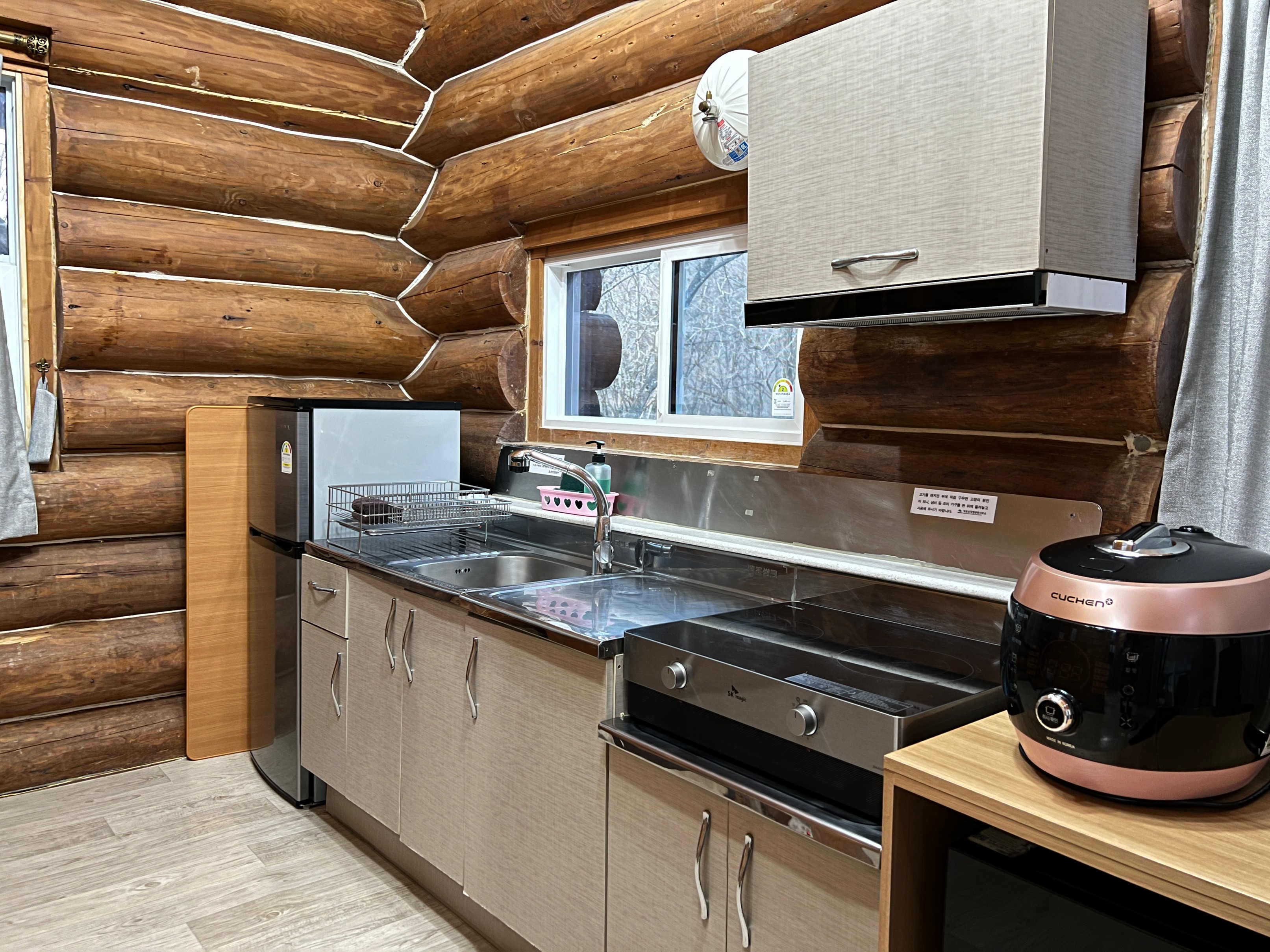 내가 예약한 곳은 '머루동'이라는 곳이었는데 이런 통나무집이 머루, 담비, 여우, 다래, 원추리로 총 5개가 있고 4인용이 있고 6인용이 있다. 내가 예약한 곳은 4인용이고 복층으로 되어 있는 구조였다.